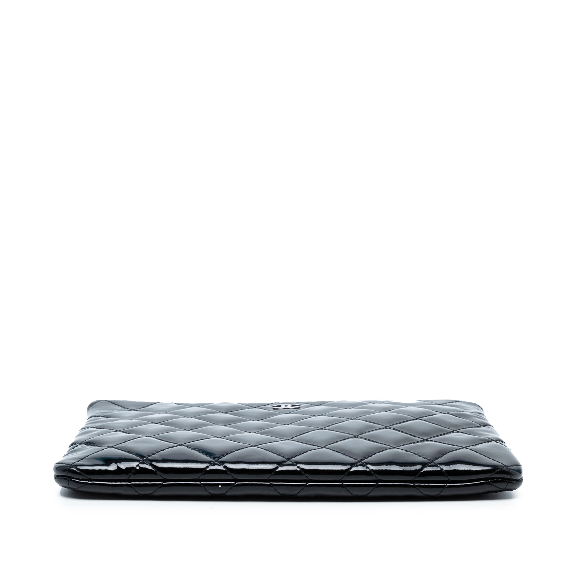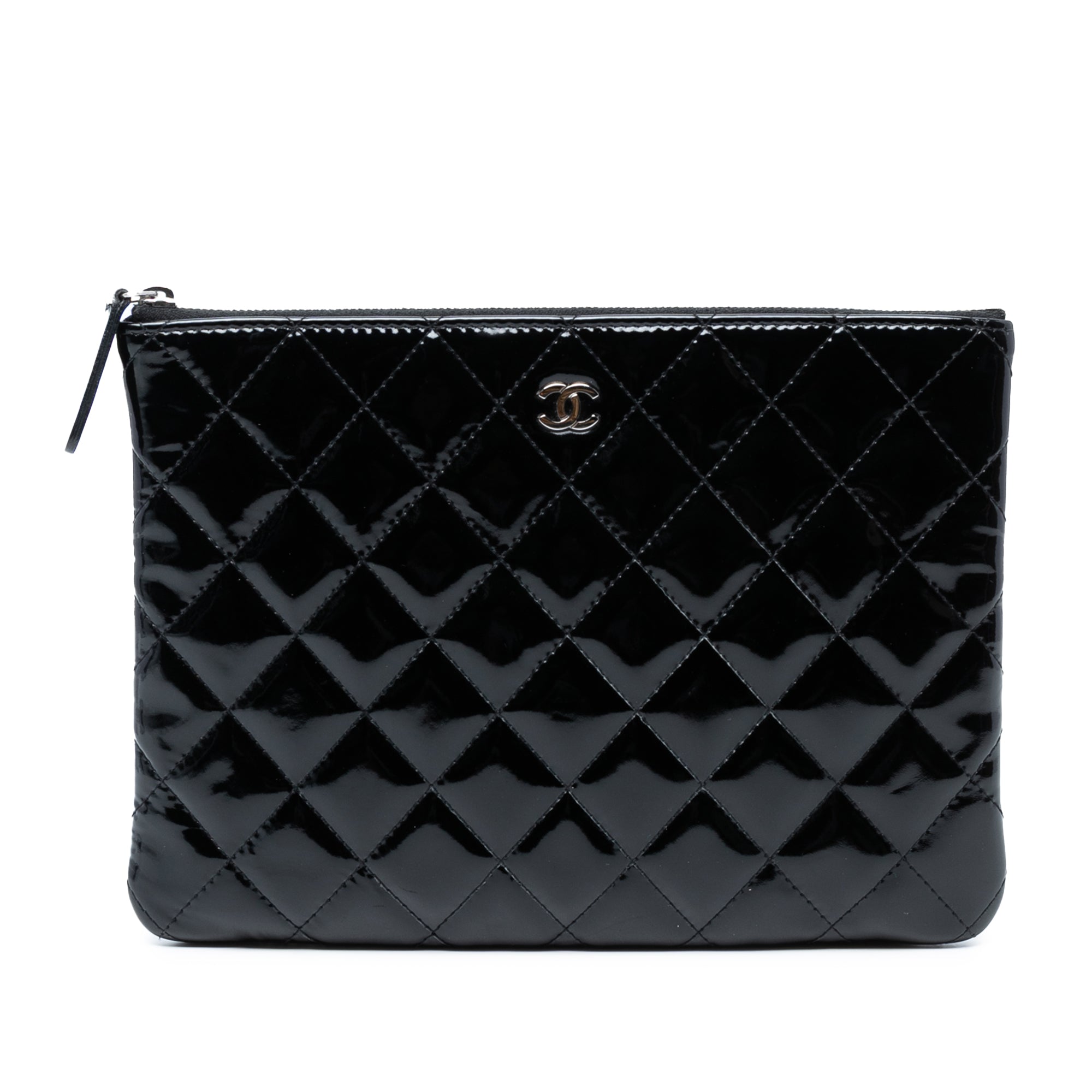 This clutch bag features a quilted patent leather body and a top zip closure. Retail Price: 2400.00