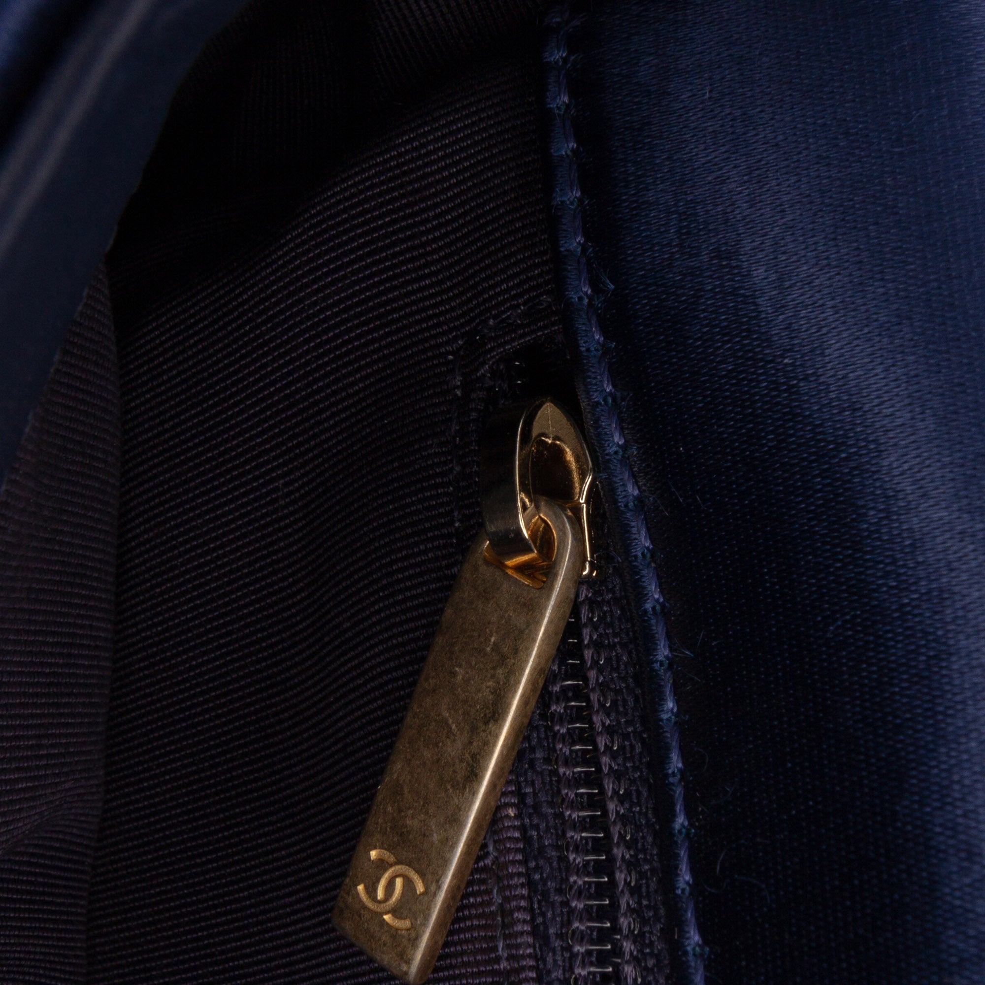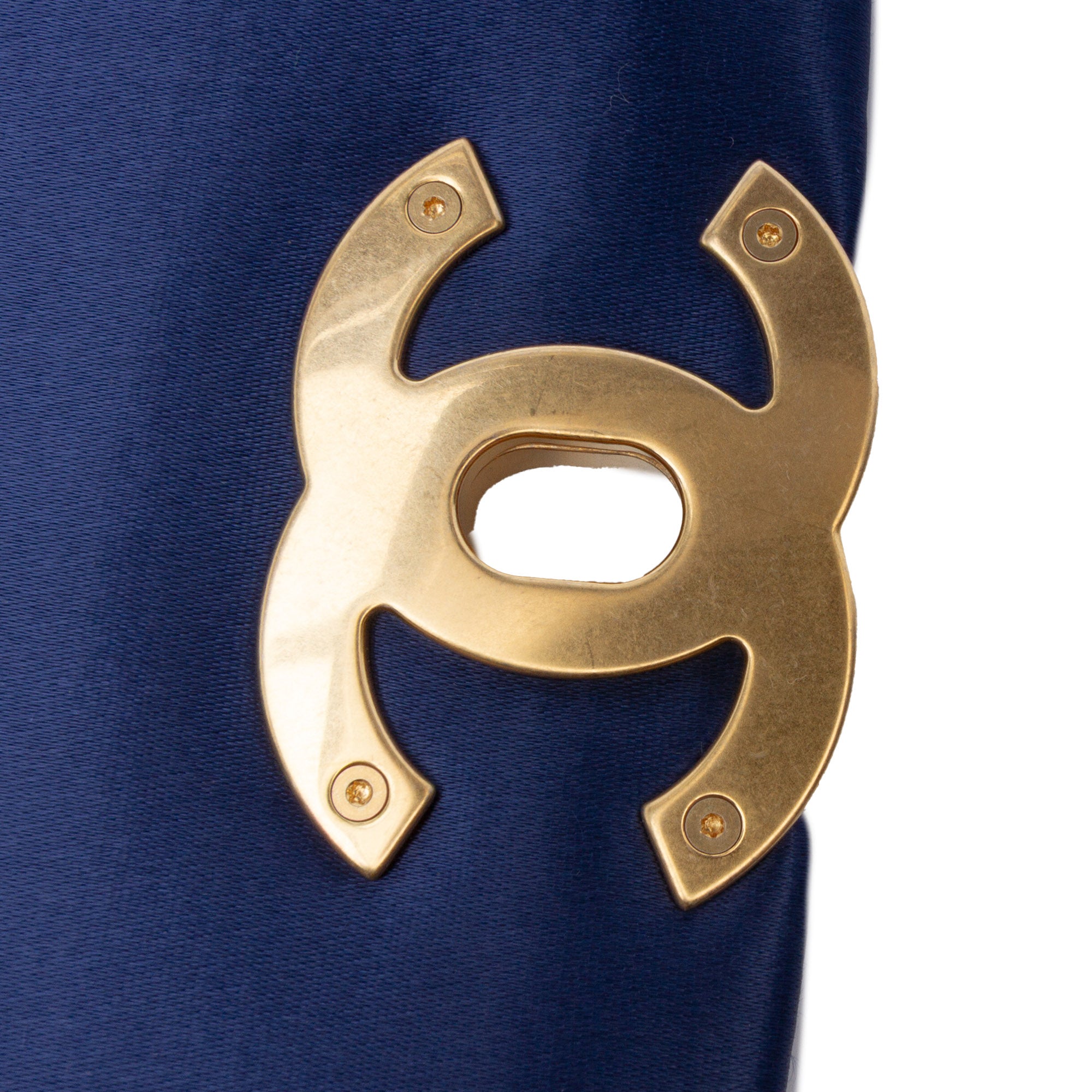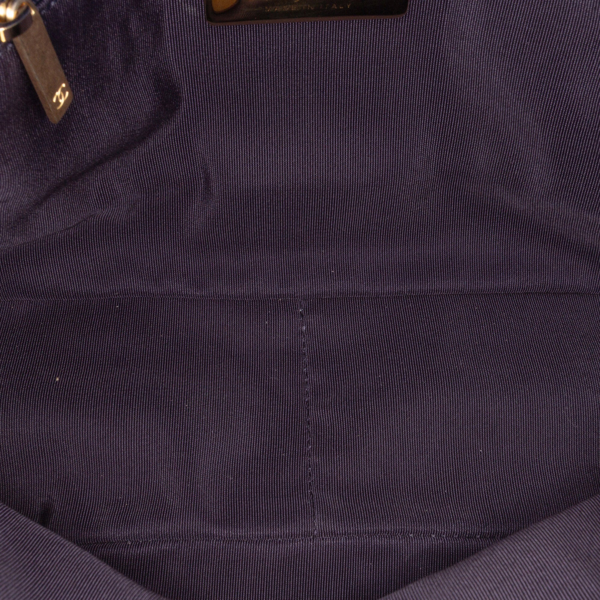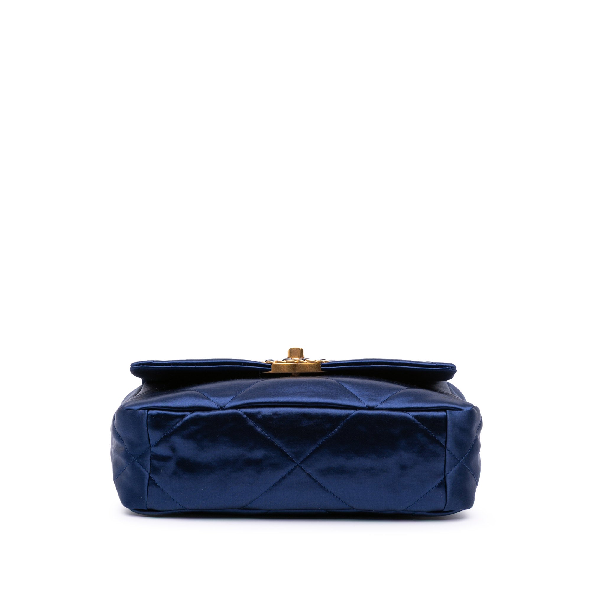 The Medium 19 Flap bag features a quilted satin body, a chain handle, a leather-woven chain shoulder strap, a flap with a CC twist lock closure, an exterior slip pocket, and an interior zip pocket. Retail Price: 6400.00