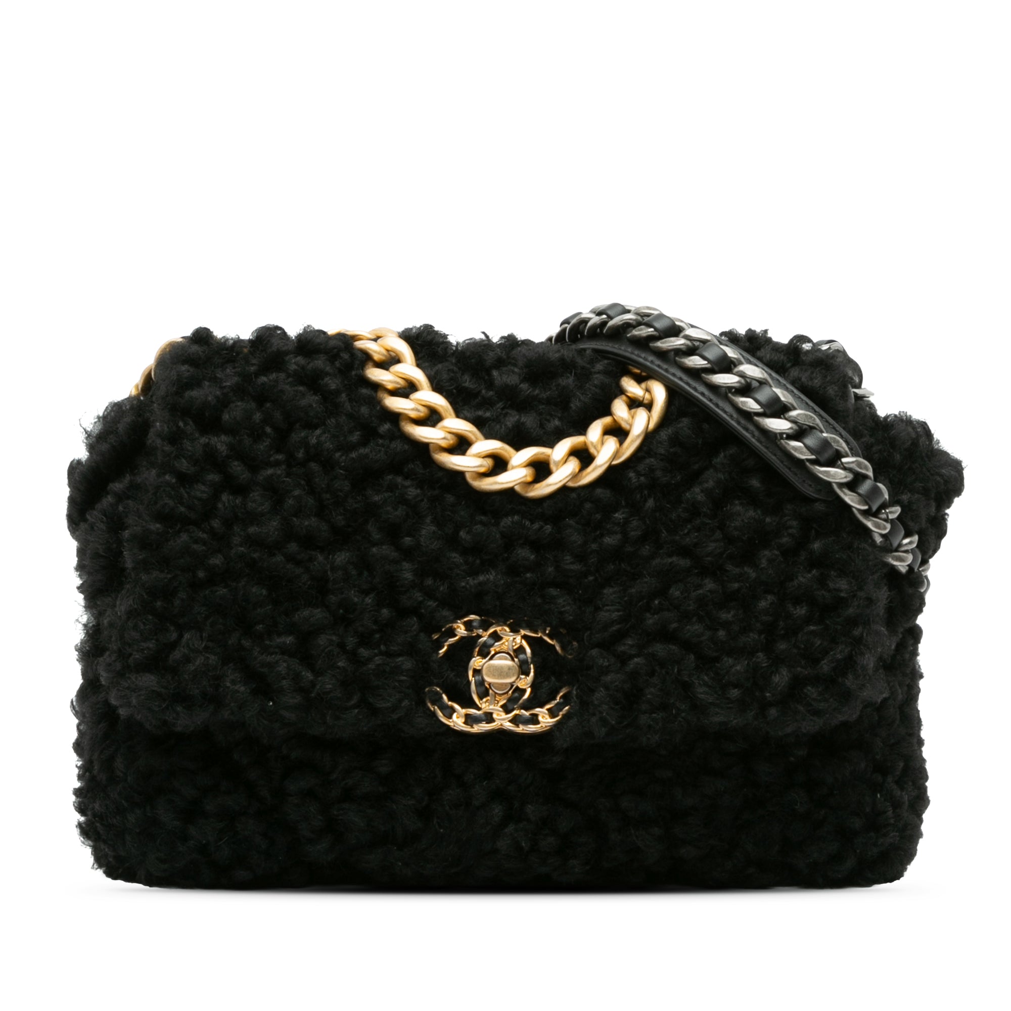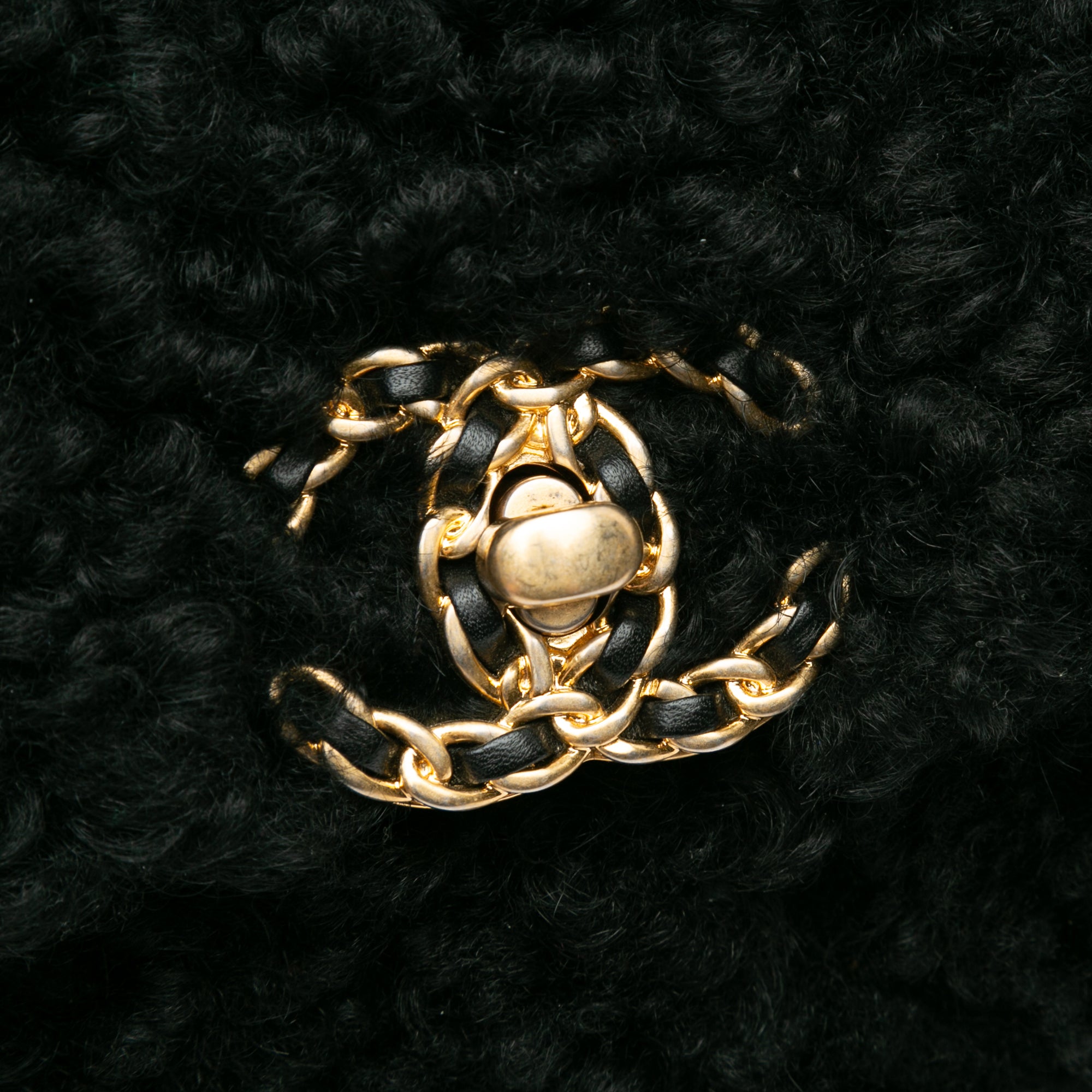 This satchel features a shearling body, a gold-tone chain link handle, a leather woven chain link shoulder strap, a front flap with twist-lock closure, an exterior back slip pocket, and an interior zip pocket. Inclusion: authenticity card. Retail Price: 5600.00