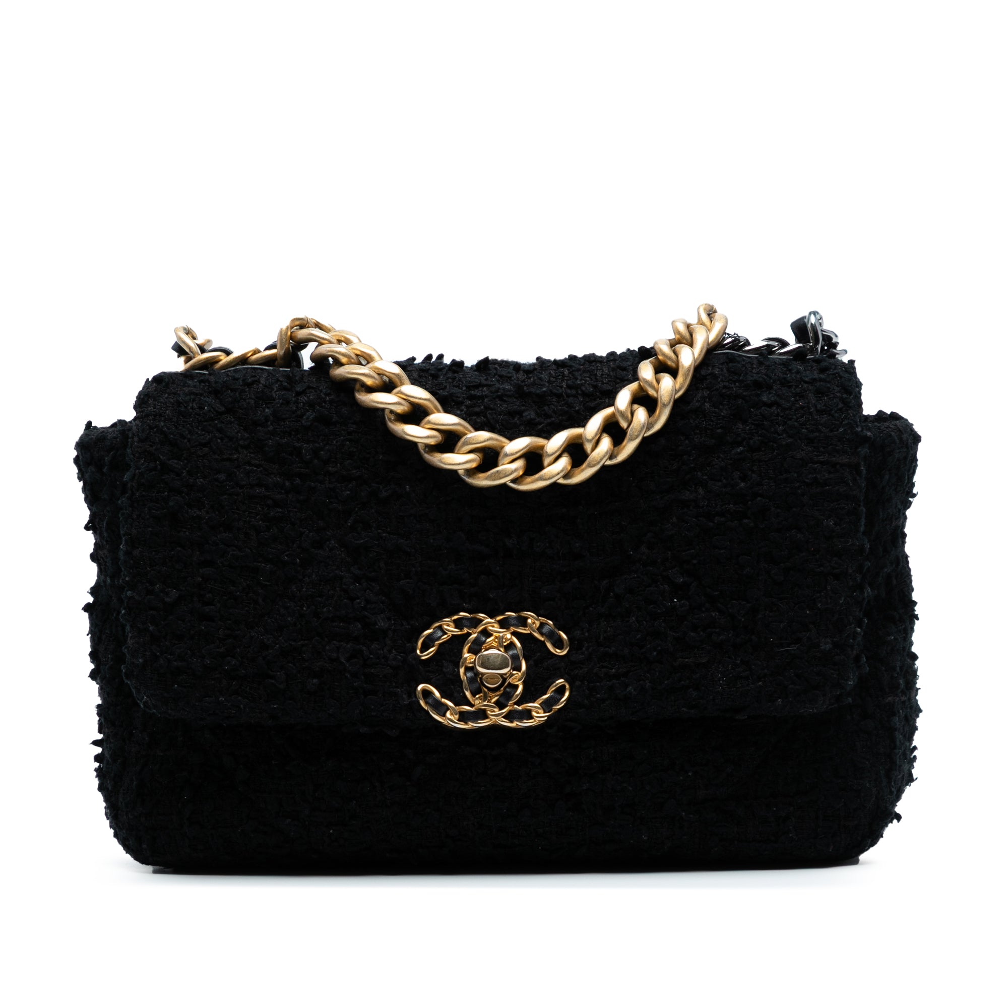 The 19 Flap features a tweed body, a chain link handle, a leather woven-in chain strap with a leather shoulder guard, a front flap with chain CC logo turn lock closure, and interior zip and slip pockets. Inclusion: authenticity card. Retail Price: 6080.00