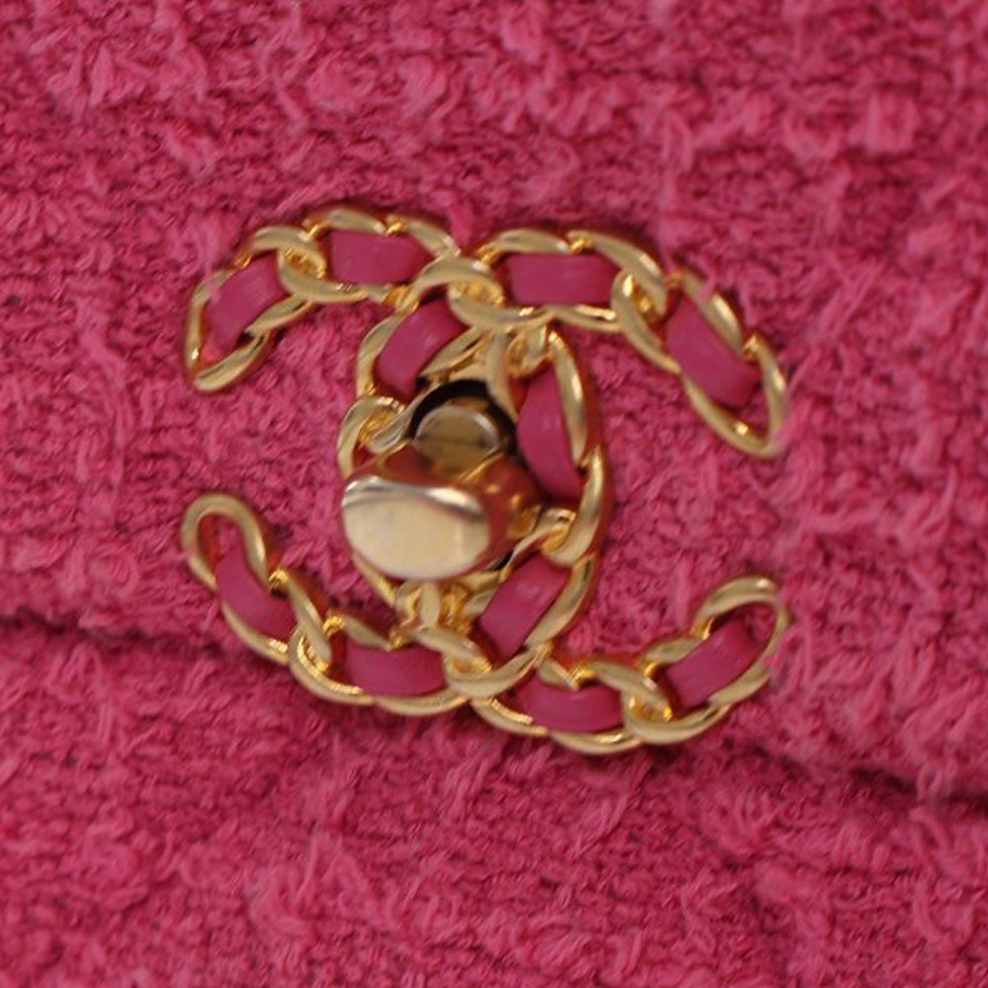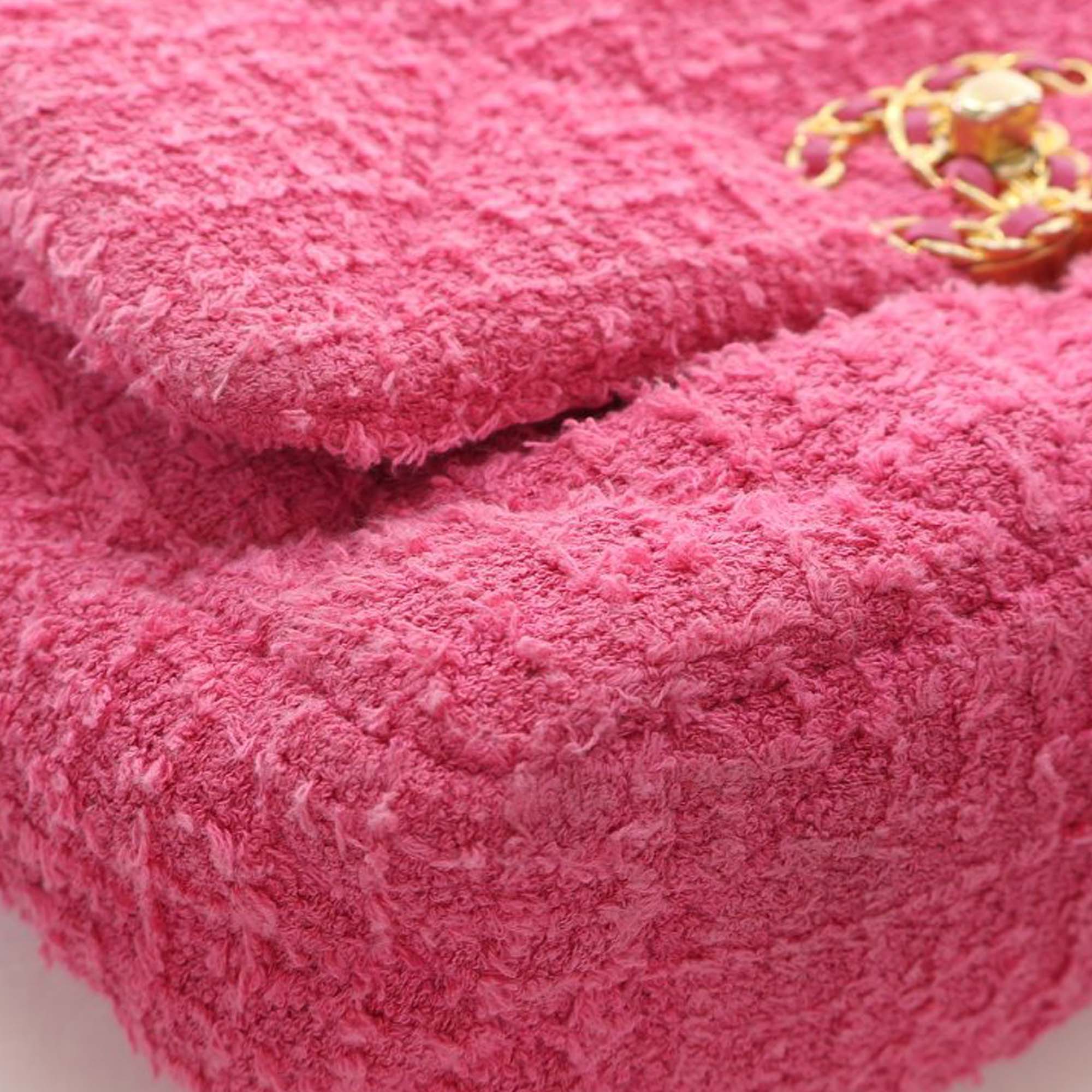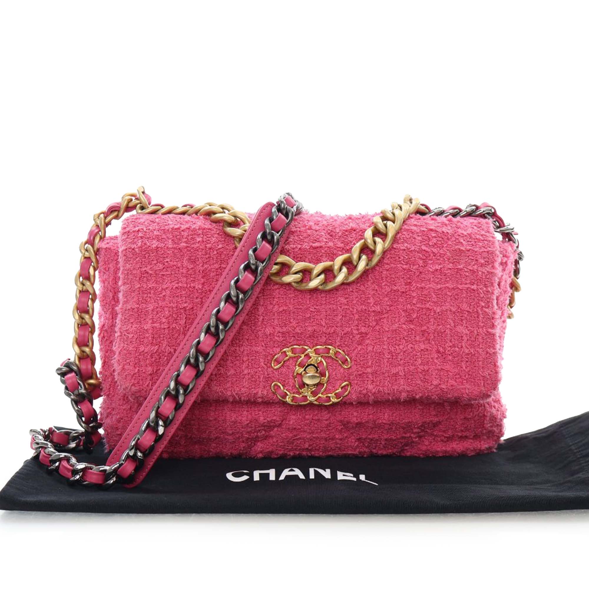 The 19 Flap bag features a tweed leather body, a gold-tone chain handle, a woven leather chain shoulder strap, a flap with a CC twist lock closure, an exterior slip pocket, and an interior zip pocket. Inclusion: Dust bag. Retail Price: 7203.00