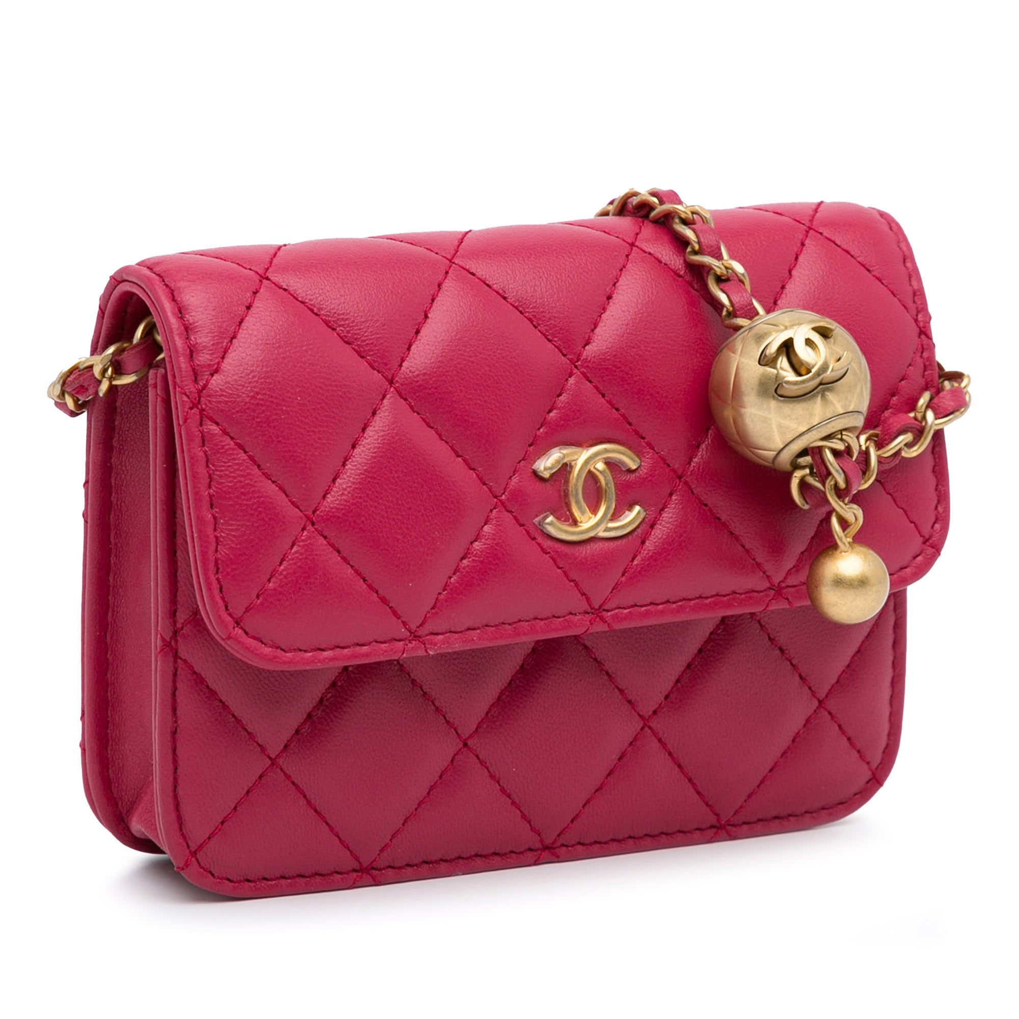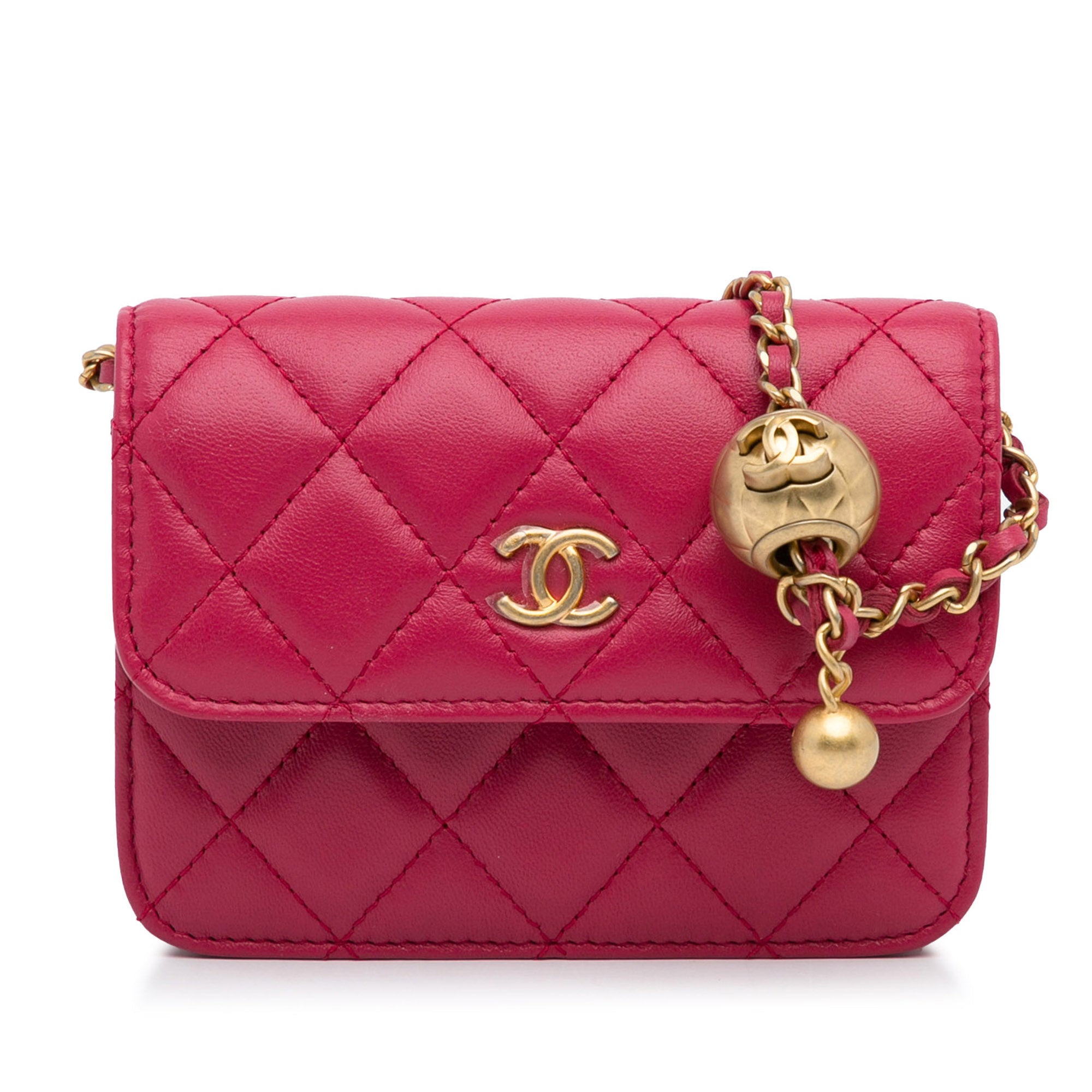 The Pearl Crush shoulder bag features a quilted lambskin leather body, a leather-woven chain strap with ball details, and a top flap with interlocking CC and magnetic snap button closure. Inclusion: Dust bag, box. Retail Price: 4500.00