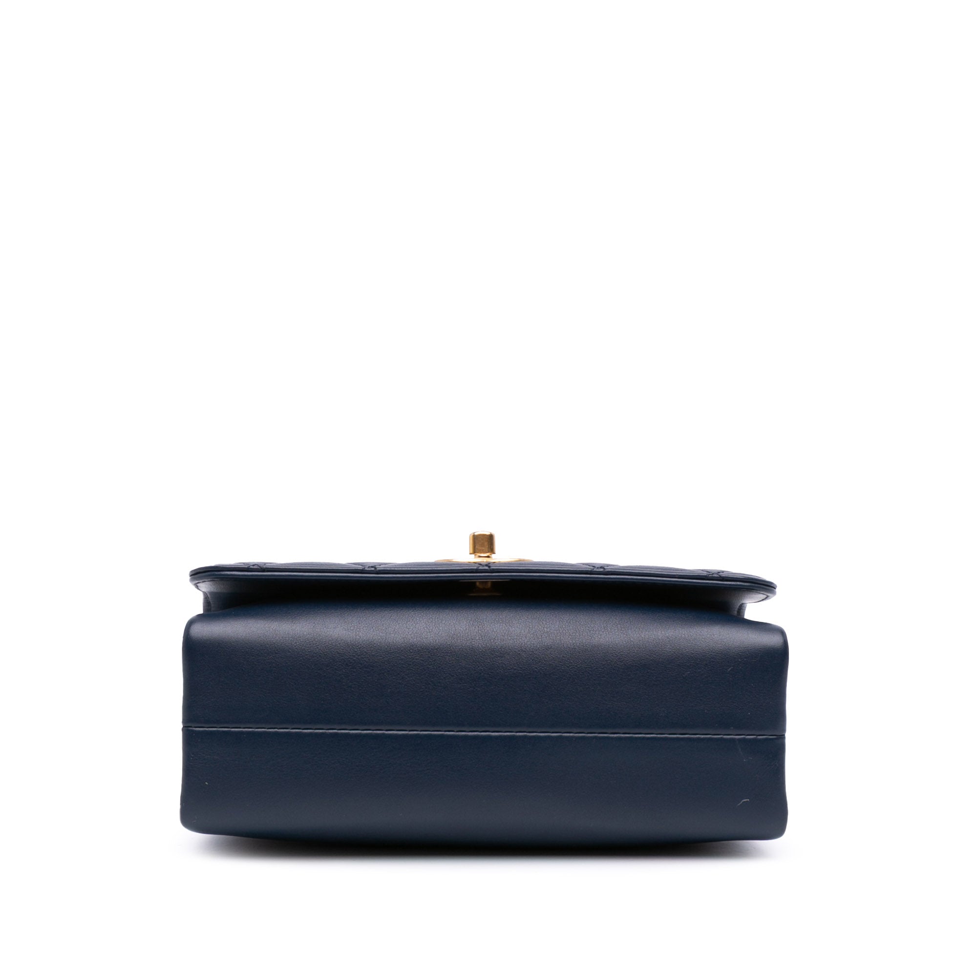 This satchel features a quilted lambskin leather, gold-tone chain handle with pearls, a leather-woven chain strap, a front flap with CC turn lock closure, and an interior slip pocket. Retail Price: 5250.00