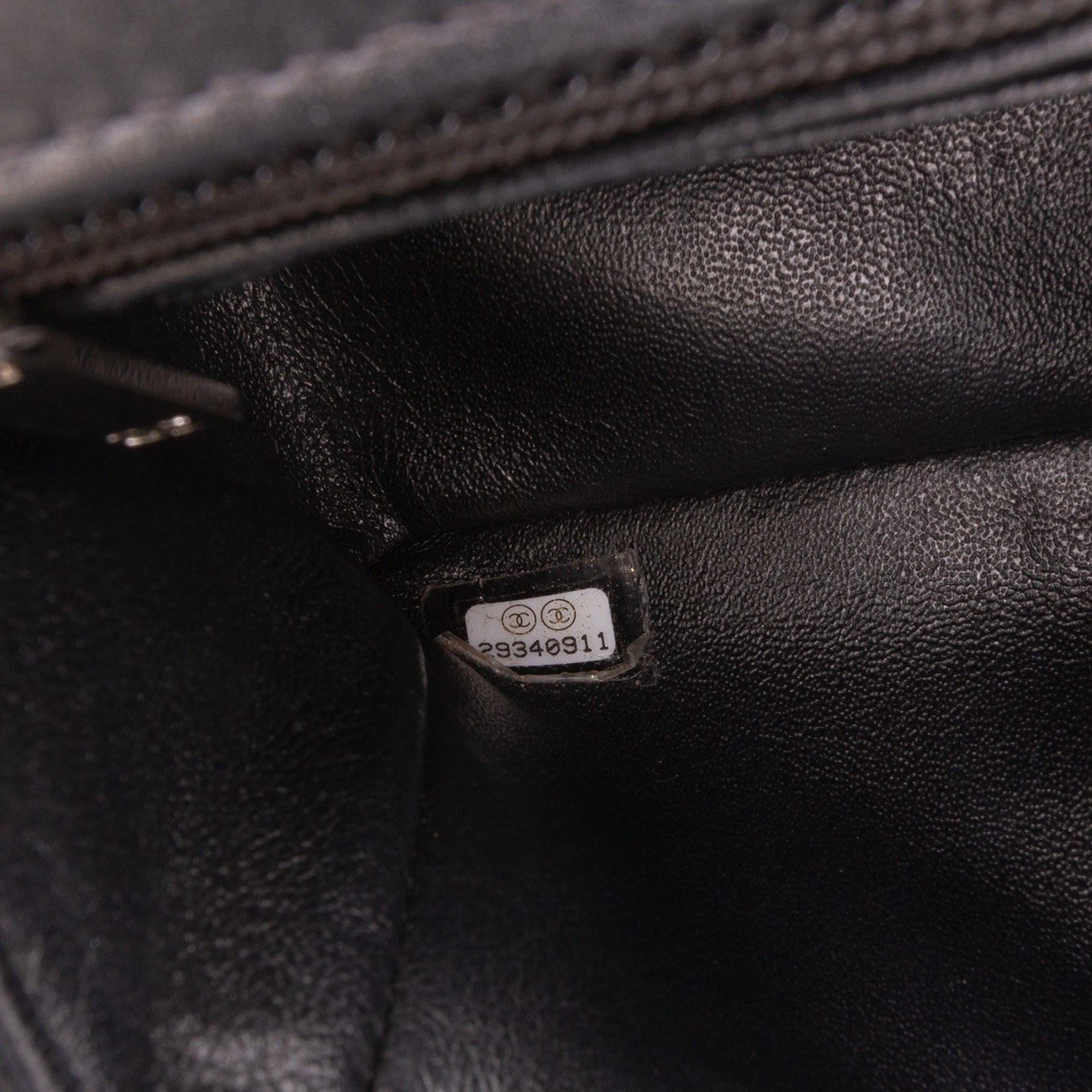 This crossbody bag features a quilted patent leather body, a leather woven chain strap, a front flap with interlocking Cs and a twist lock closure, exterior back slip pocket, and an interior zip pocket. Retail Price: 4900.00