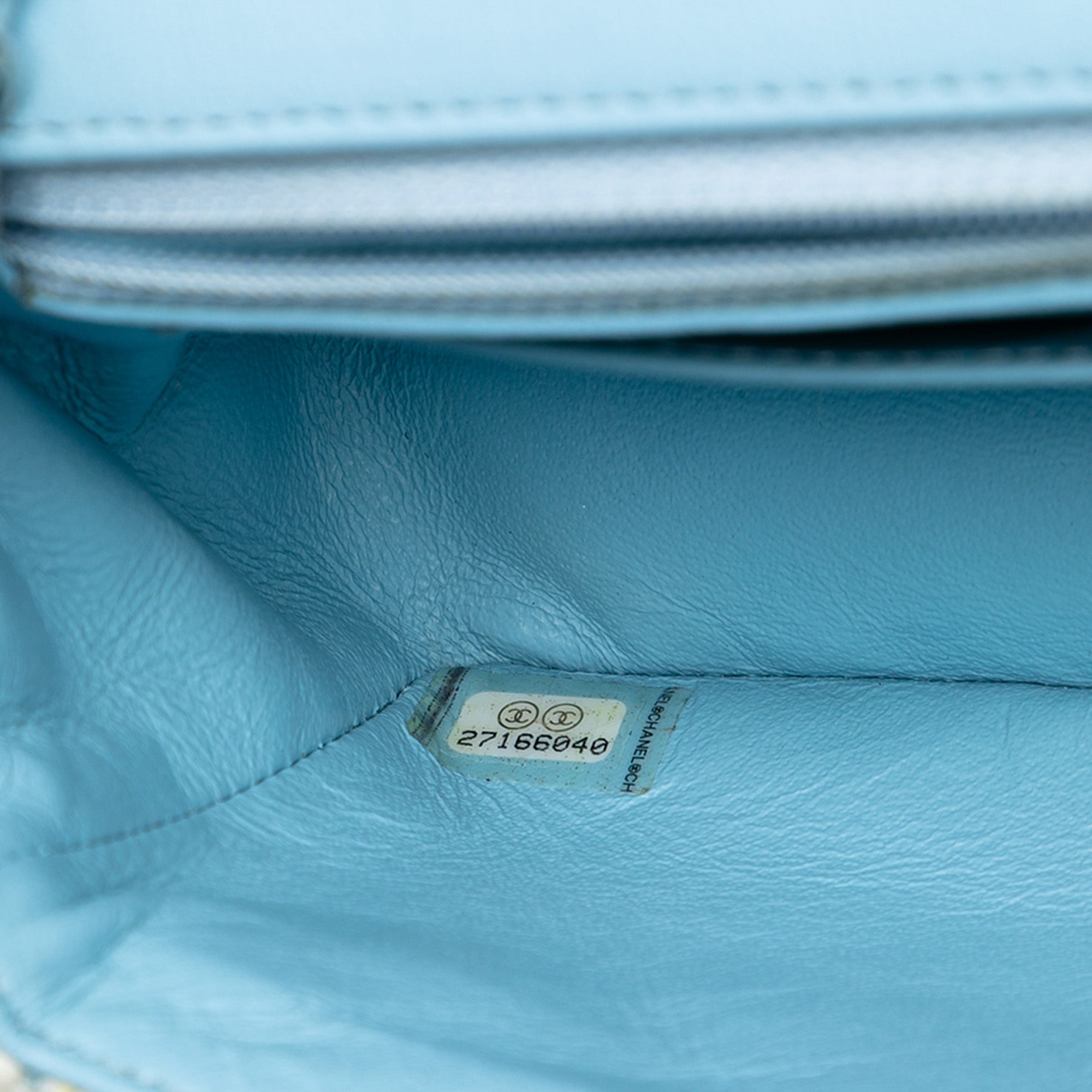 This flap bag features a tweed body, a woven chain strap, a front flap with interlocking Cs and a twist lock closure, an exterior back slip pocket, and interior zip and slip pockets. Retail Price: 8800.00