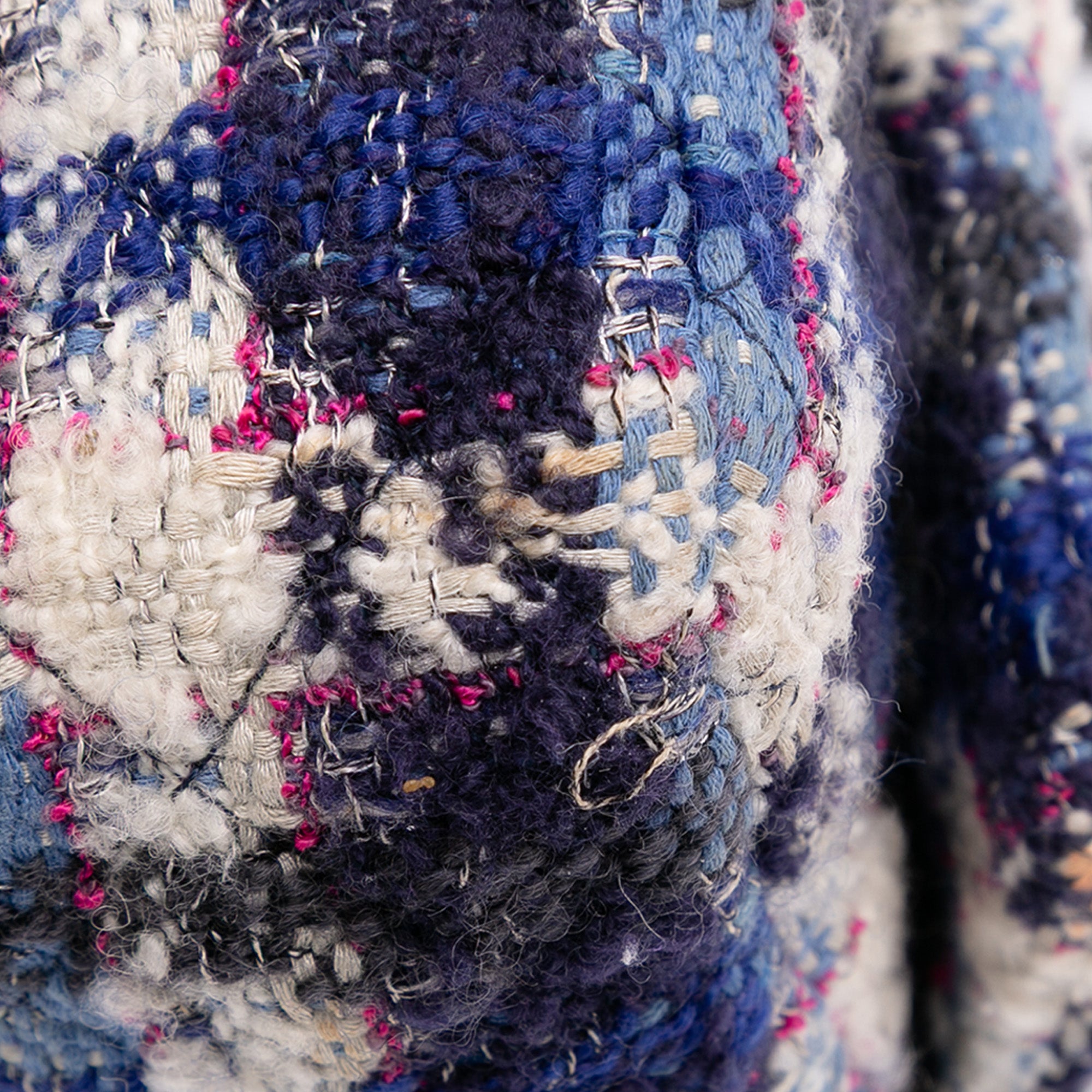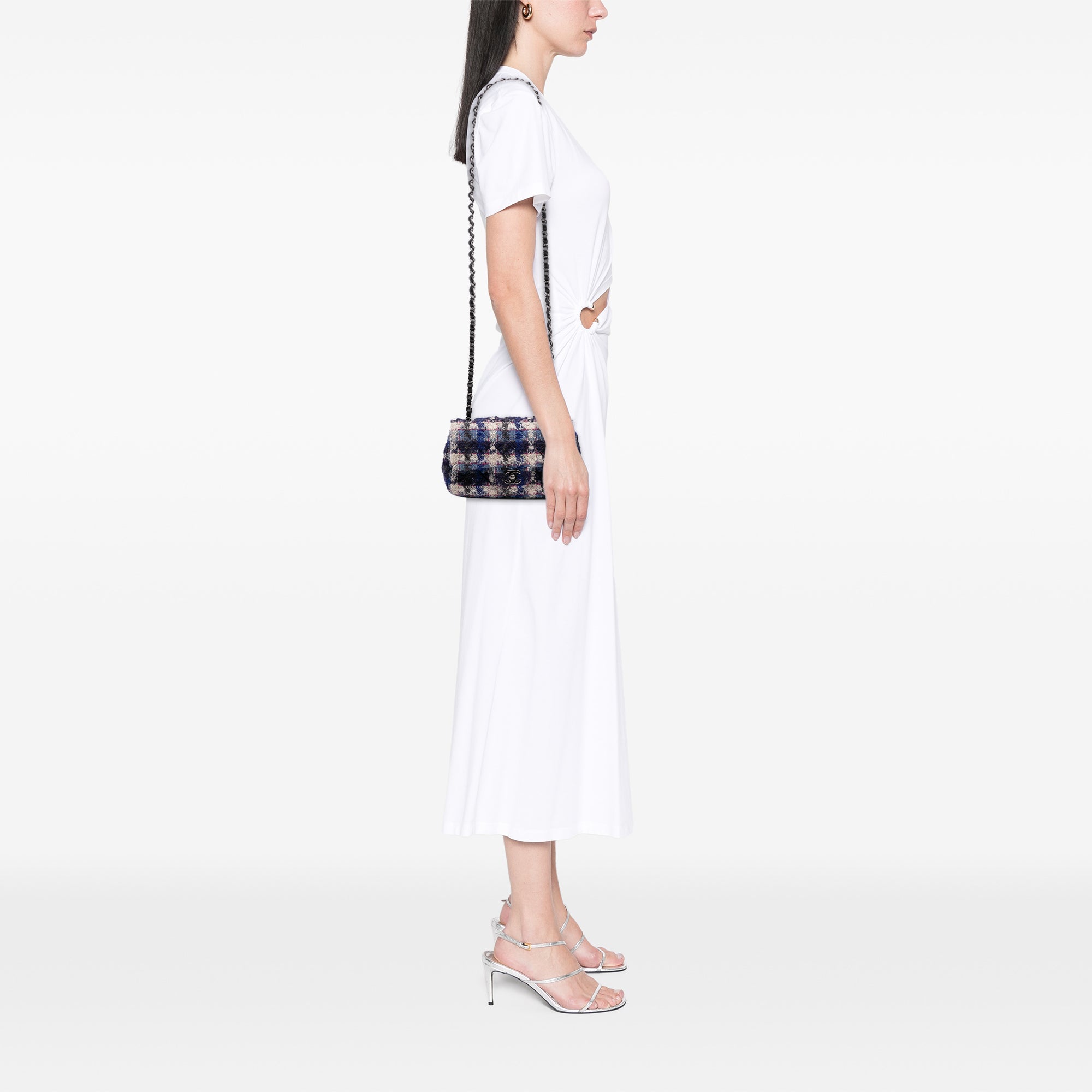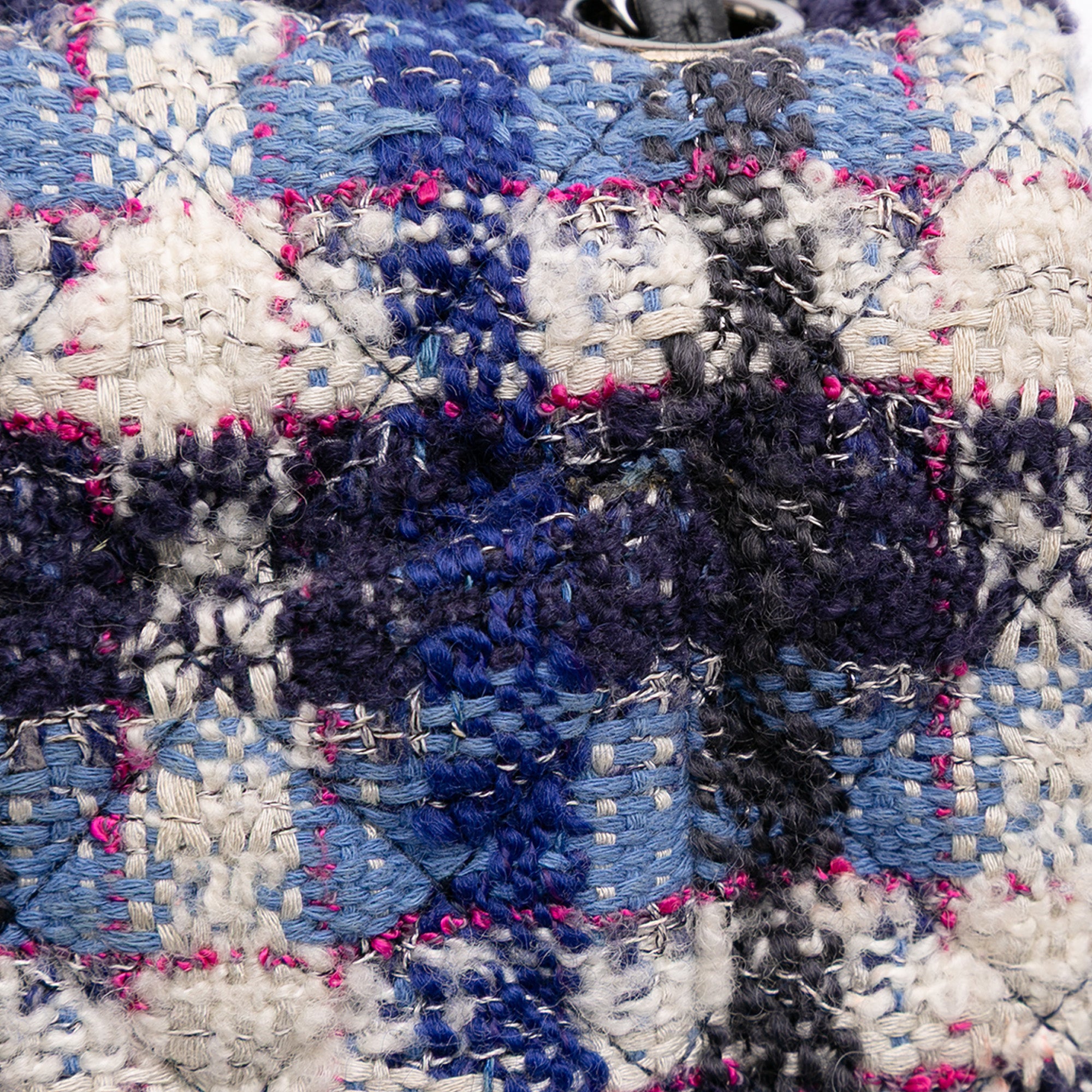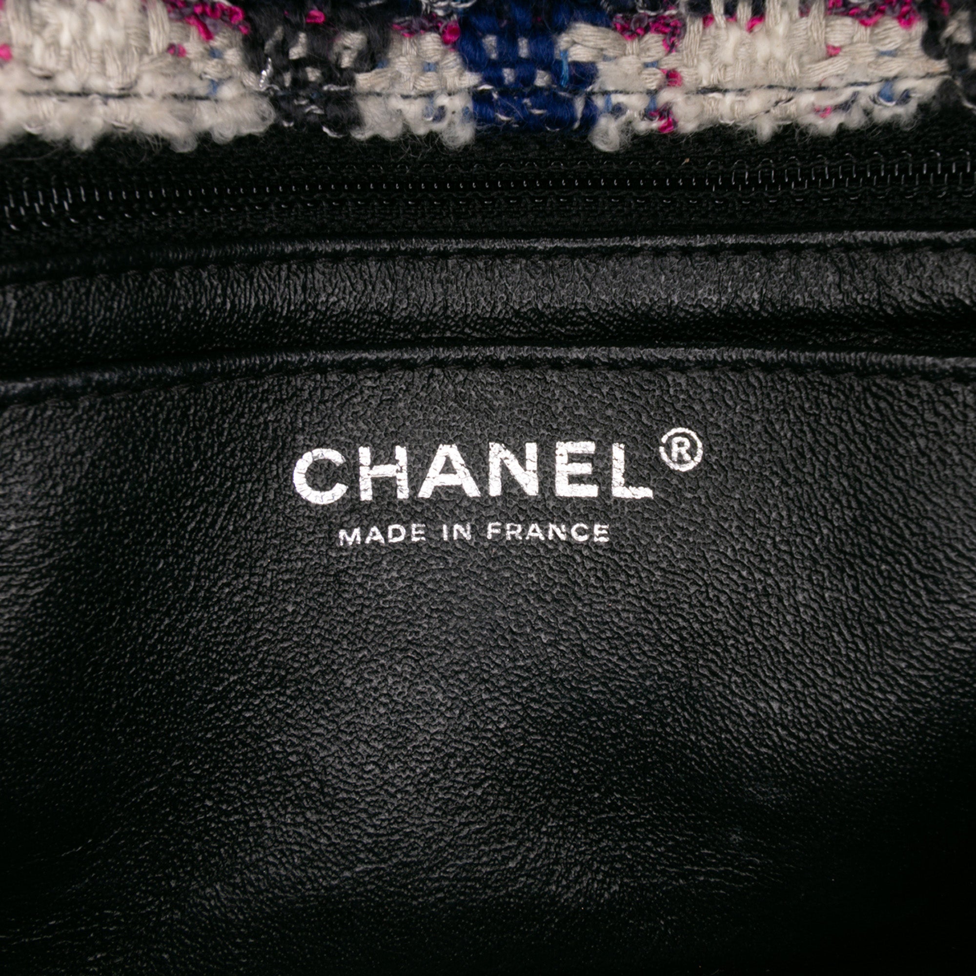 This flap bag features a quilted tweed body, a leather woven chain shoulder strap, a front flap with interlocking Cs and twist lock closure, an exterior back slip pocket, and interior zip and slip pockets. Inclusion: authenticity card. Retail Price: 6000.00