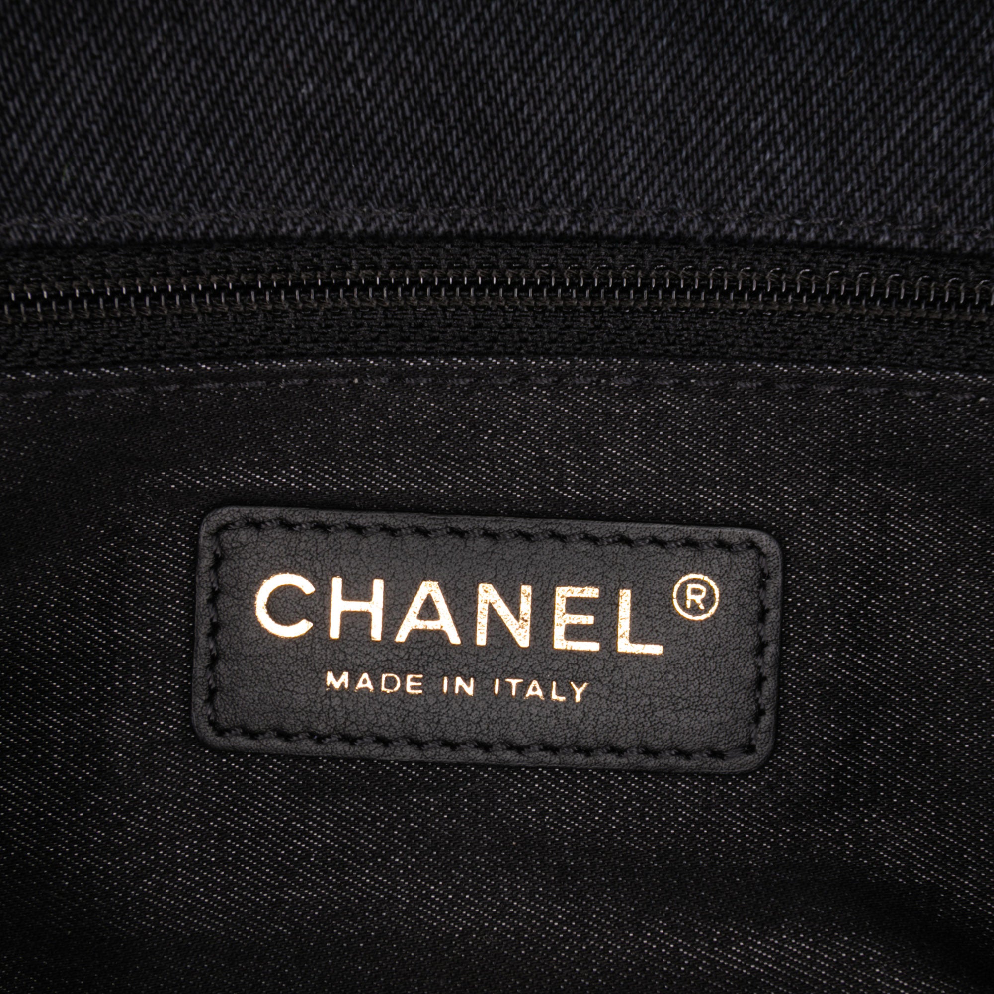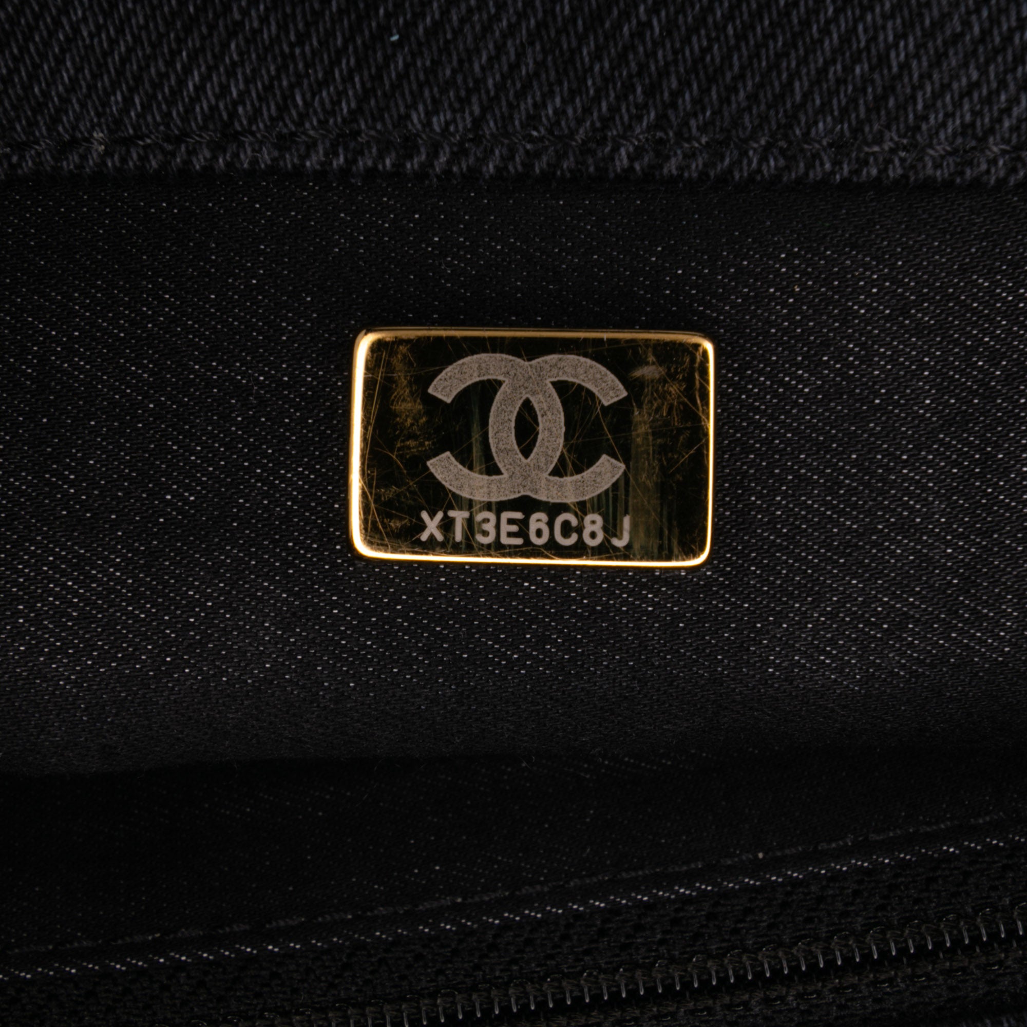 This crossbody bag features a quilted denim body, denim woven chain strap with denim shoulder guard, a front flap with twist lock closure, an exterior back slip pocket, and an interior zip pocket. Retail Price: 5900.00