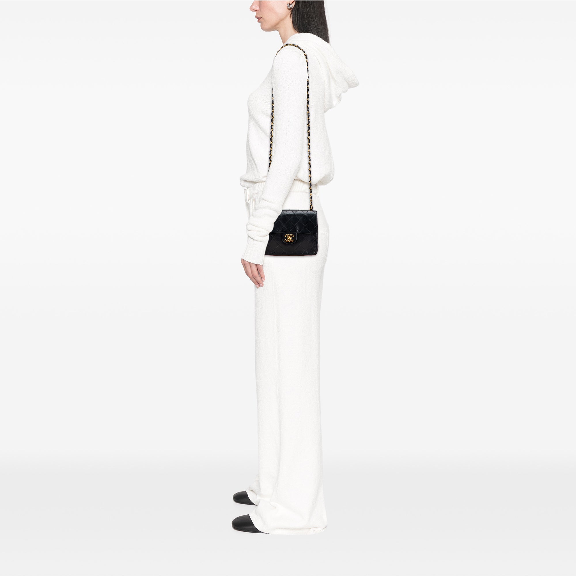 The Square Flap features a lambskin leather body, a leather woven chain shoulder strap, a front flap with turnlock closure, an exterior back slip pocket, and interior zip and slip pockets. Inclusion: authenticity card. Retail Price: 6850.00
