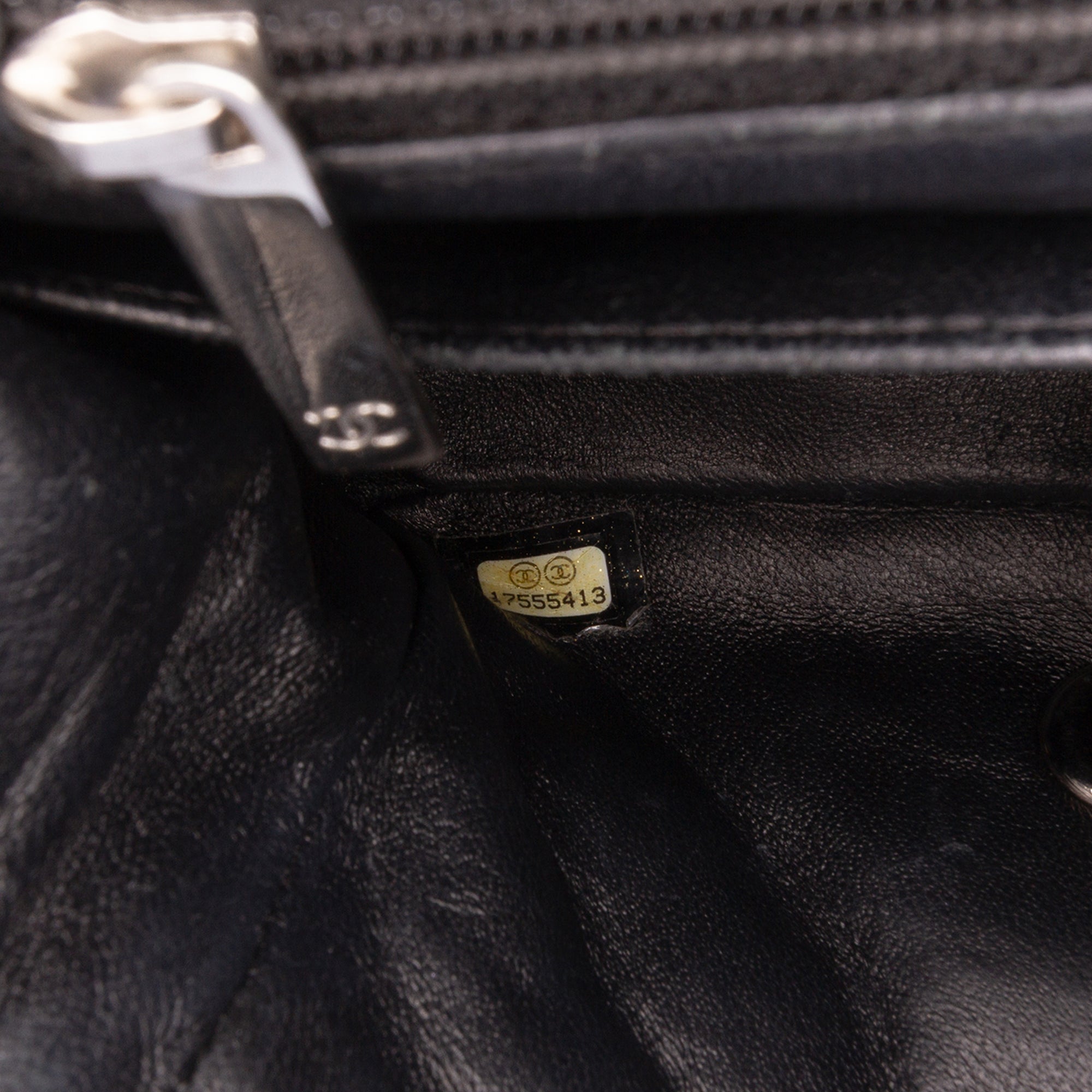 This flap bag features a quilted patent leather body, a leather woven chain shoulder strap, a front flap with interlocking Cs and a twist lock closure, an exterior back slip pocket, and interior zip and slip pockets. Retail Price: 4700.00