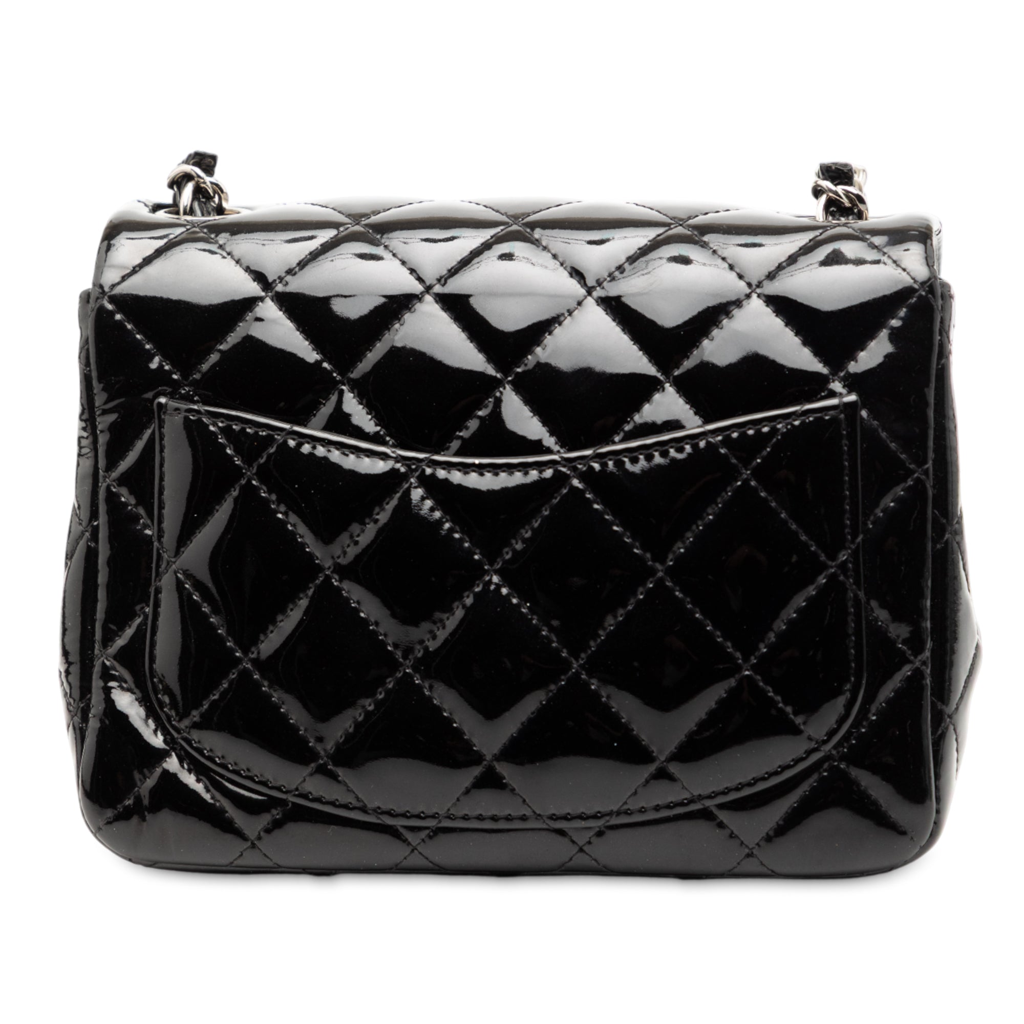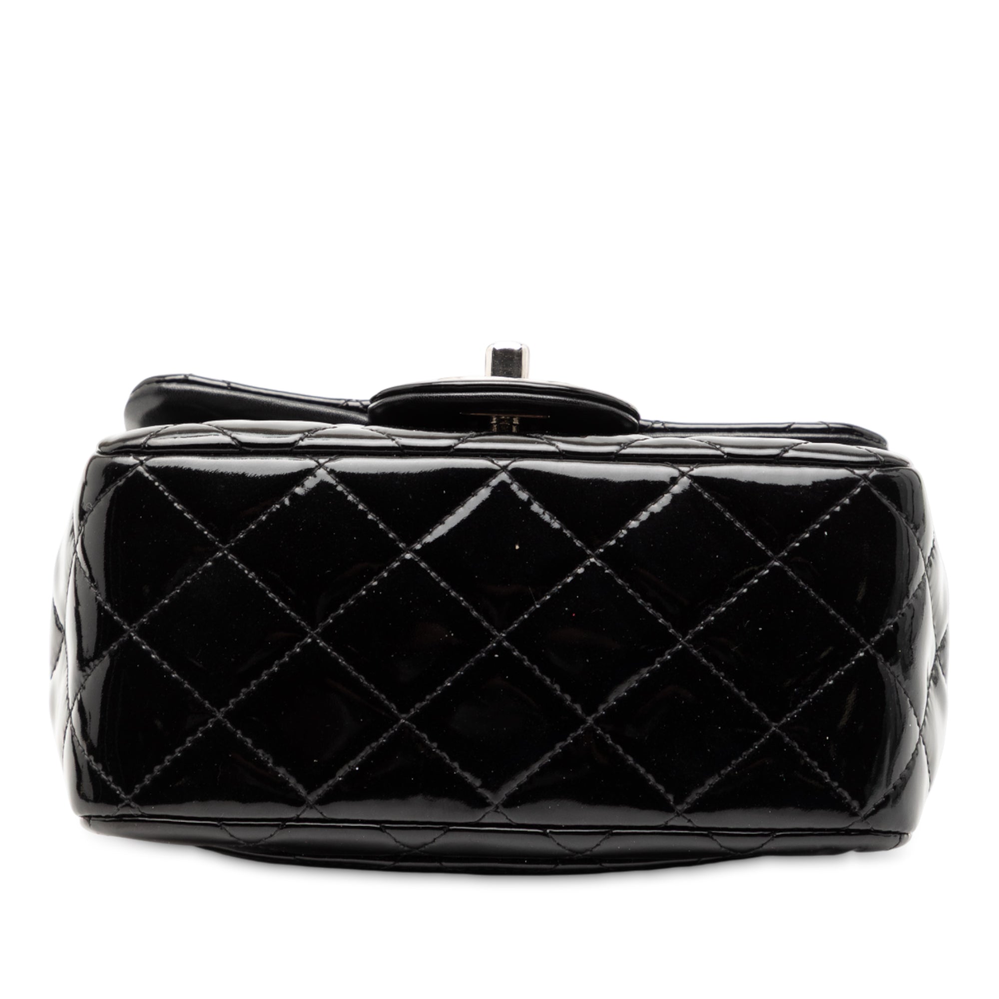 This flap bag features a quilted patent leather body, a leather woven chain shoulder strap, a front flap with interlocking Cs and a twist lock closure, an exterior back slip pocket, and interior zip and slip pockets. Retail Price: 4700.00