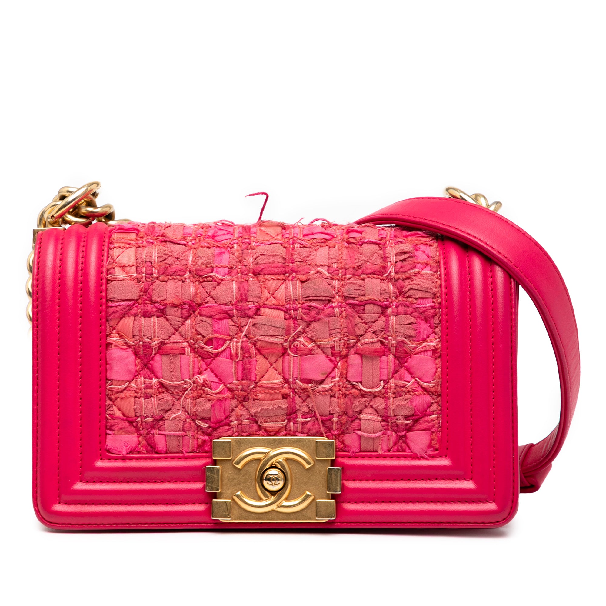 The Boy Flap bag features a tweed and leather body, a chain link shoulder strap with leather guard, a front flap with a push-lock closure, and an interior slip pocket. Inclusion: authenticity card. Retail Price: 3350.00