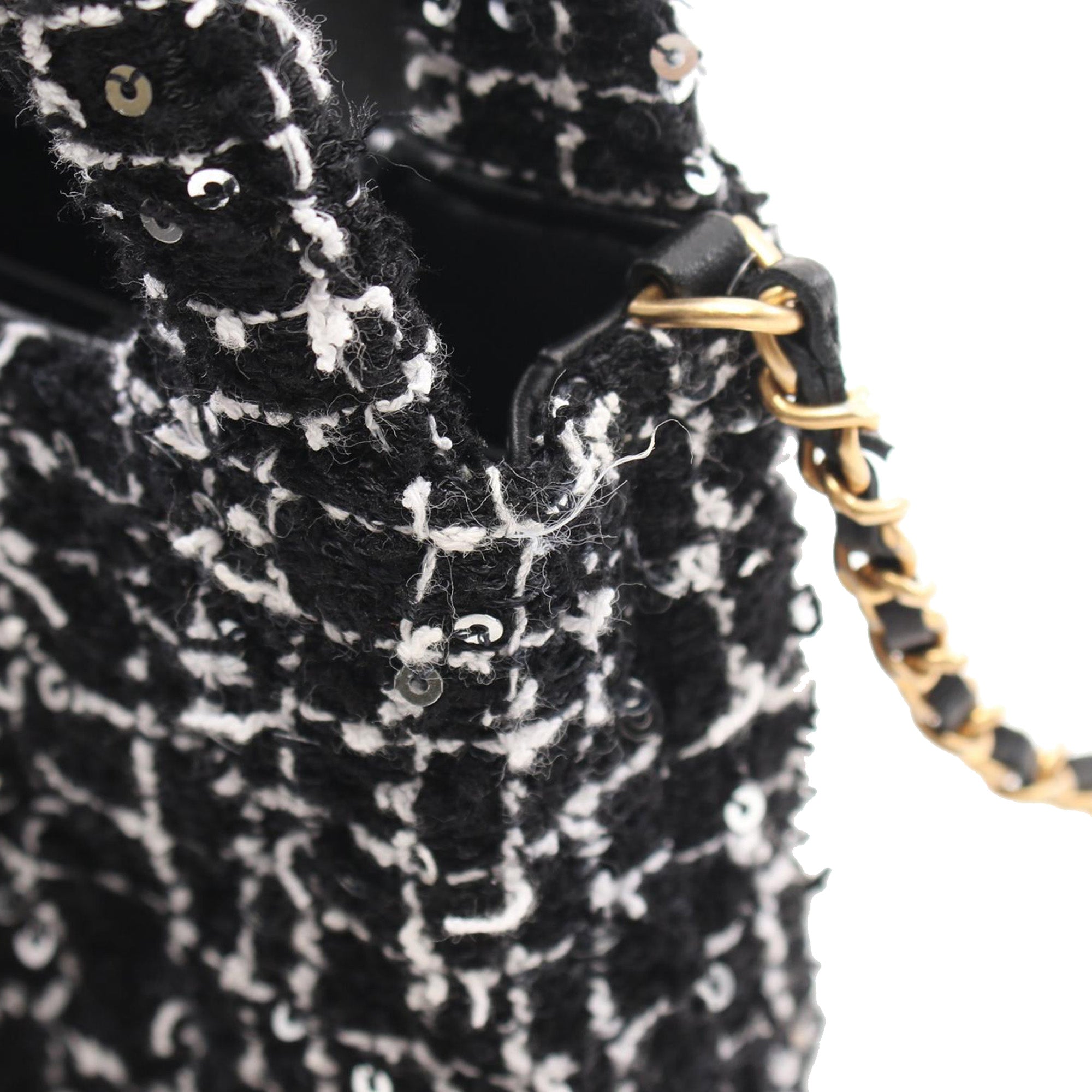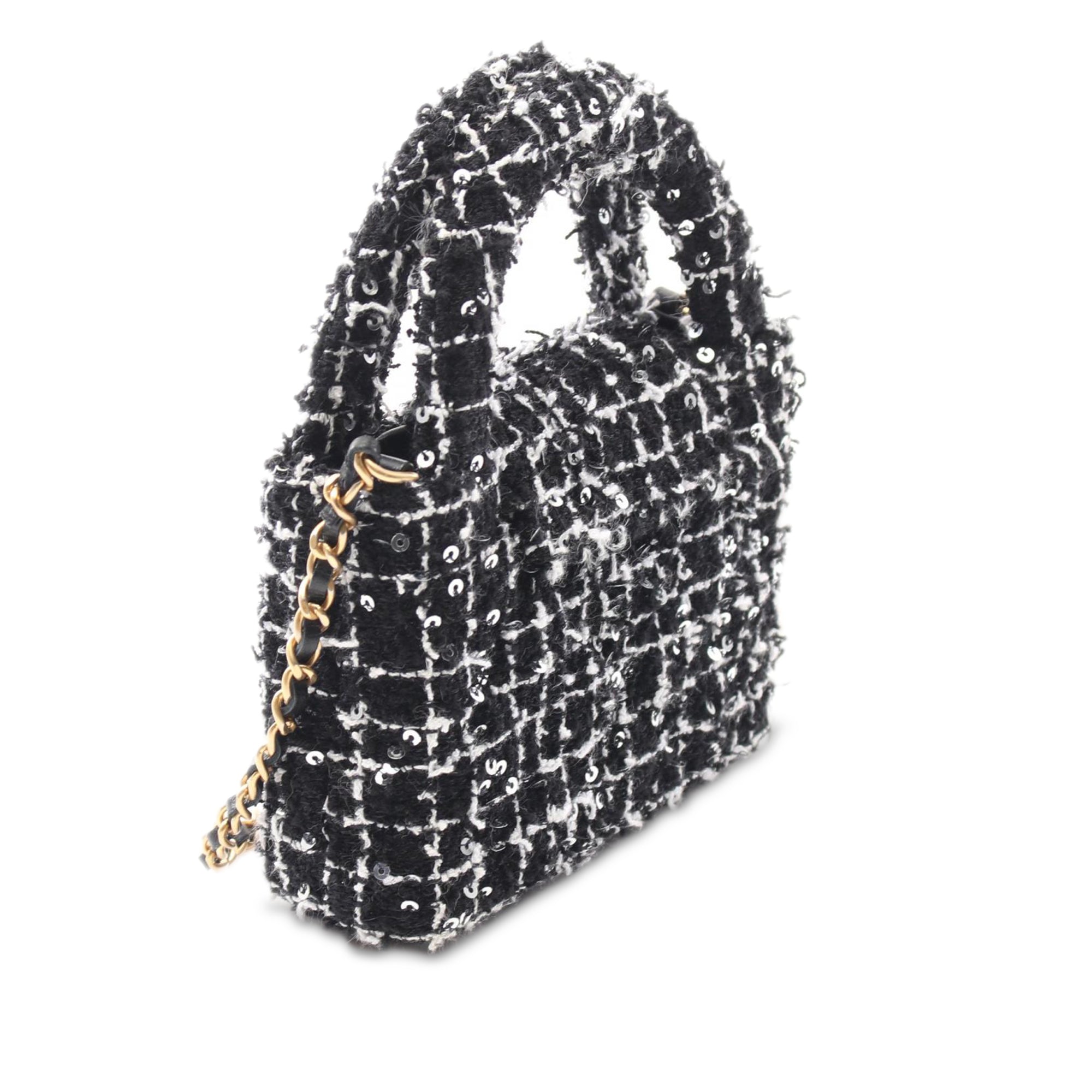 This satchel features a tweed body with sequin embellishments, rolled handles, a leather woven chain link shoulder strap, a top flap with turn lock closure, and an interior slip pocket. Inclusion: Dust bag. Retail Price: 5500.00