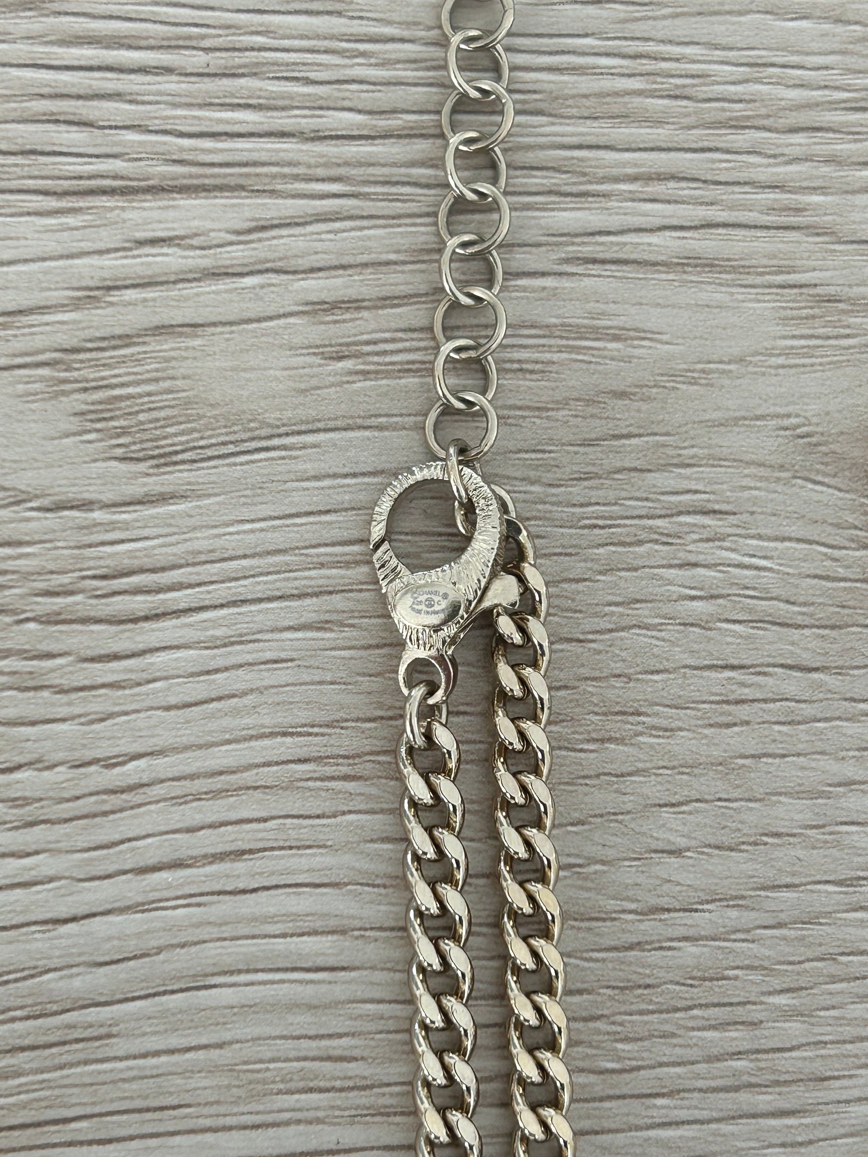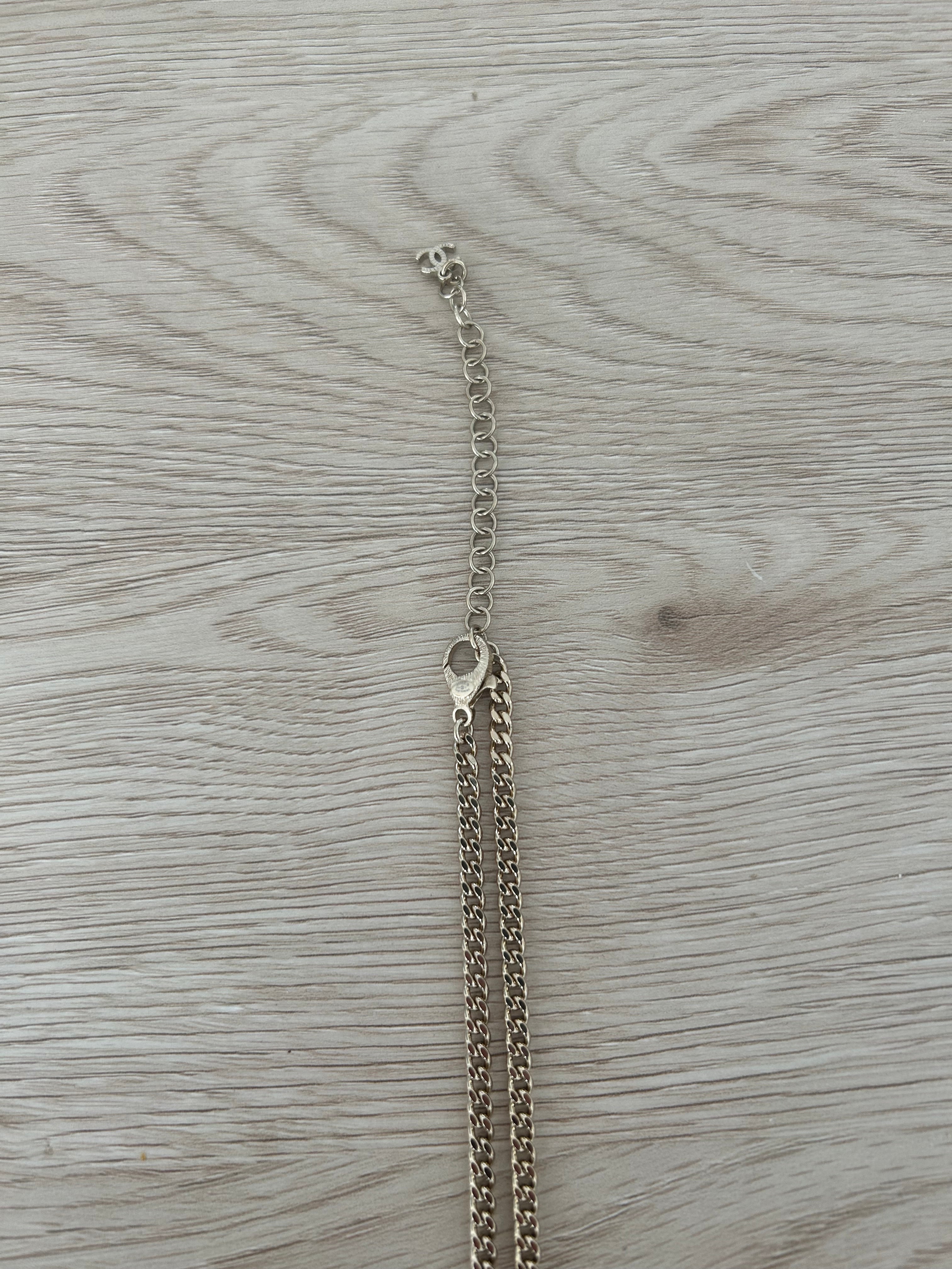 Very beautiful long Chanel necklace in champagne gold metal Double-sided square pendant: one side with rhinestone Cc and one side simple Cc on a gold background. Hallmark present on the clasp. It measures 29 cm, adjustable up to 36 cm.. Sold in a neutral box. Excellent condition