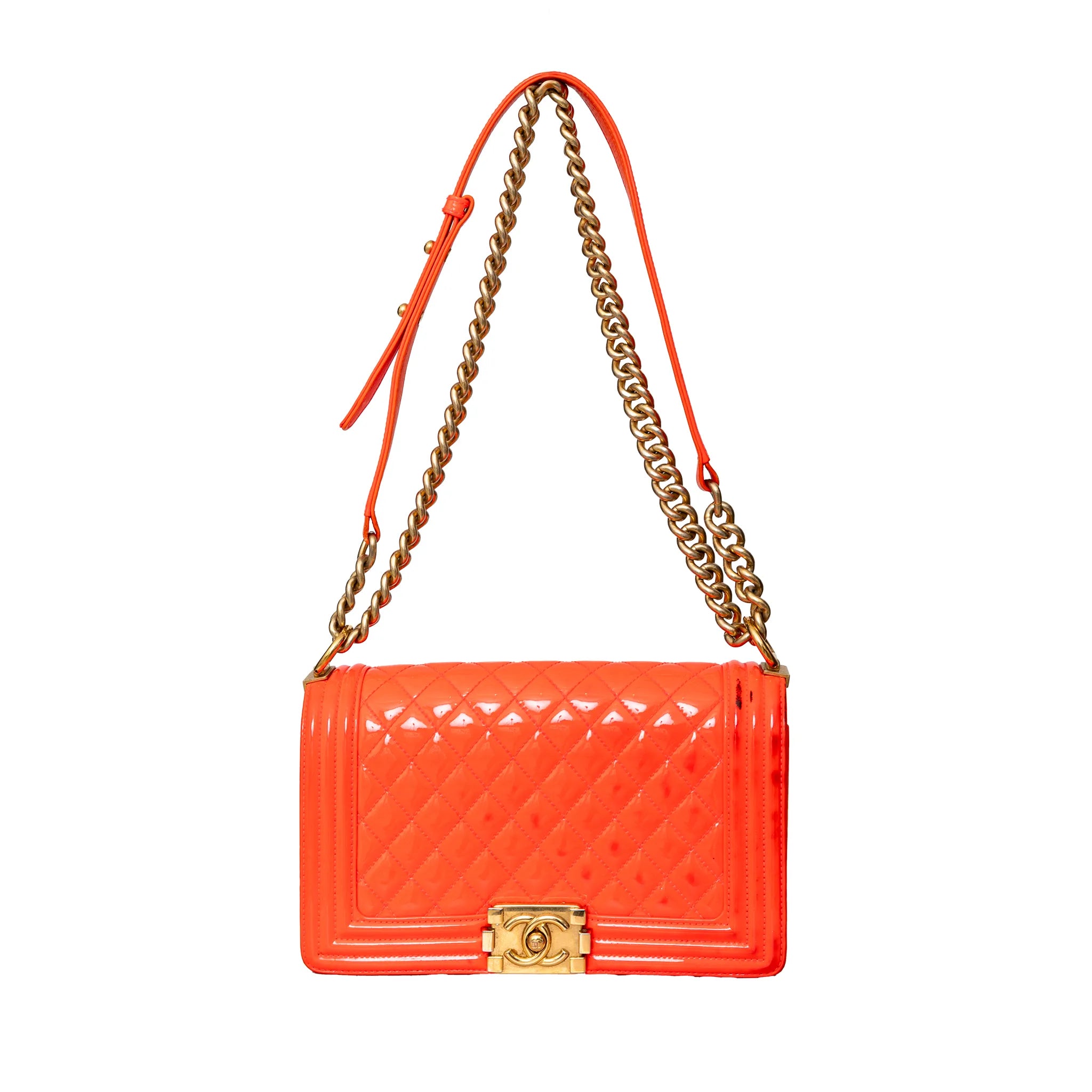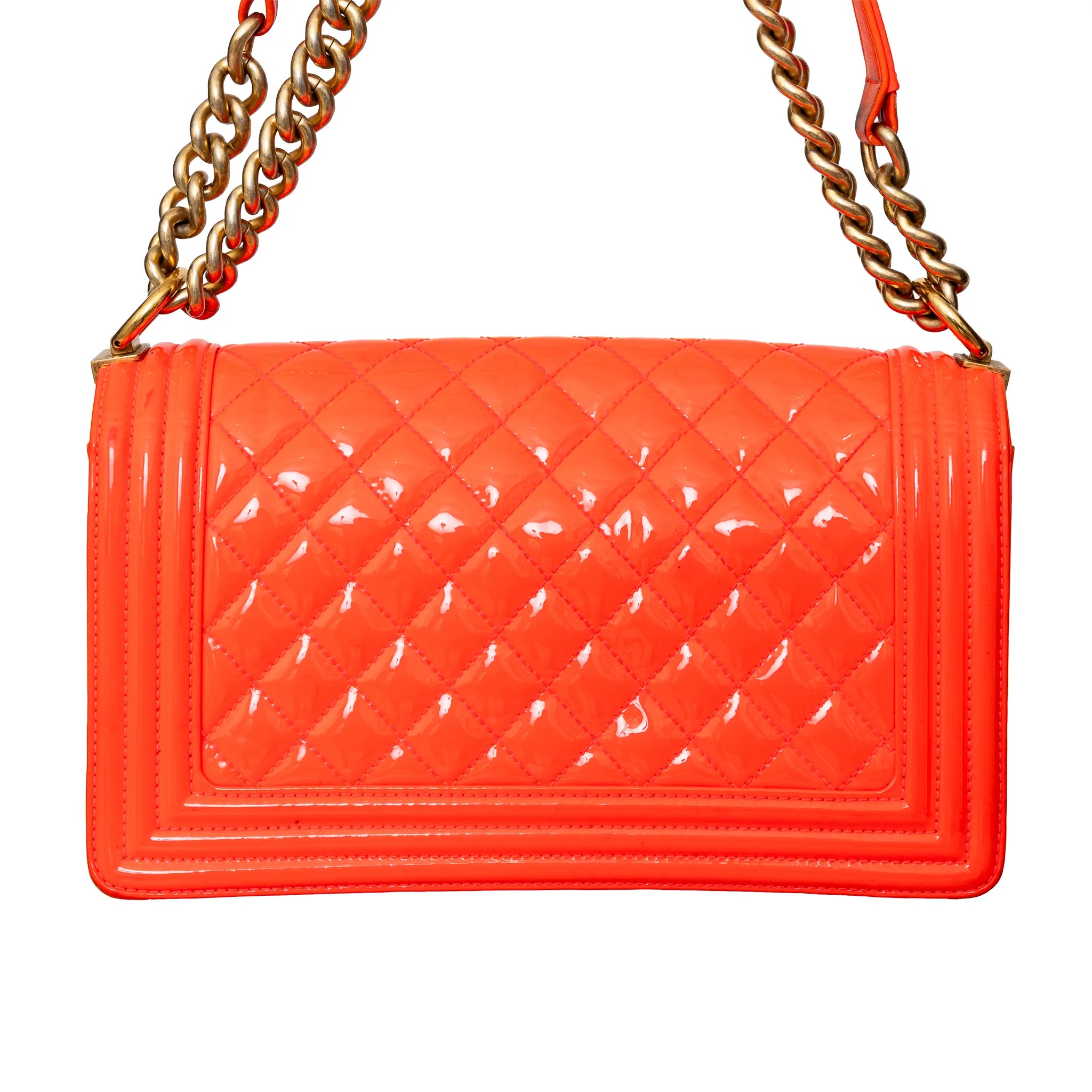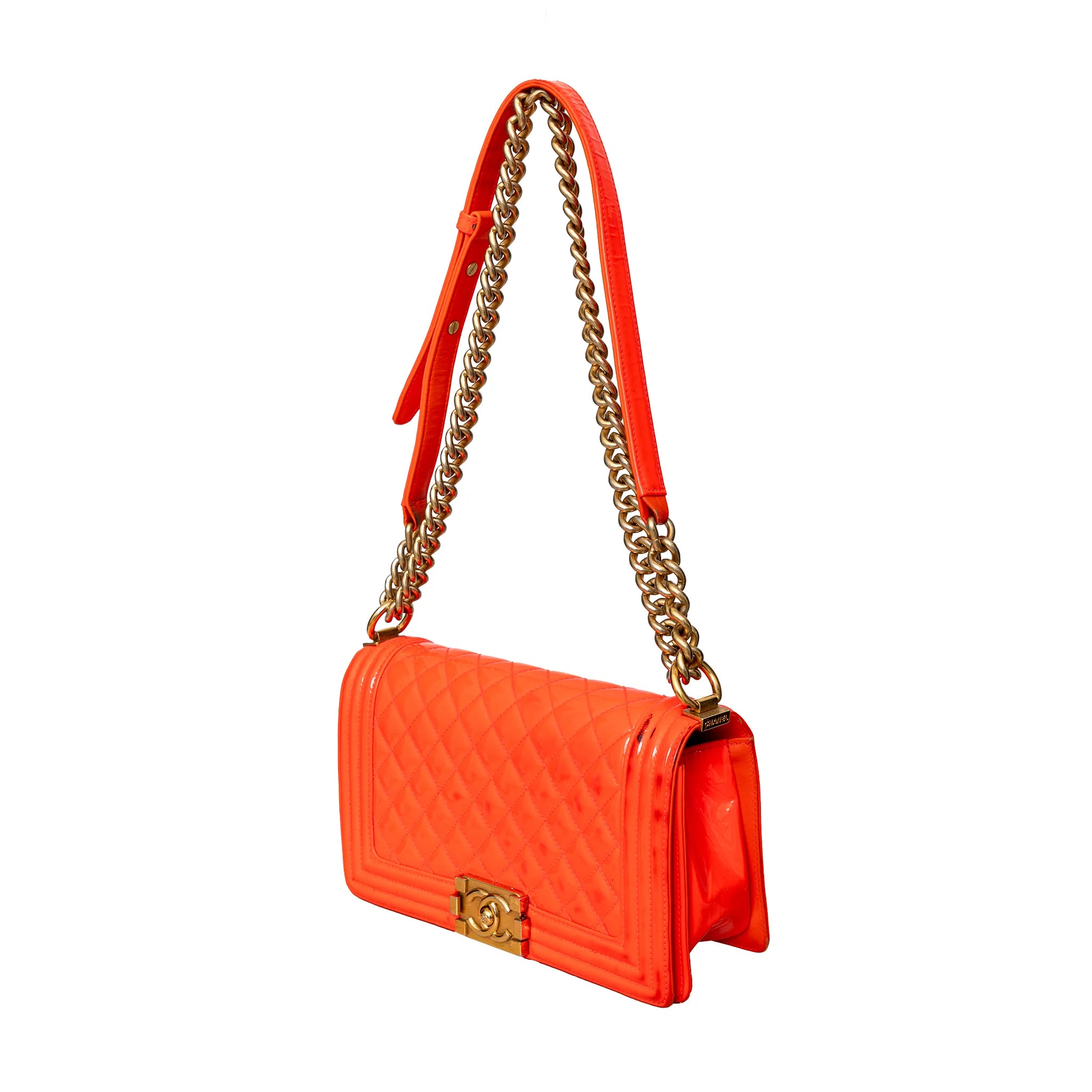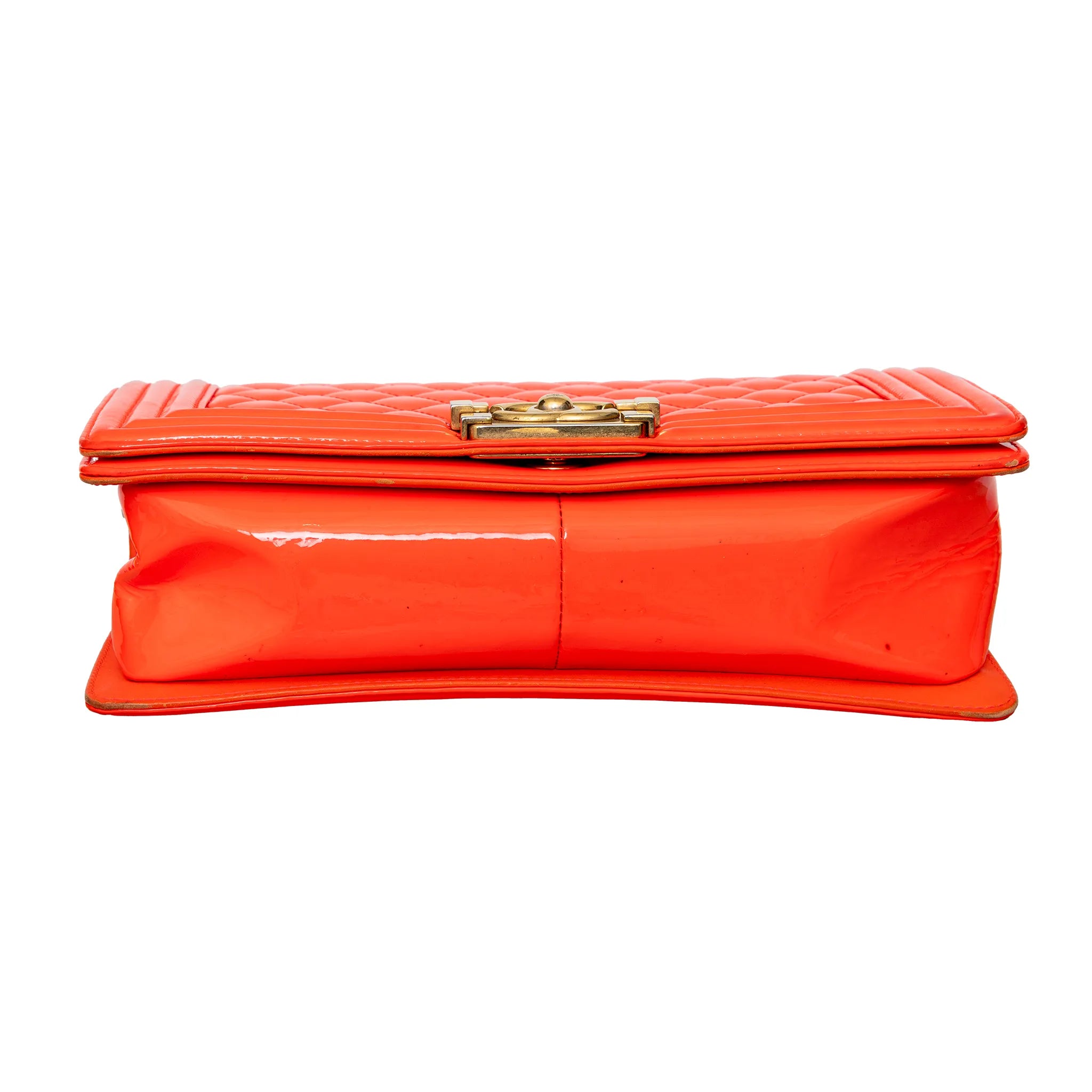 Chanel Medium Boy Bag in neon orange patent leather with signature quilted design, antiqued golden hardware, and adjustable chain and leather shoulder strap.