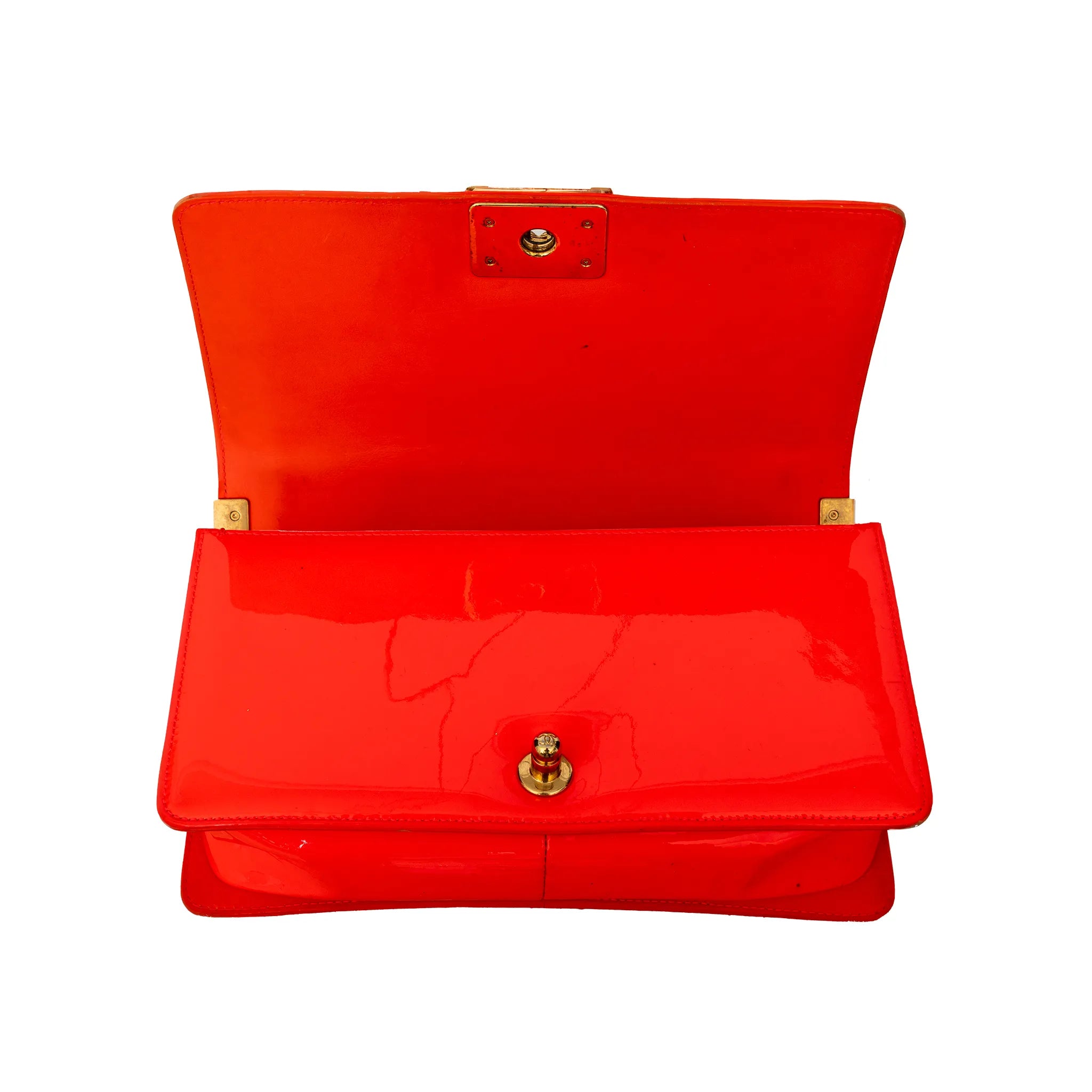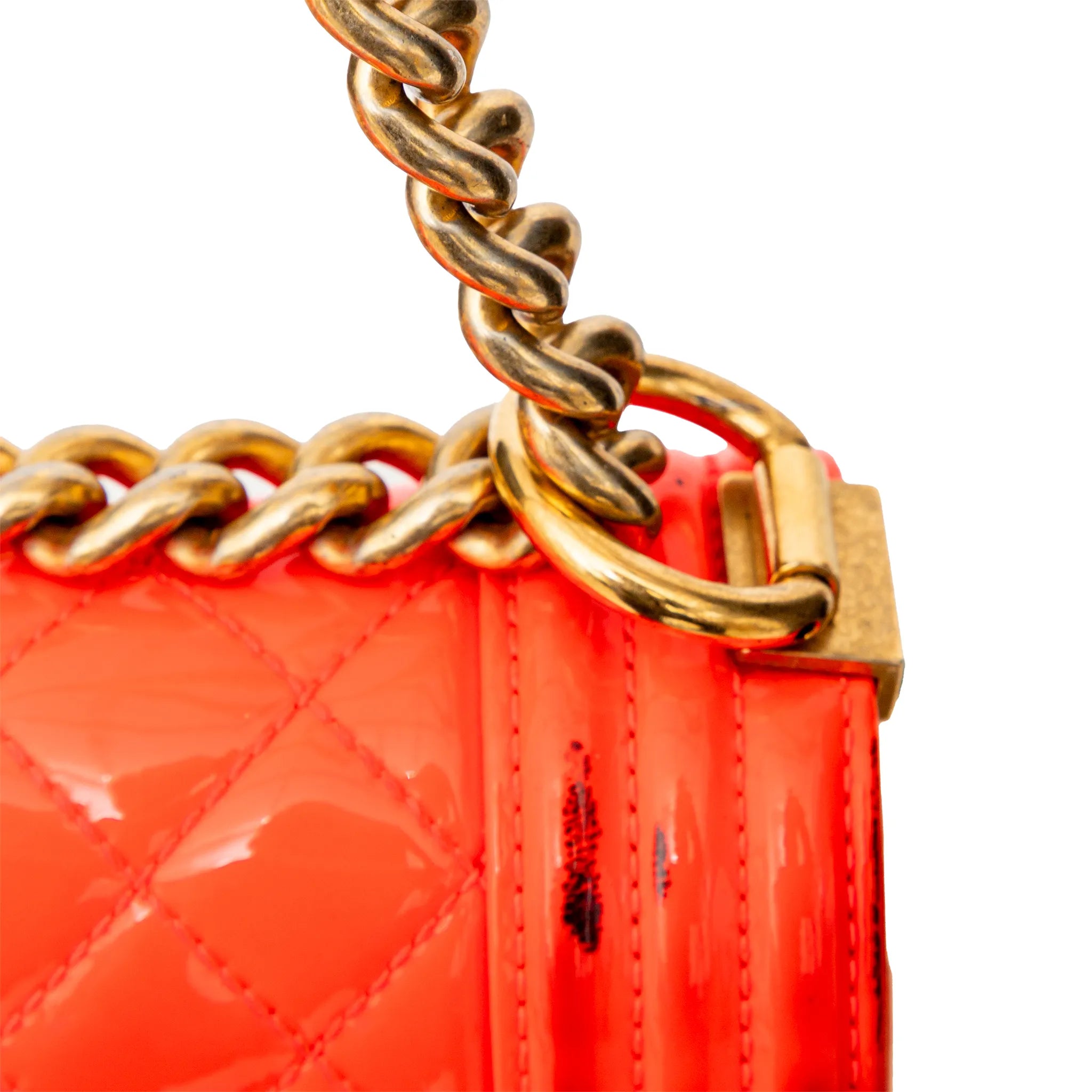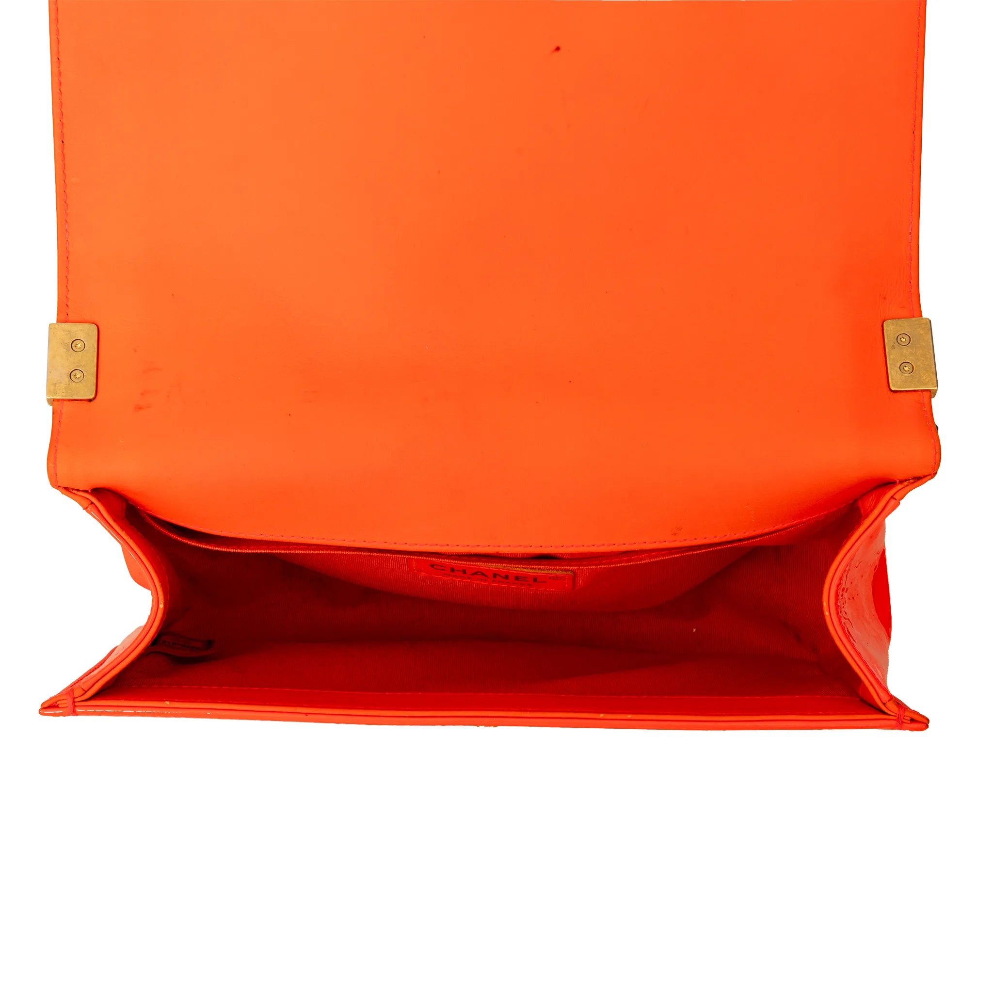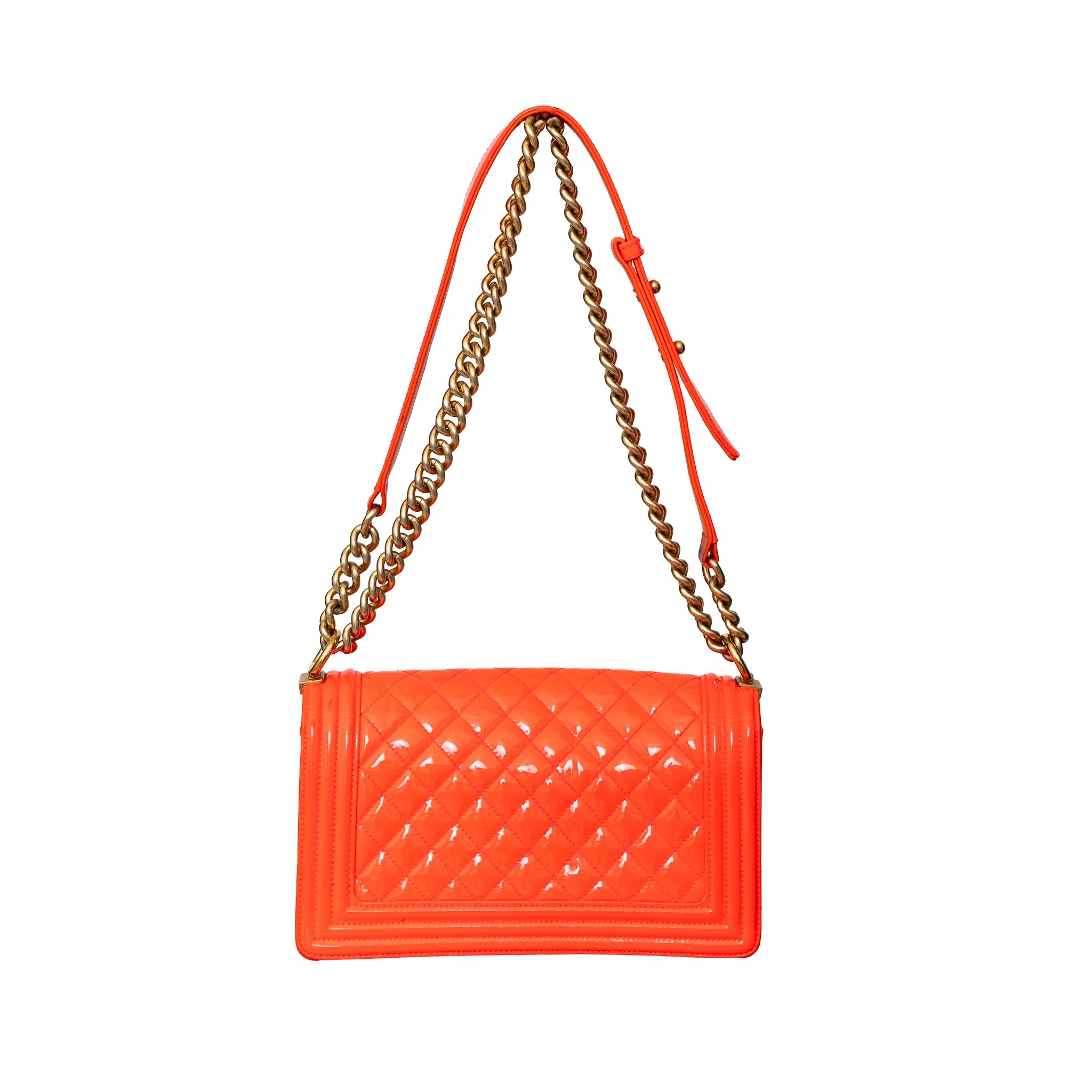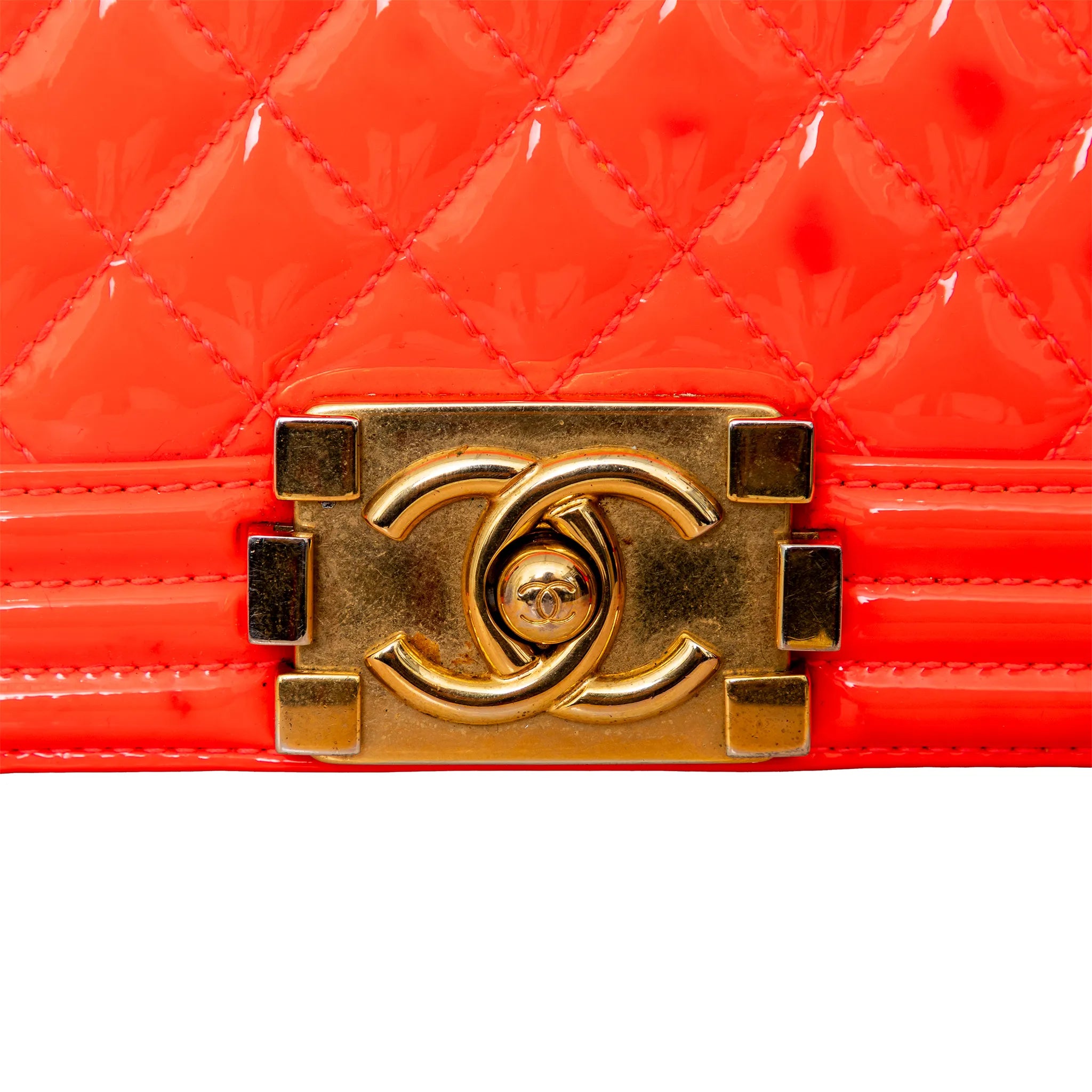 Chanel Medium Boy Bag in neon orange patent leather with signature quilted design, antiqued golden hardware, and adjustable chain and leather shoulder strap.