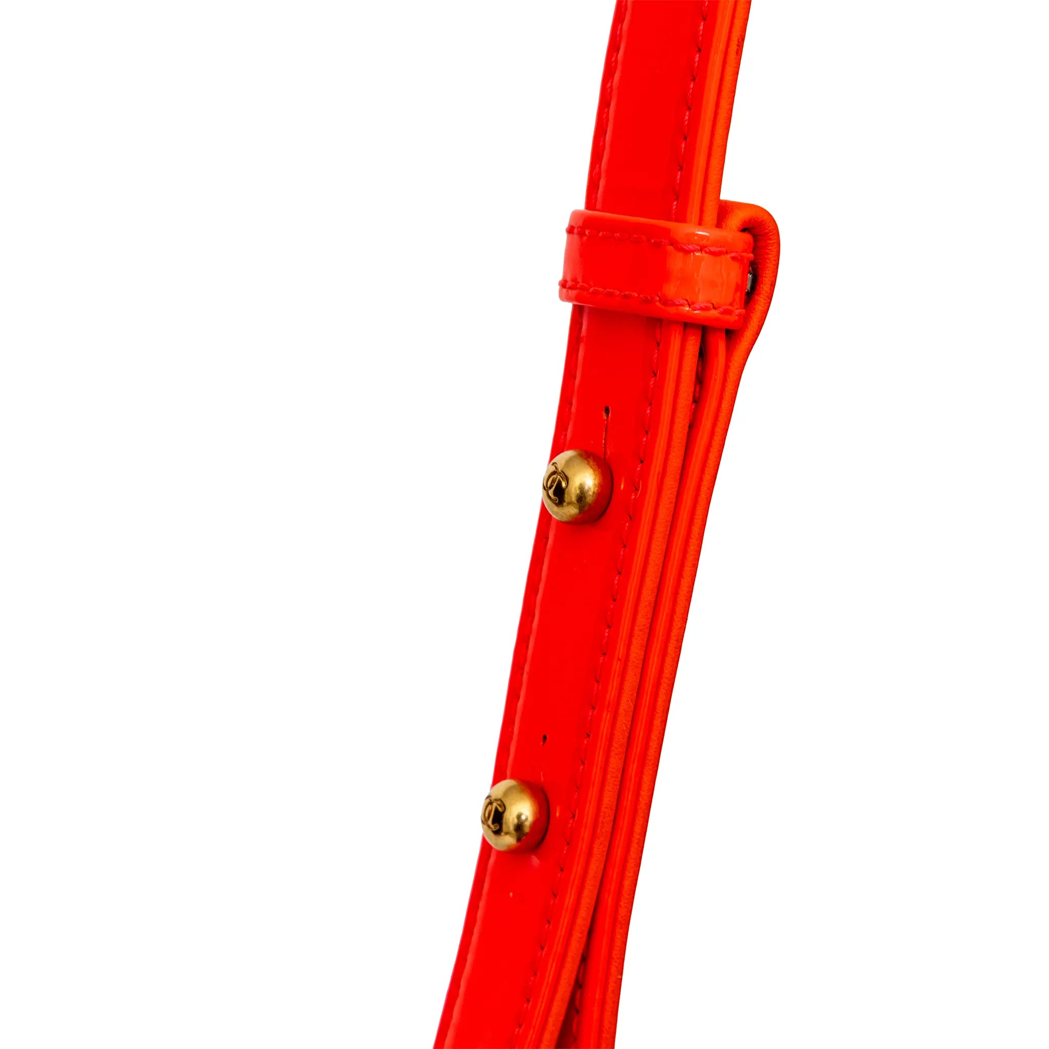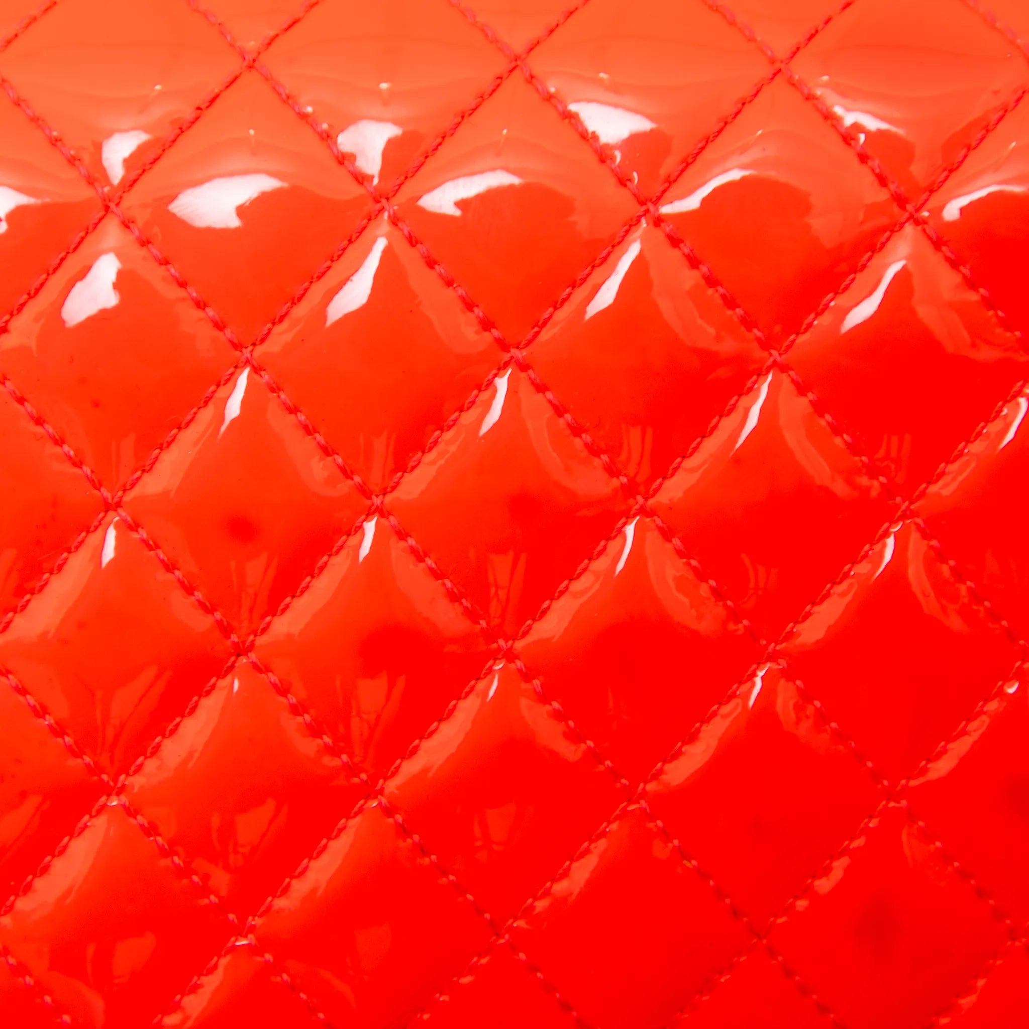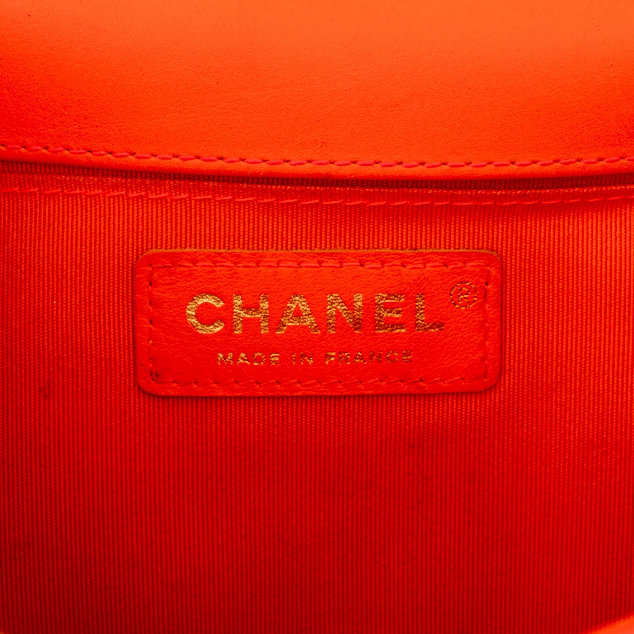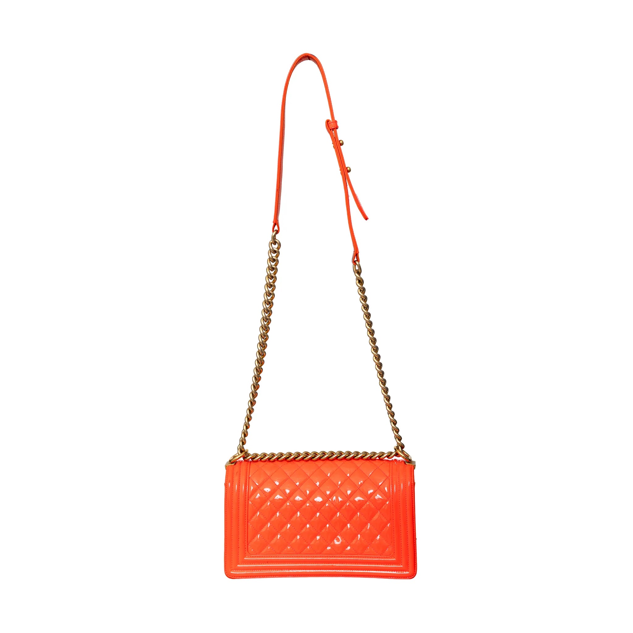 Chanel Medium Boy Bag in neon orange patent leather with signature quilted design, antiqued golden hardware, and adjustable chain and leather shoulder strap.