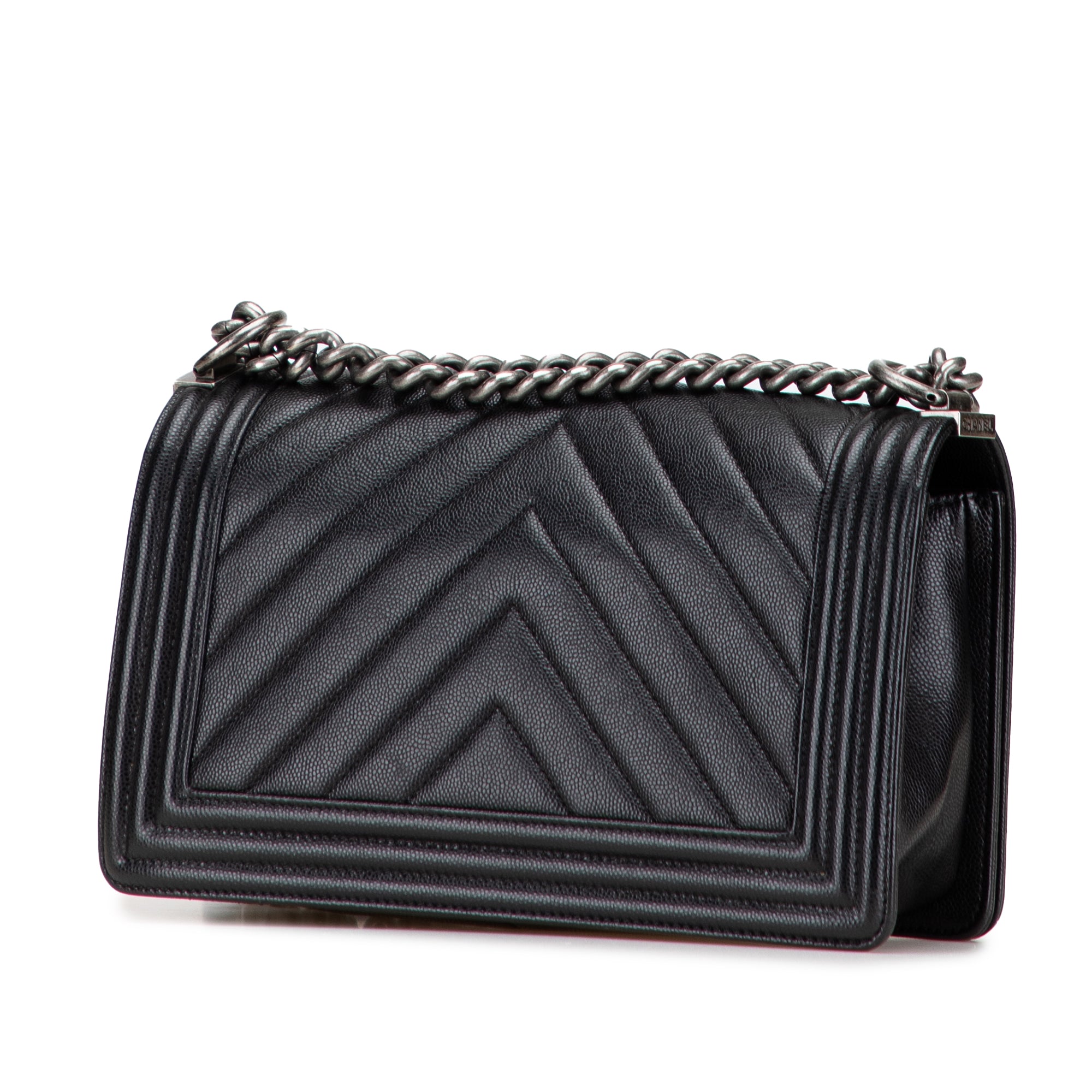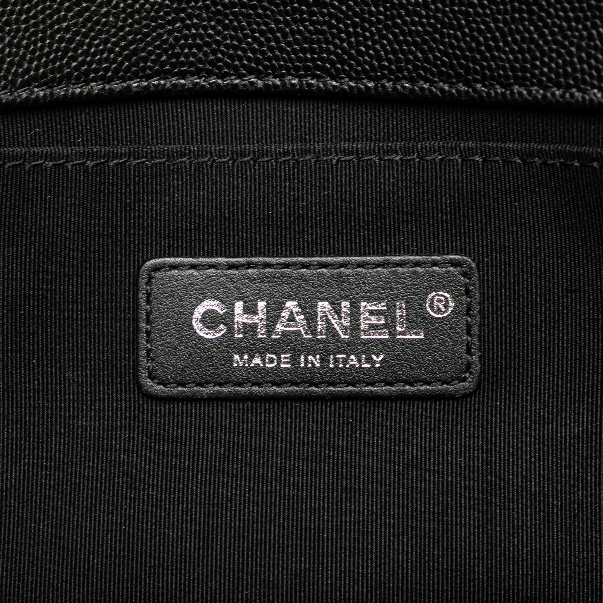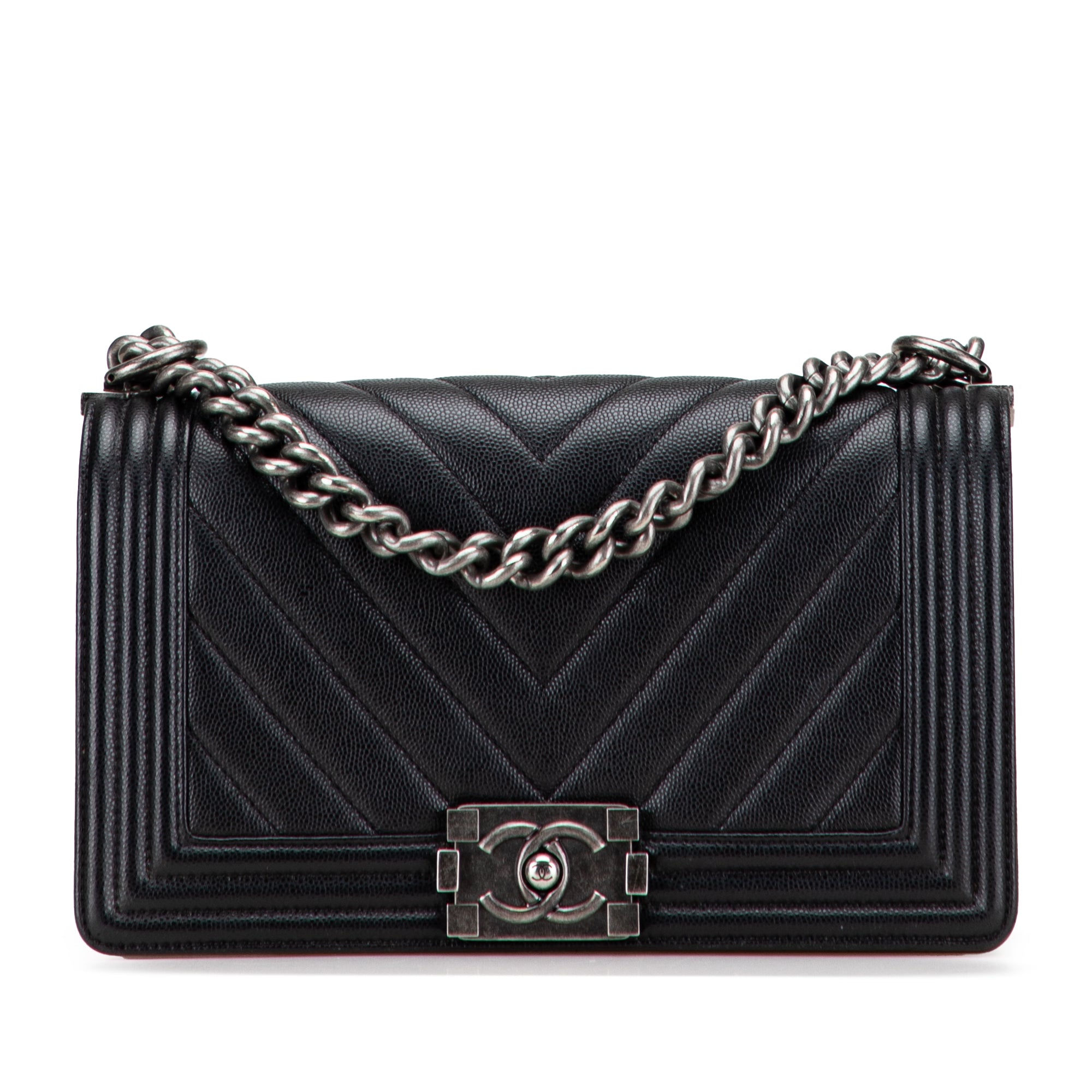 The Boy Flap features a quilted caviar leather body, a chain link shoulder strap with leather guard, a front flap with push lock closure, and an interior slip pocket. Inclusion: box. Retail Price: 6600.00