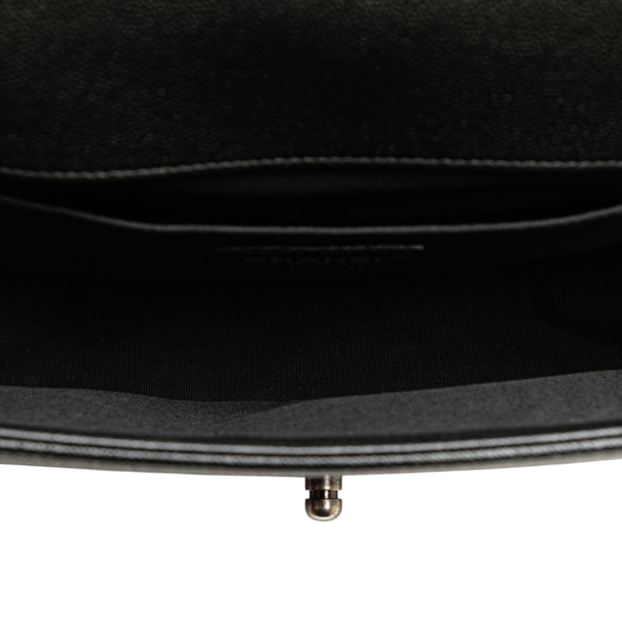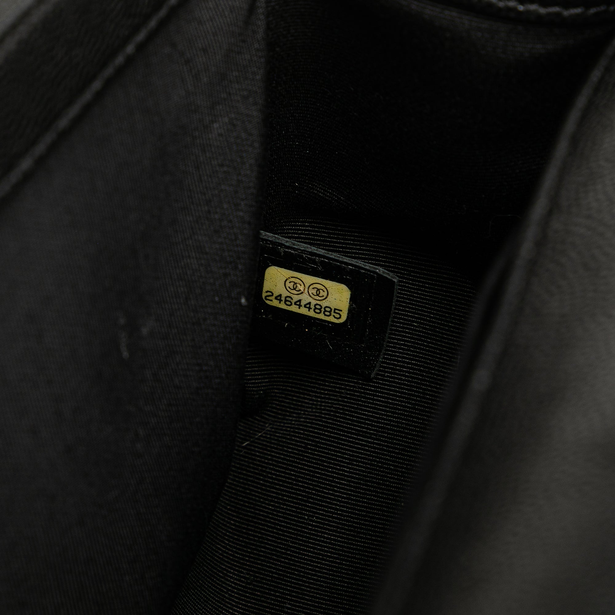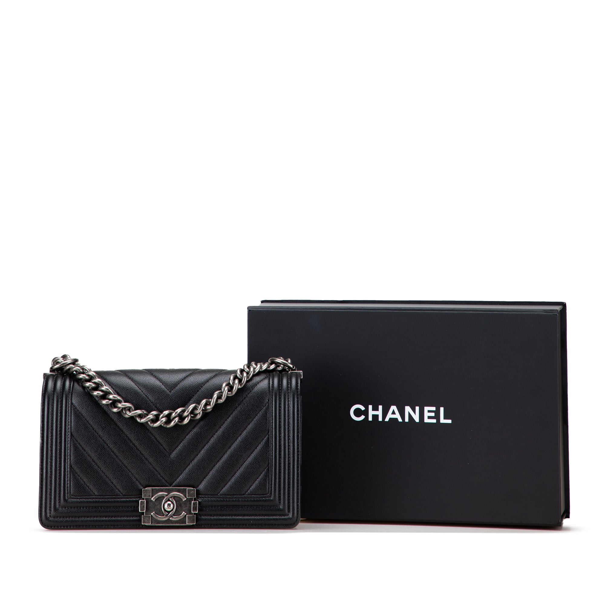 The Boy Flap features a quilted caviar leather body, a chain link shoulder strap with leather guard, a front flap with push lock closure, and an interior slip pocket. Inclusion: box. Retail Price: 6600.00