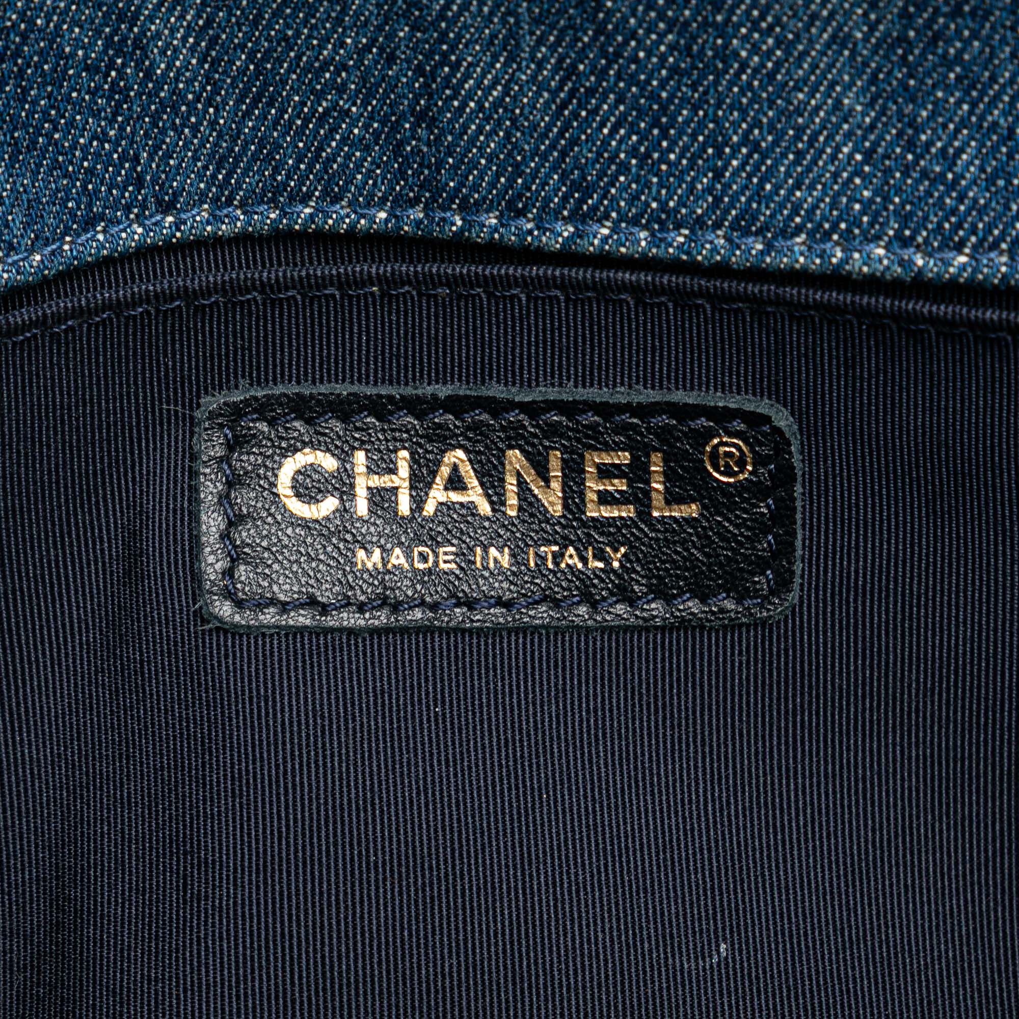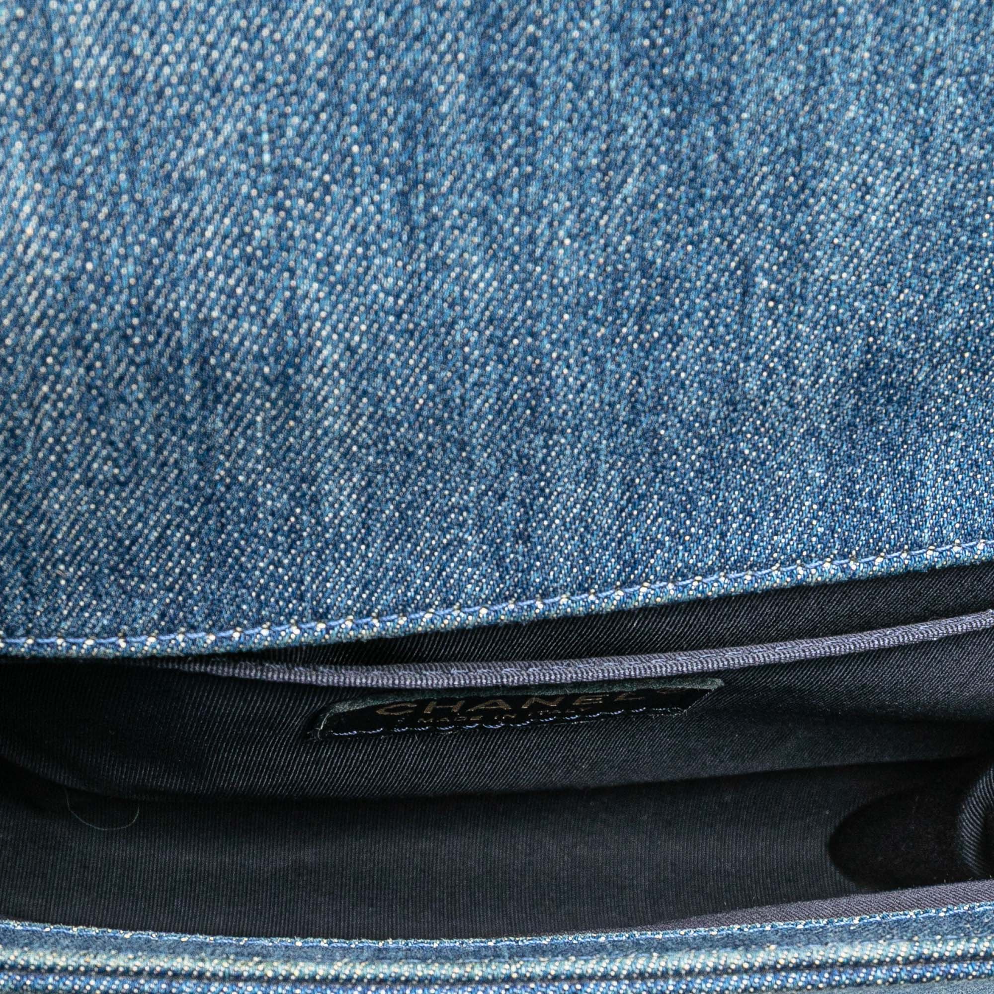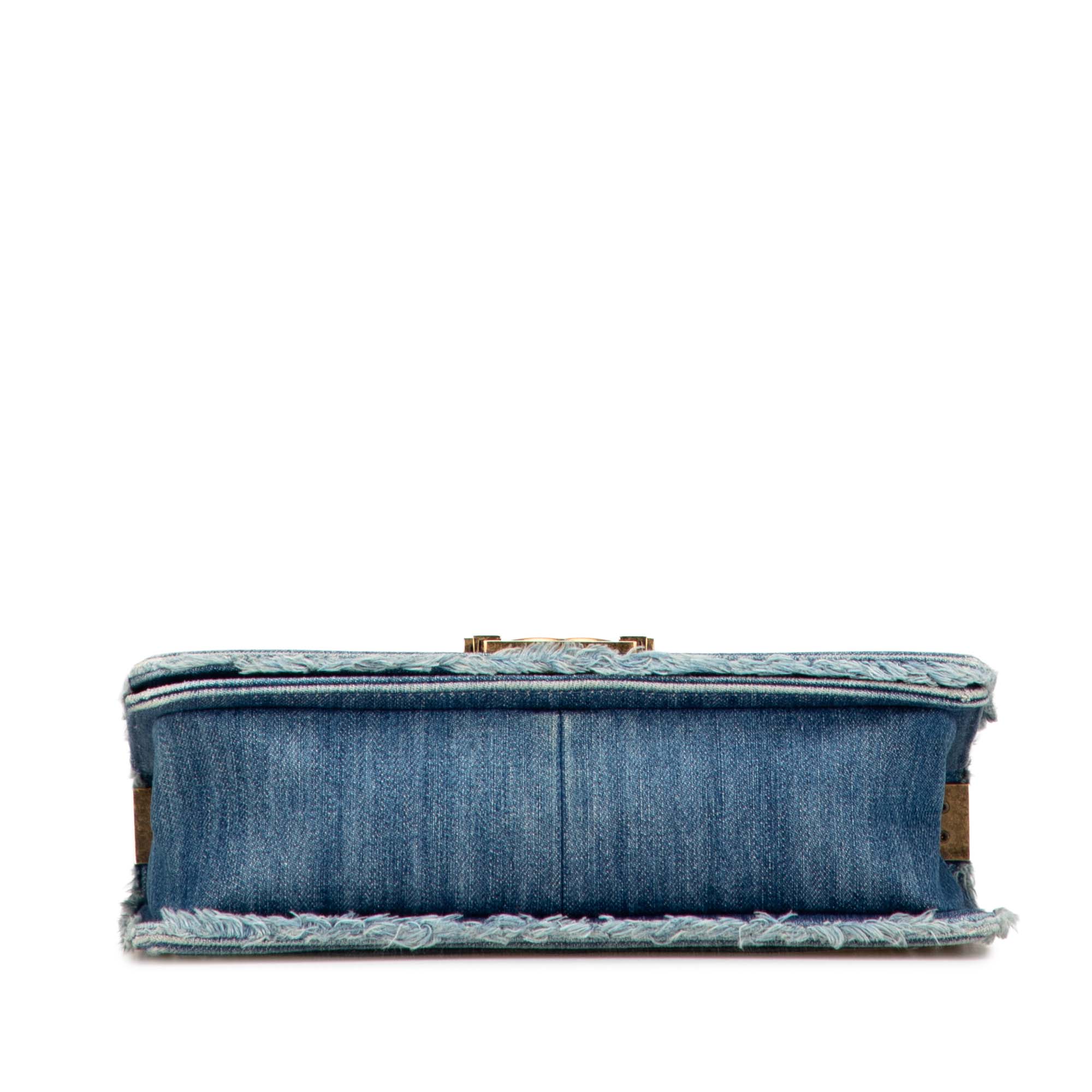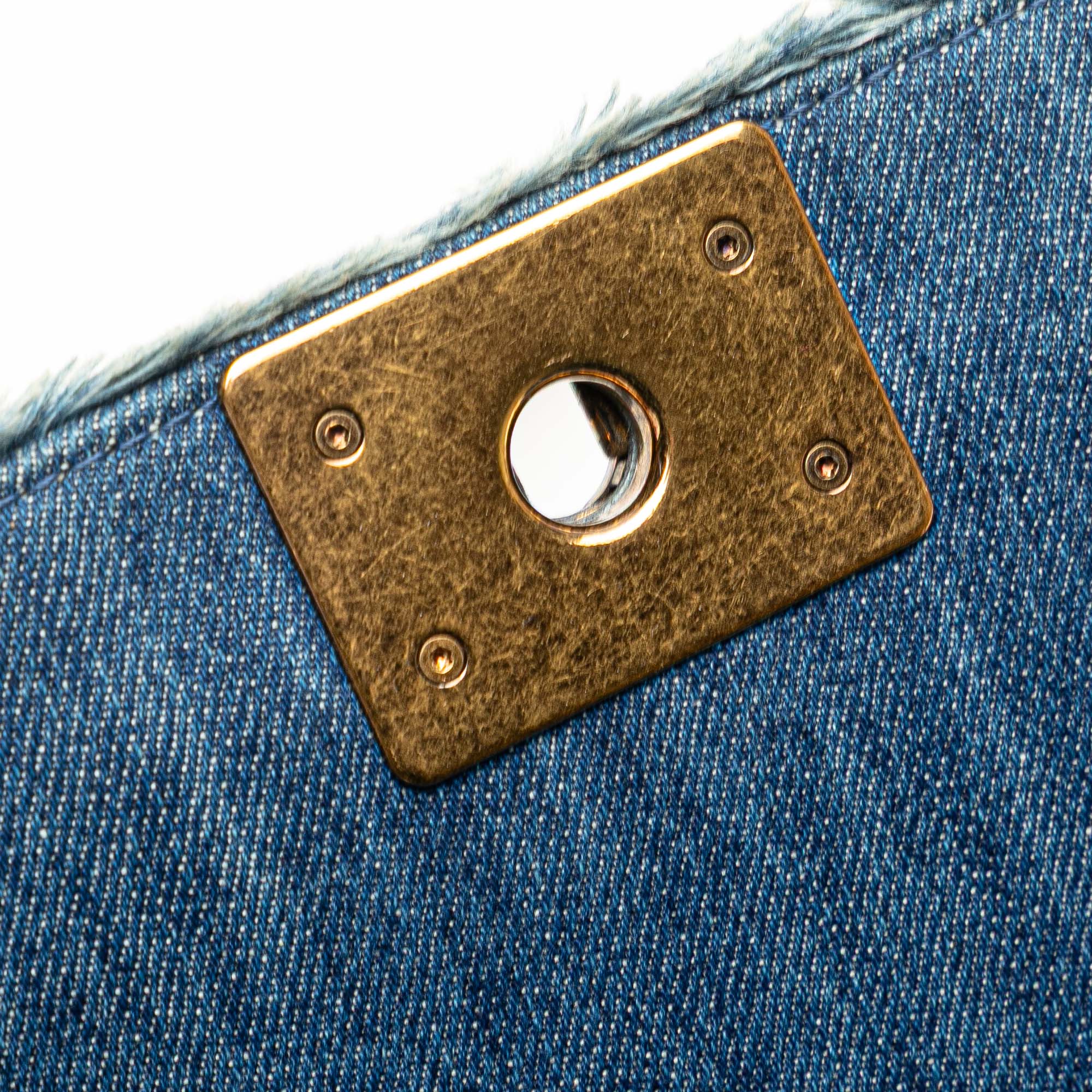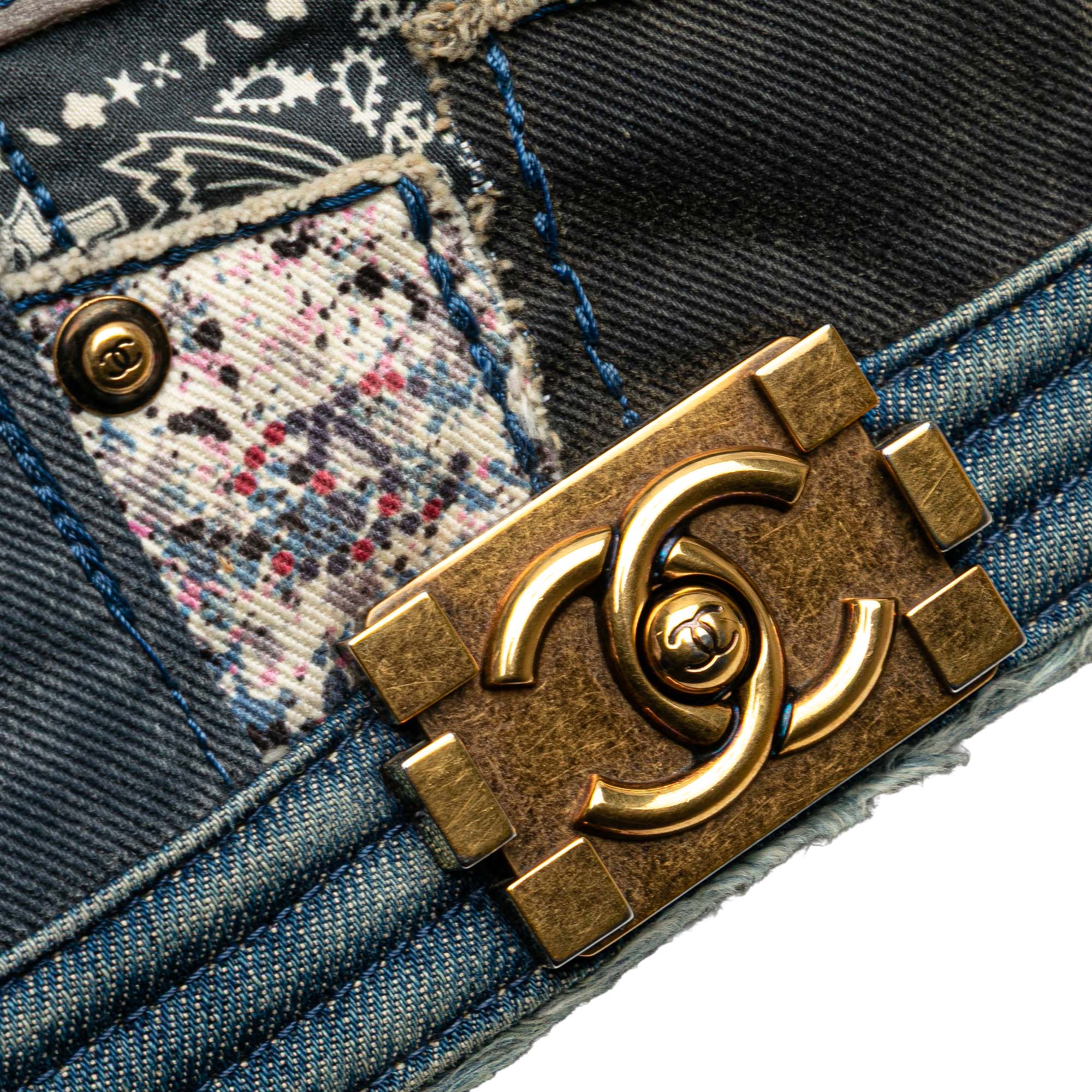 The Boy flap features a patchwork denim body, a gold-tone curb chain strap, a front flap with magnetic snap closure, and an interior slip pocket. Retail Price: 4600.00