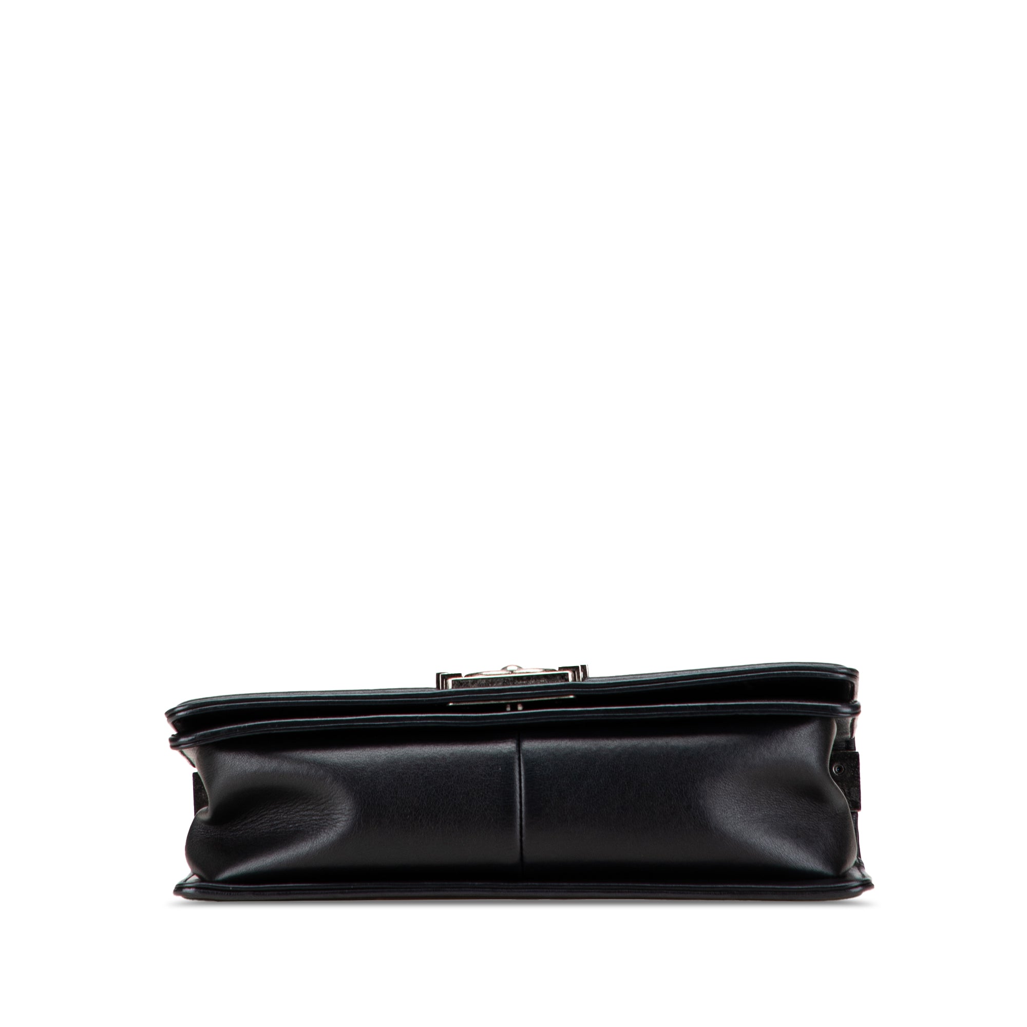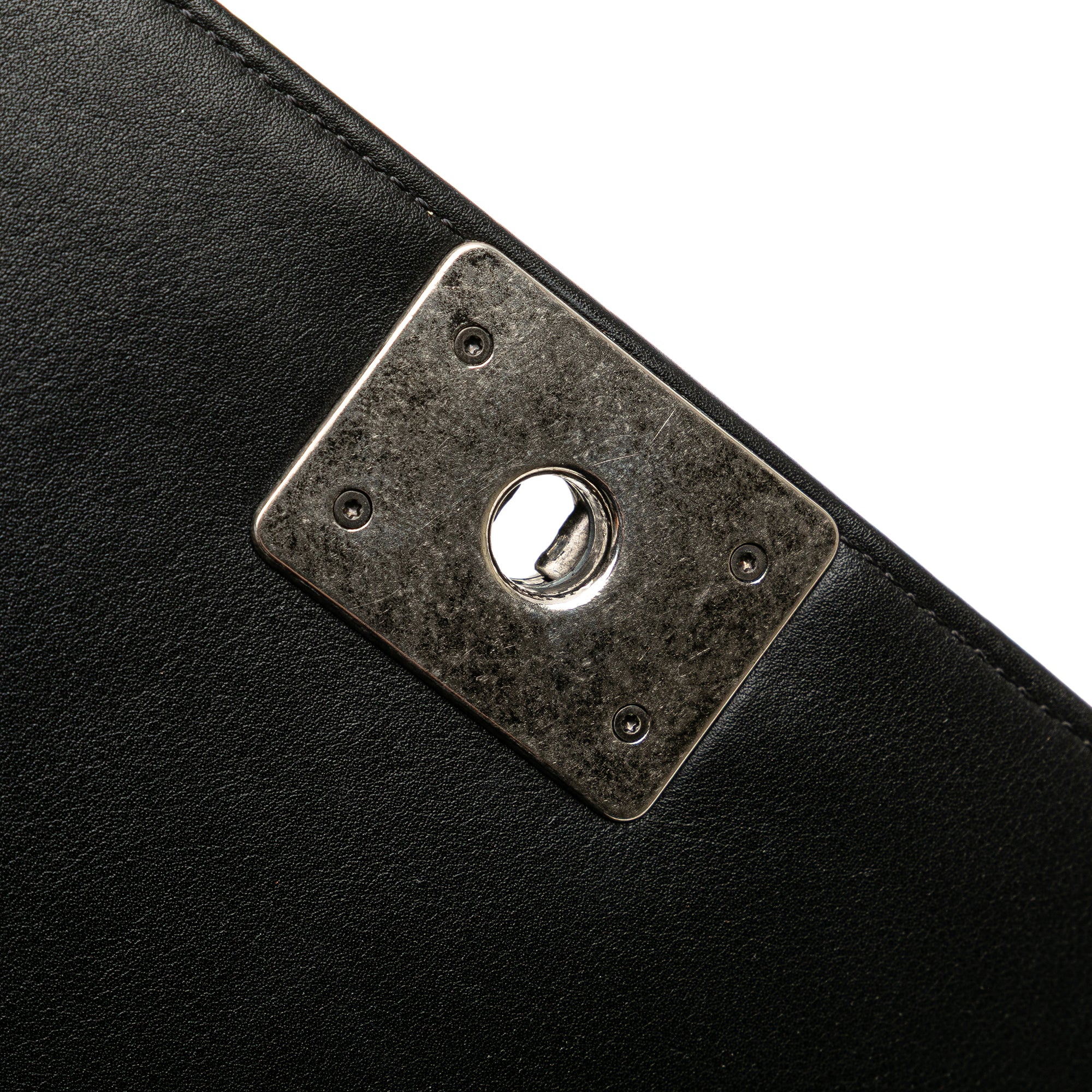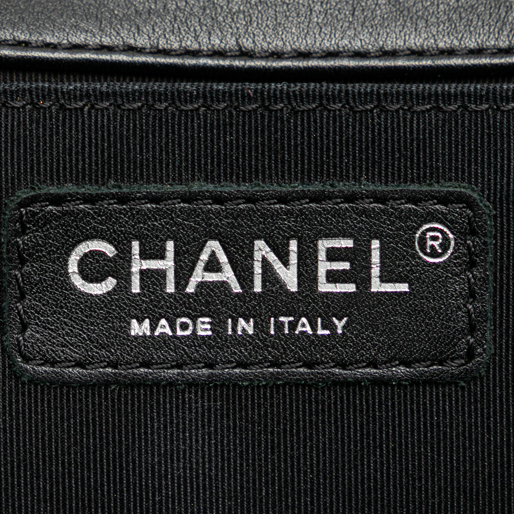 The Boy flap features a quilted lambskin leather body, a silver-tone curb chain link shoulder strap with leather guard, a front flap with a turn lock closure, and an interior zip pocket. Retail Price: 6600.00