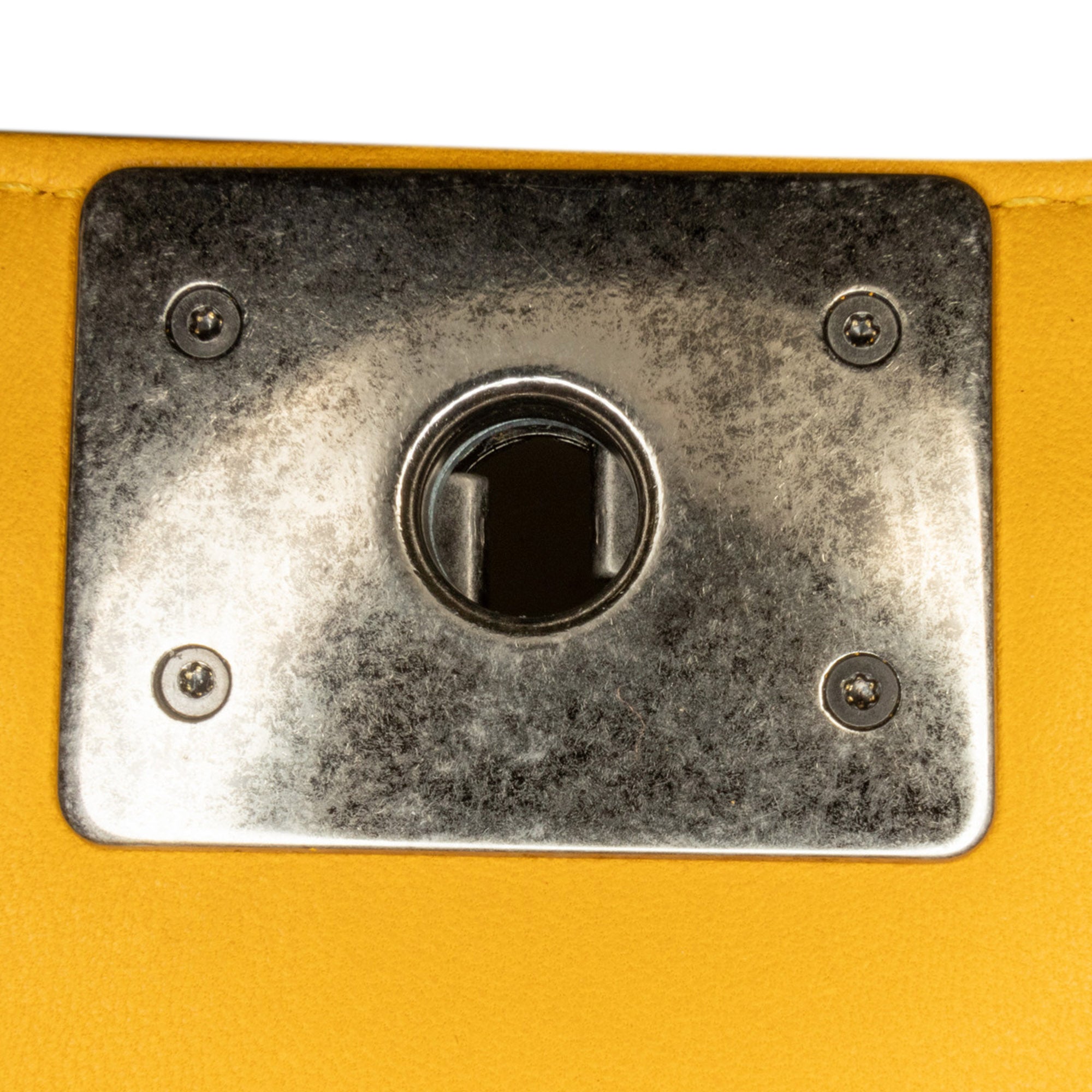 The Boy flap features a quilted lambskin leather body, a curb chain strap, and a front flap with push lock closure, and an interior slip pocket. Retail Price: 6900.00