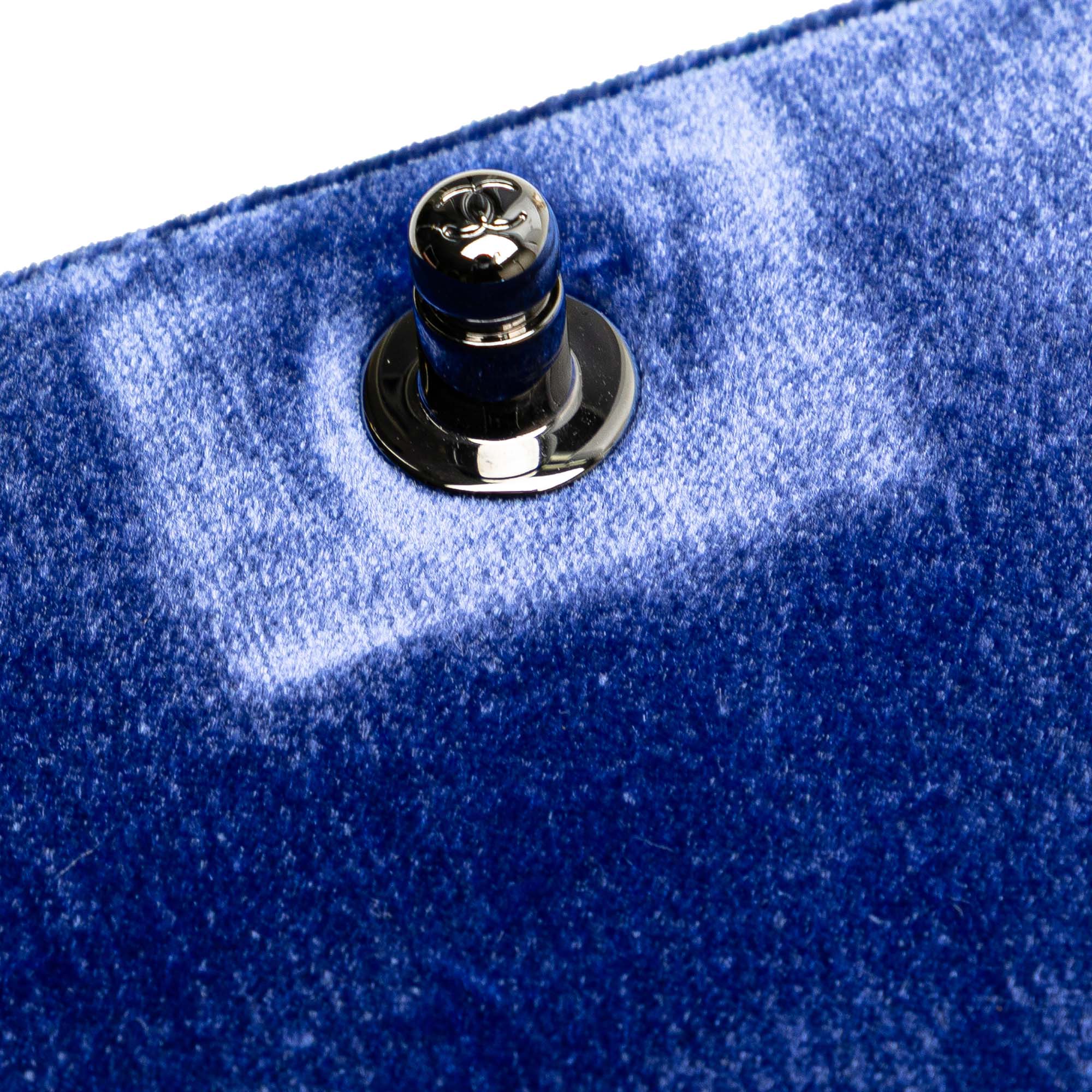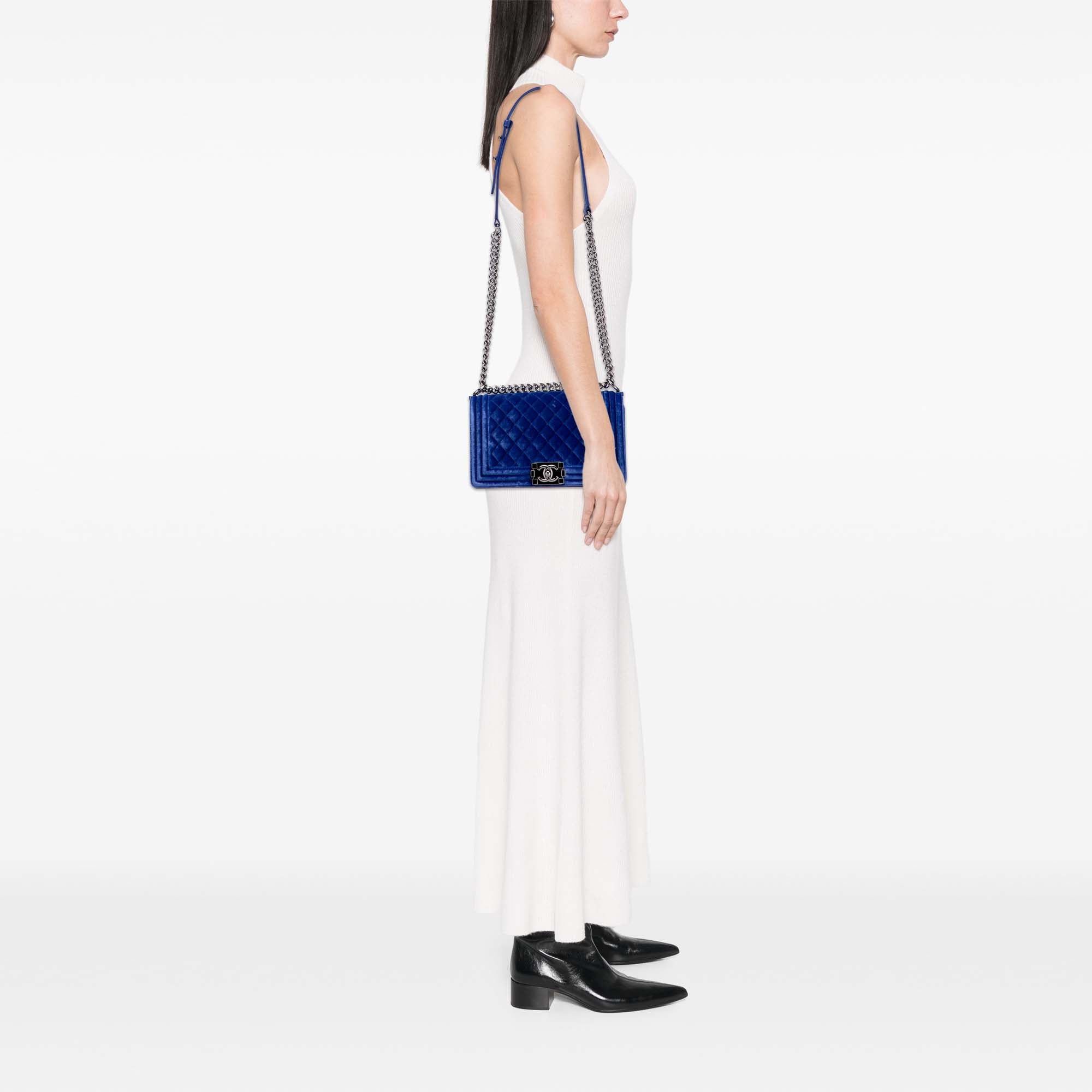 The Boy flap features a quilted velvet body, a curb chain strap, a front flap with push lock closure, and an interior slip pocket. Inclusion: Dust bag. Retail Price: 3650.00