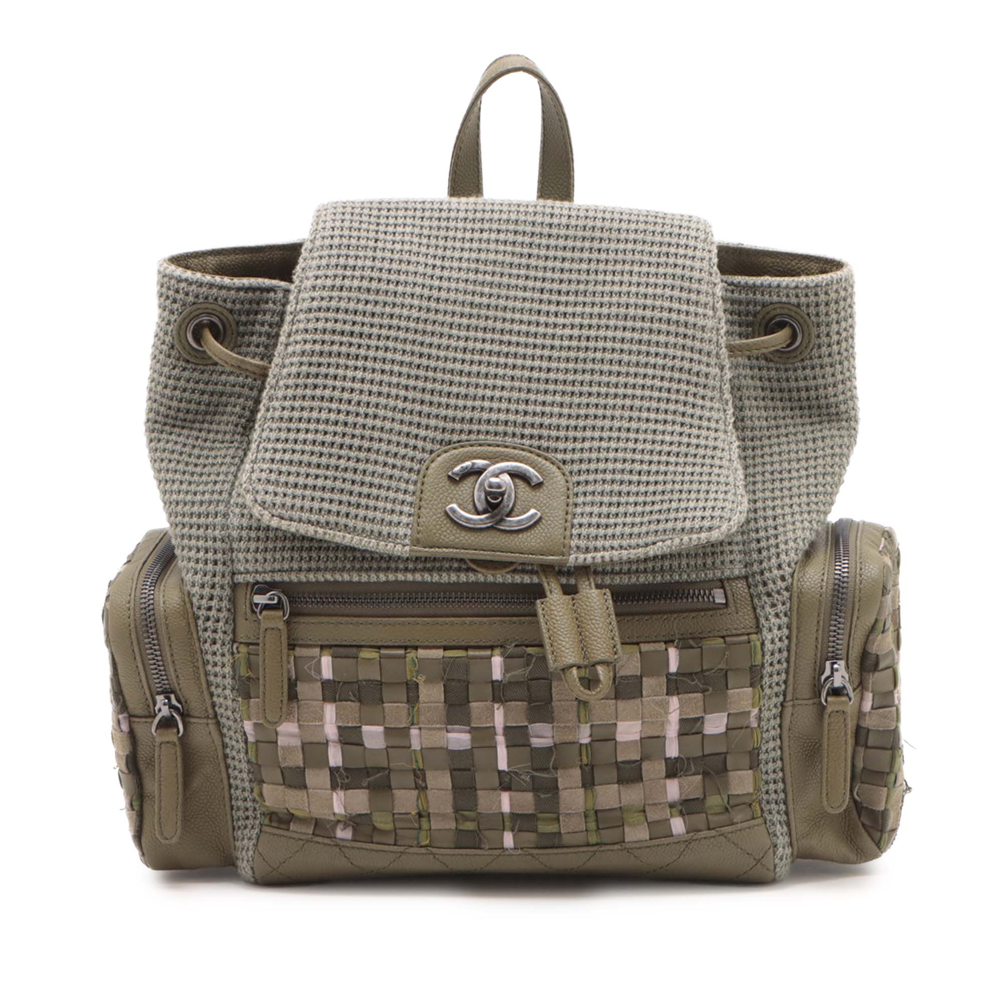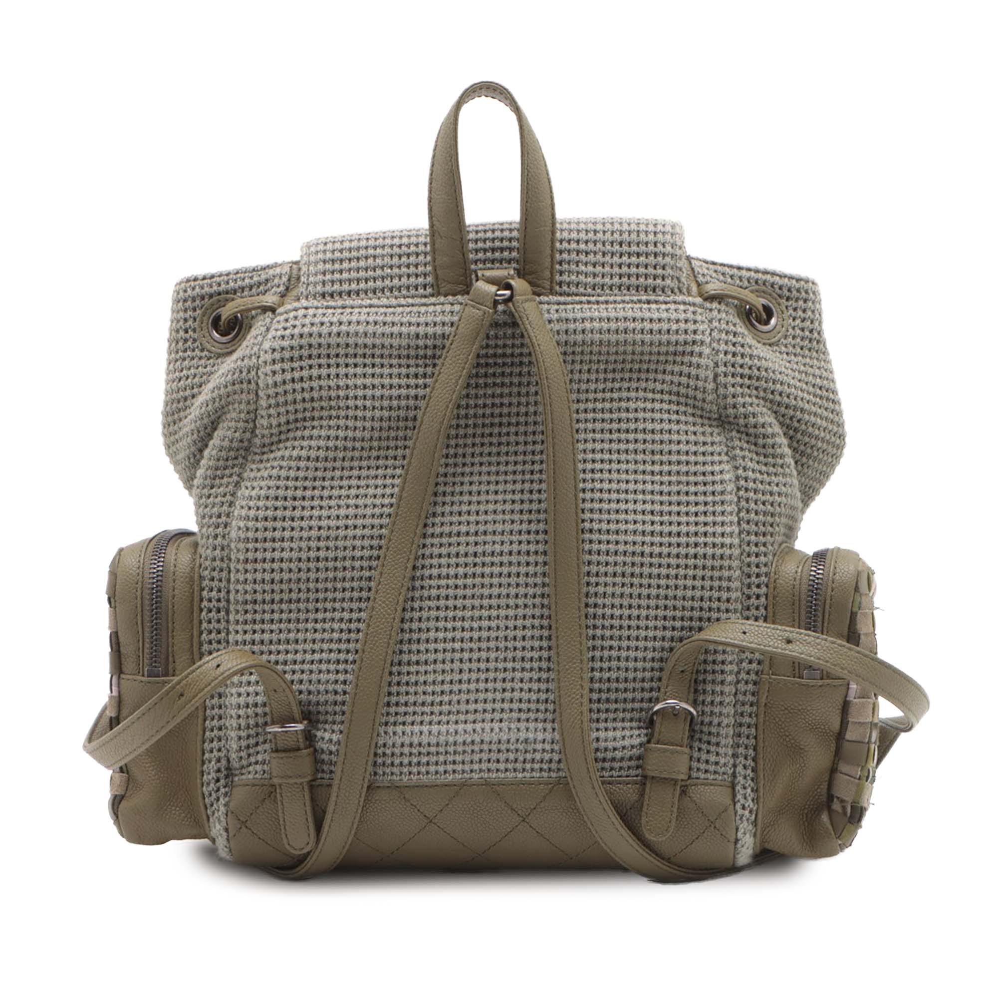 This backpack features a tweed body, a flat leather top handle, adjustable flat leather back straps, a top flap with CC turn-lock closure, a drawstring closure, exterior zip pockets, and interior zip and slip pockets. Inclusion: authenticity card. Retail Price: 6100.00