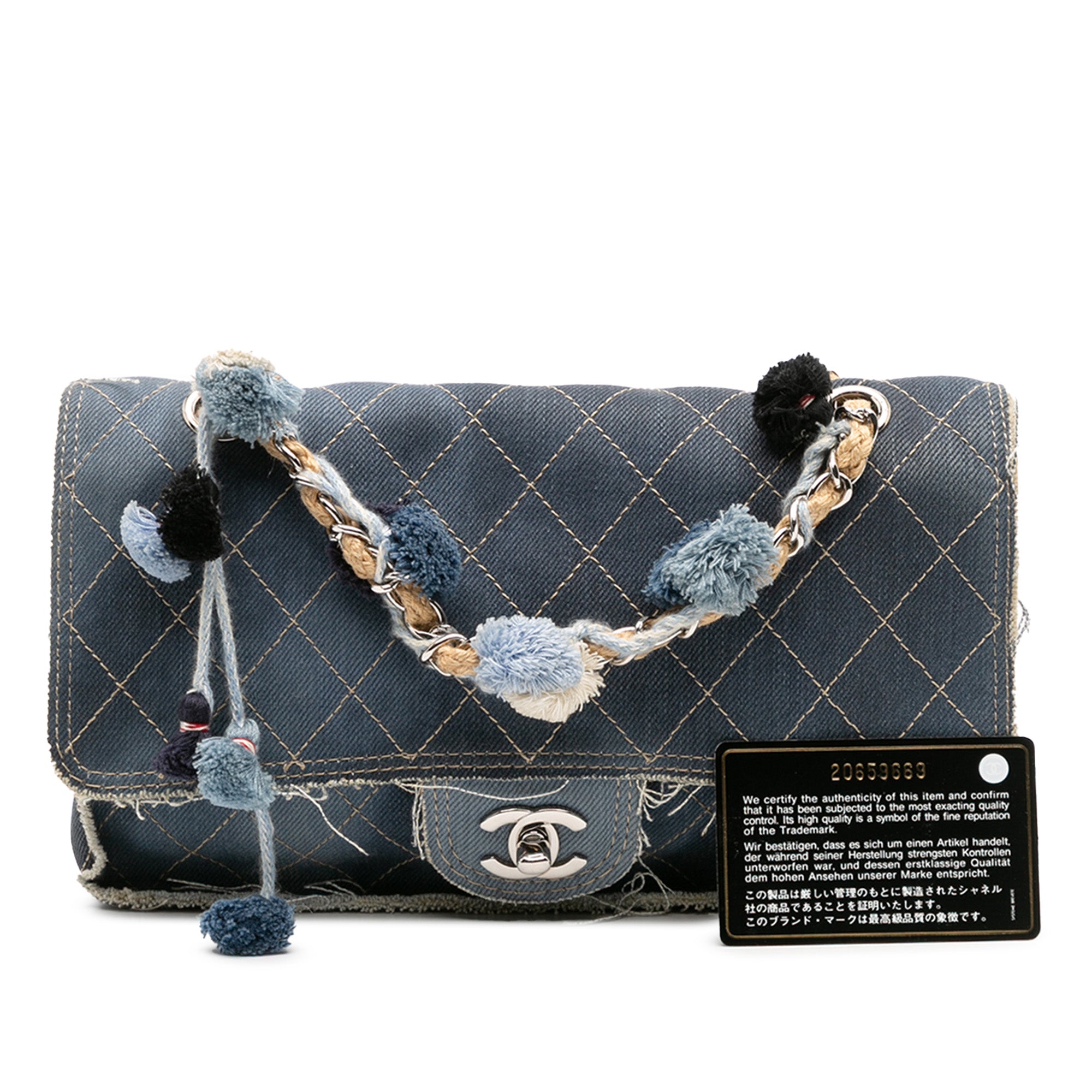 This shoulder bag features a quilted denim body, a rope woven chain strap, a front flap with twist lock closure, an exterior back slip pocket, and an interior zip pocket. Inclusion: authenticity card. Retail Price: 3900.00