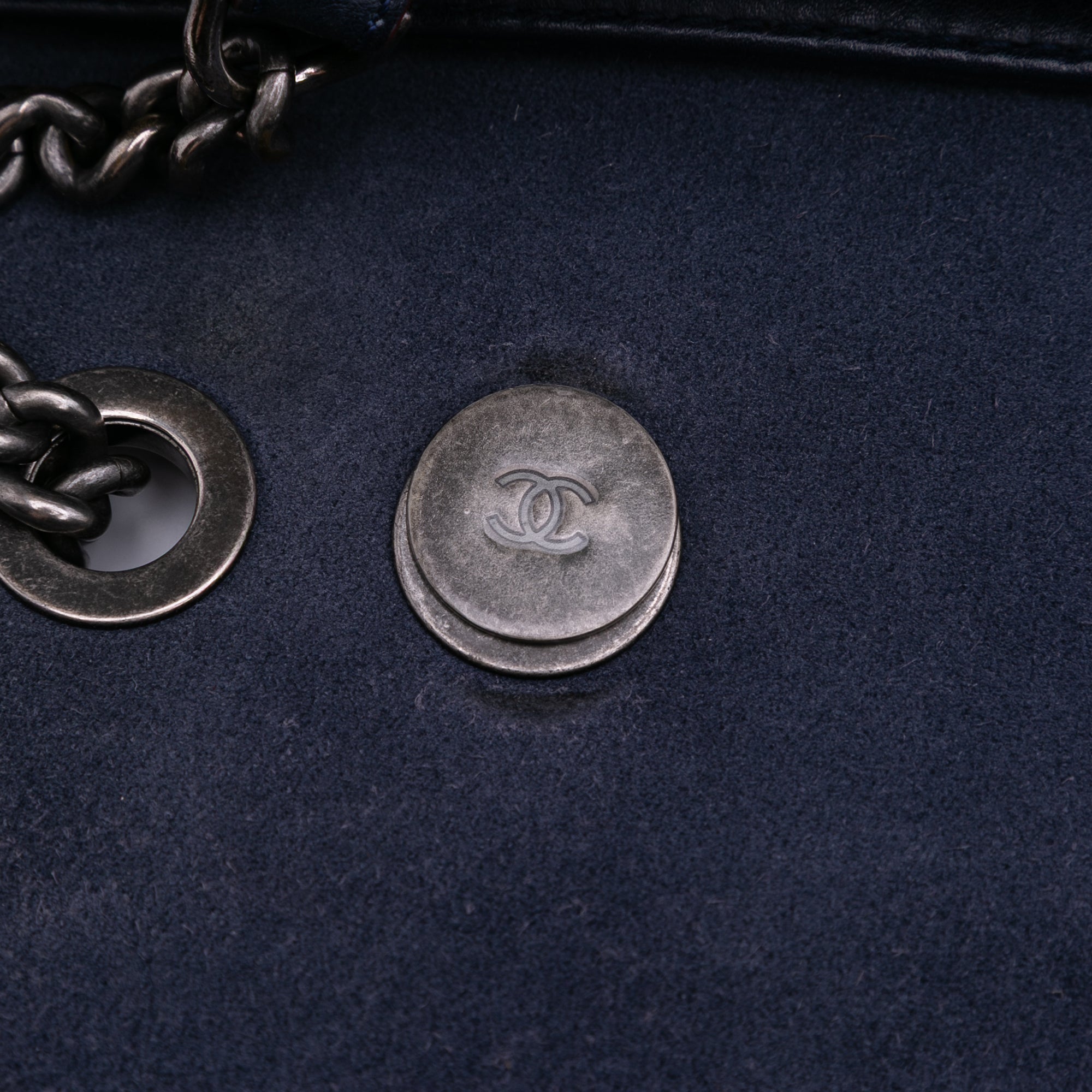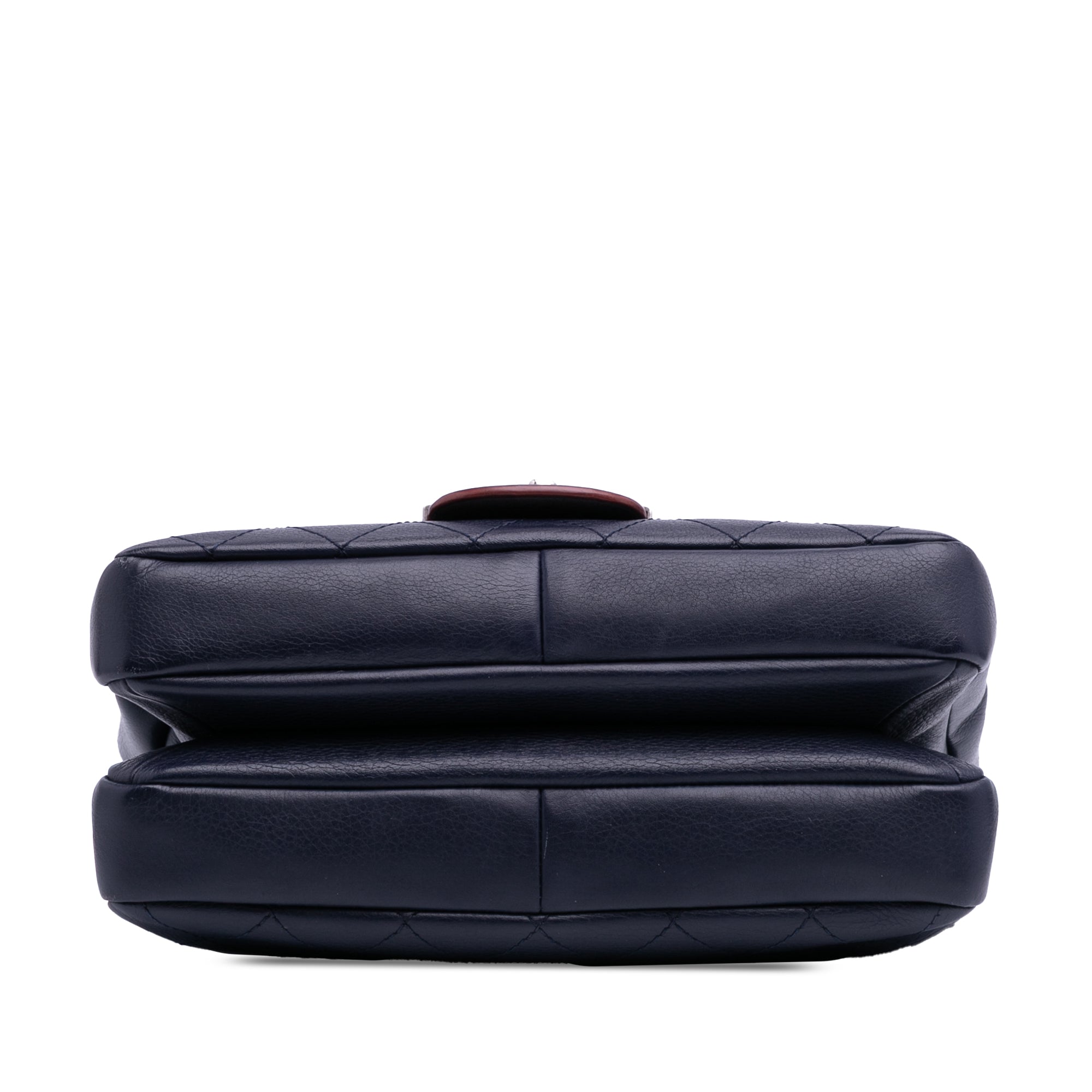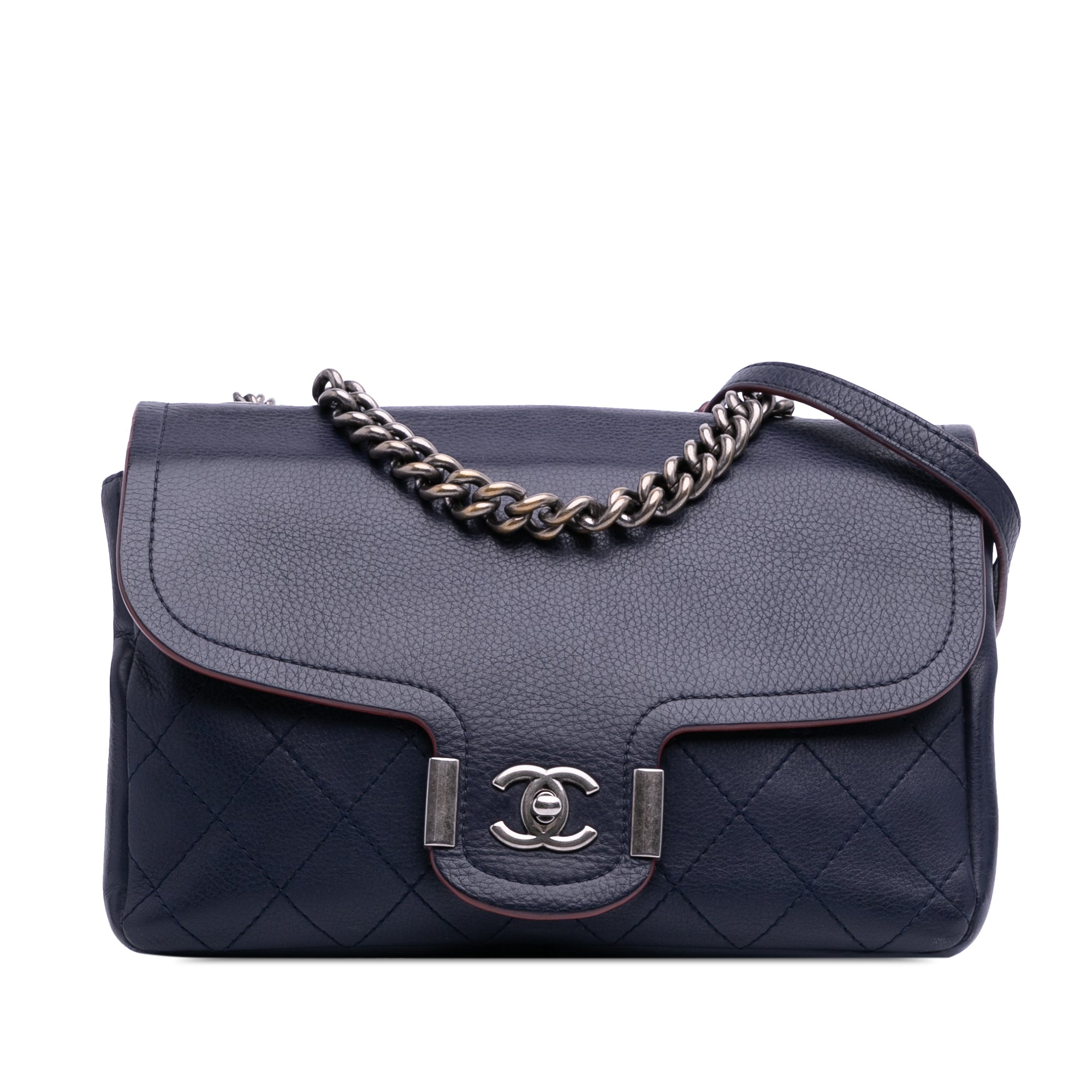 This flap bag features a leather body, a chain-link handle, a chain strap with leather shoulder guard, a front flap with CC turn-lock closure, and interior zip and slip pockets. Retail Price: 3800.00