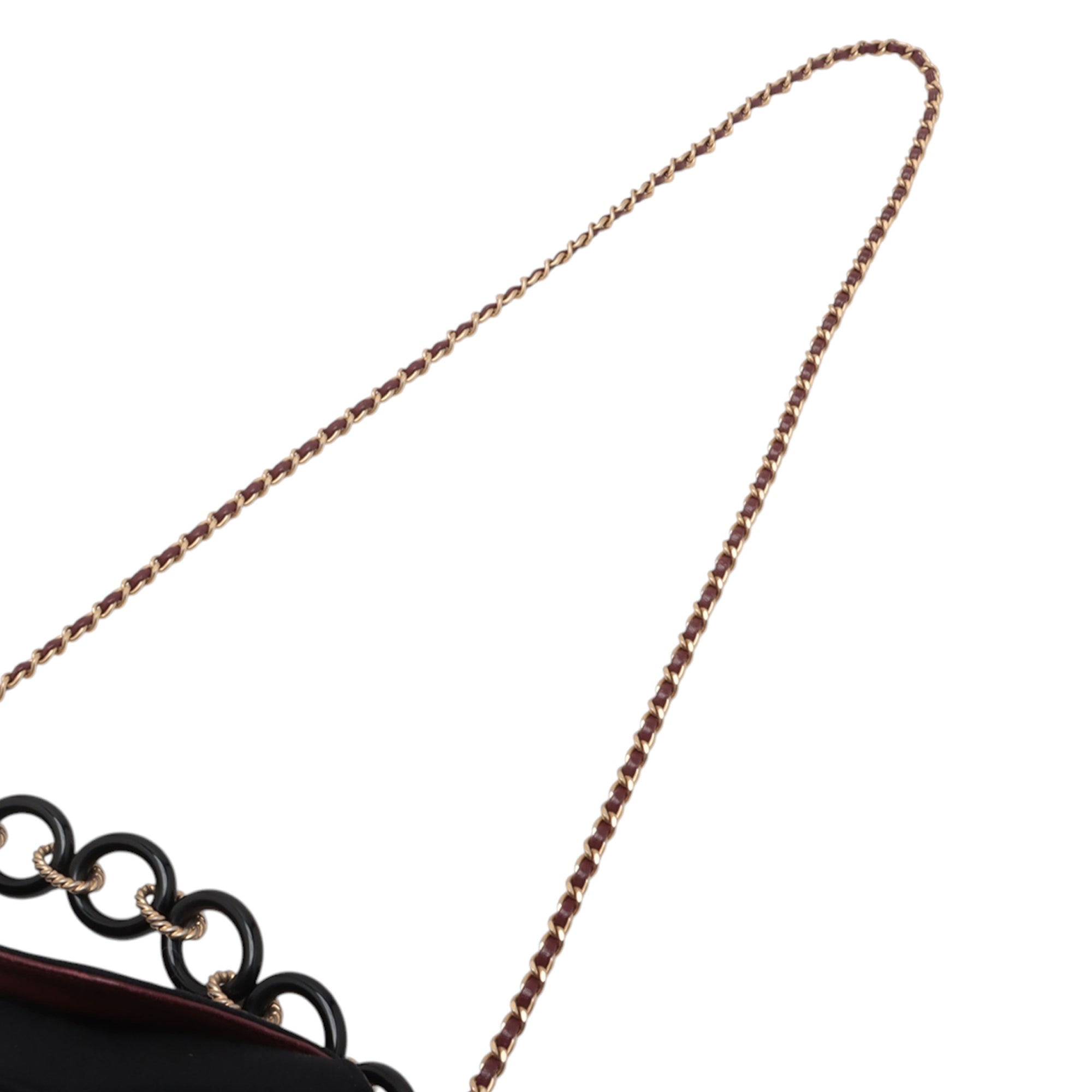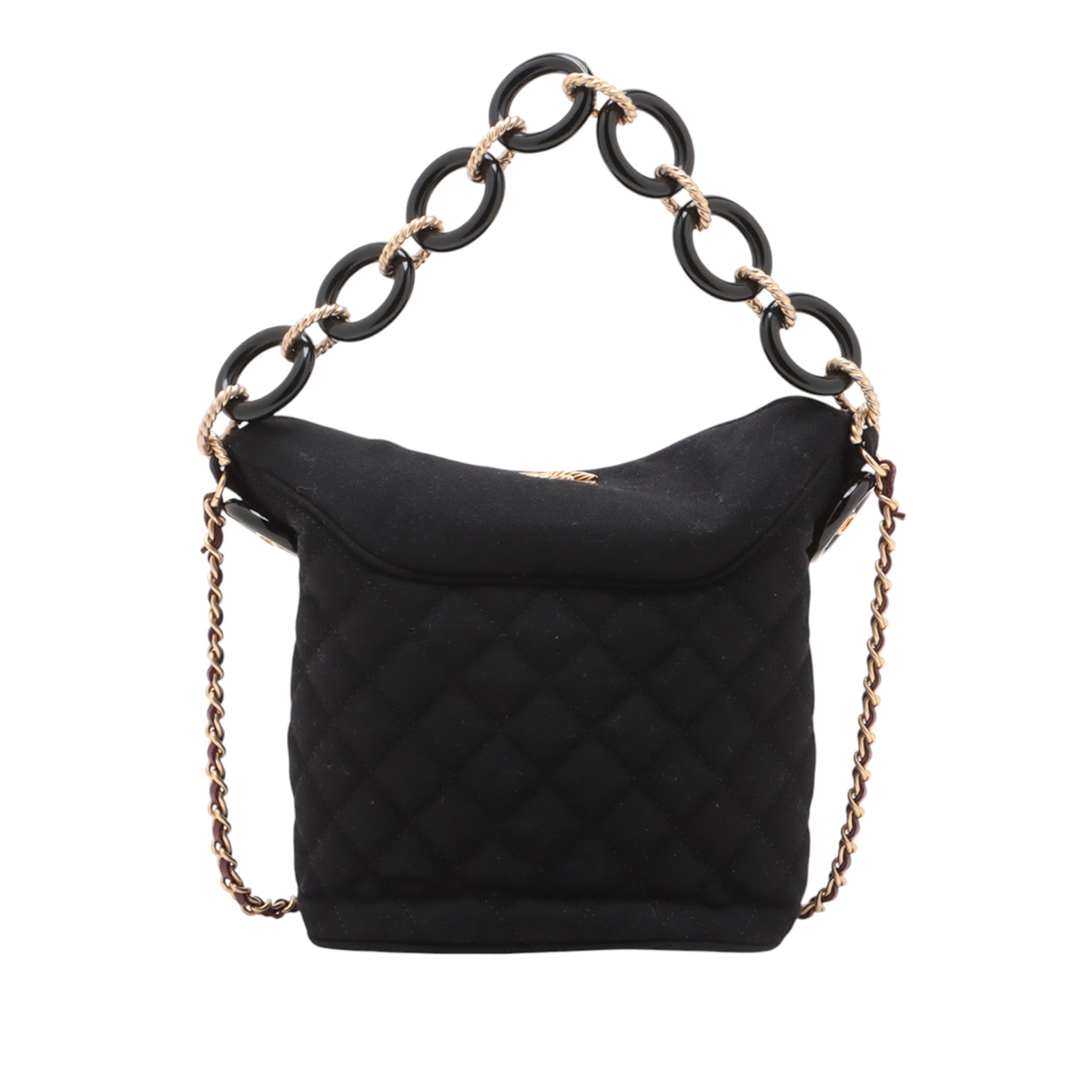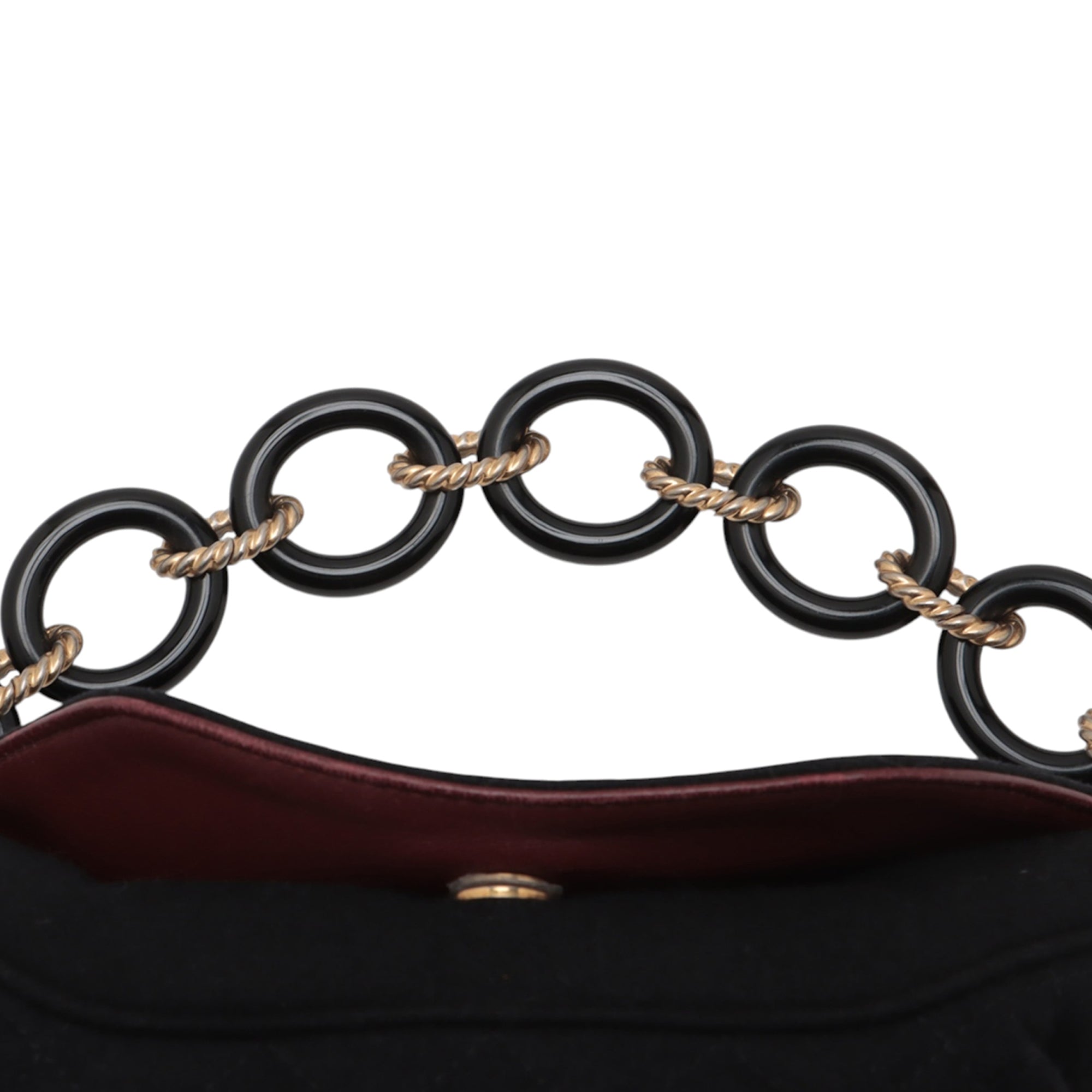 This bucket bag features a quilted wool body with lambskin leather trim, a resin chain link handle, a leather woven shoulder strap, a fold over flap with magnetic snap closure, and an interior slip pocket. Retail Price: 4300.00