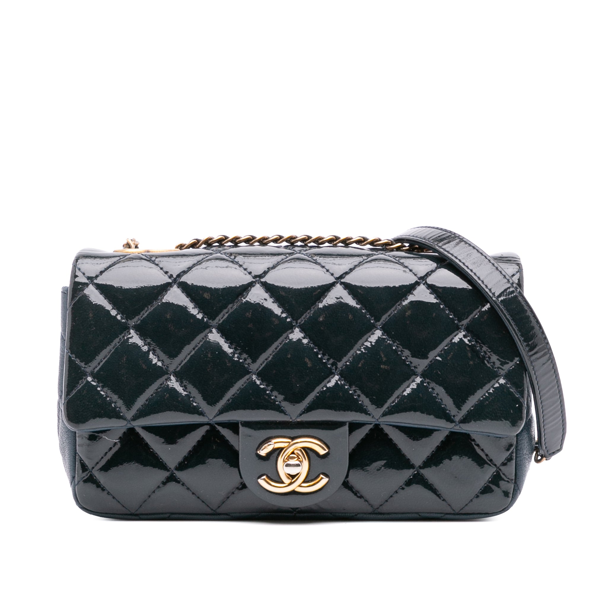 This flap bag features a quilted patent leather body, a curb chain strap with leather guard, a front flap with interlocking Cs and twist lock closure, an exterior back slip pocket, and an interior zip pocket. Inclusion: authenticity card. Retail Price: 4438.00