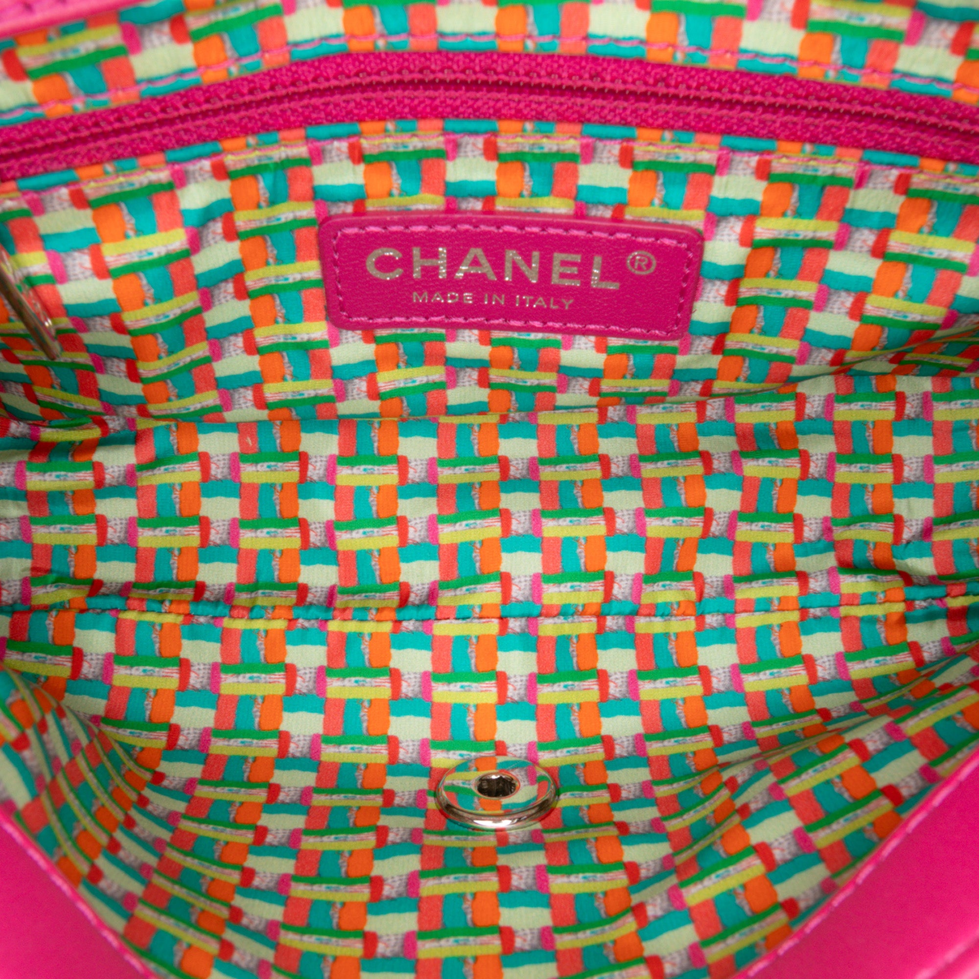 This flap bag features a quilted rubber body, a leather-woven chain strap with leather guard, a front flap with interlocking Cs and a twist lock closure, an exterior back zip pocket, and an interior zip pocket. Retail Price: 4000.00