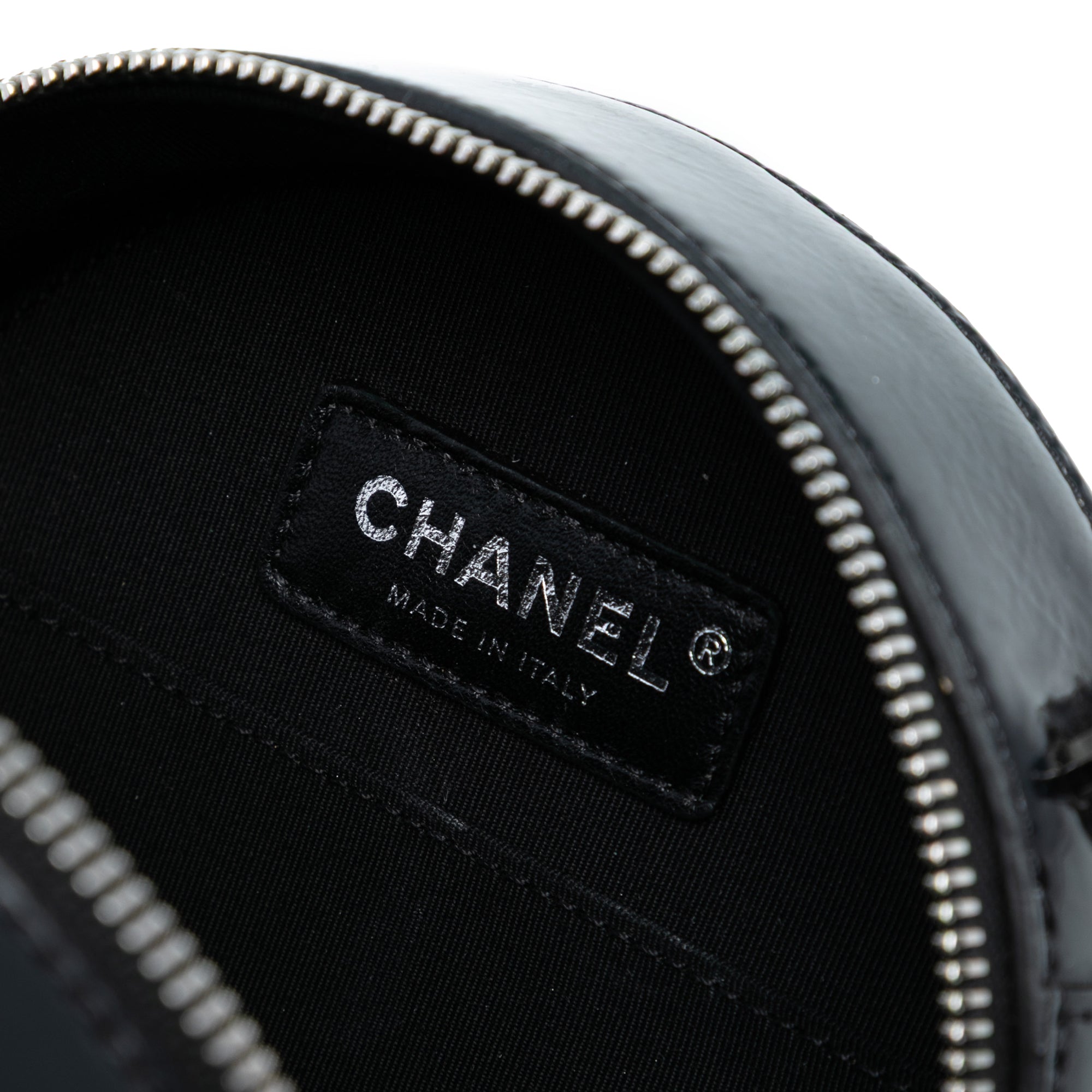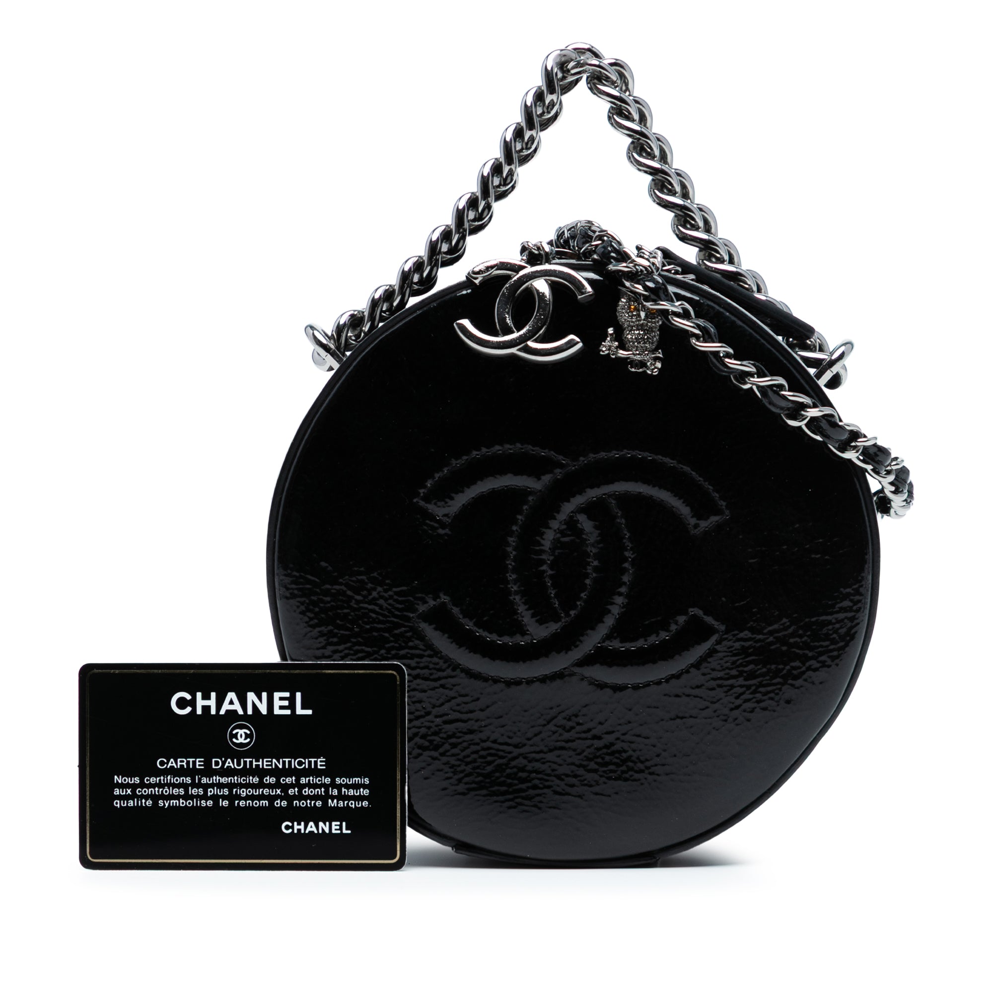 The Round As Earth features a patent leather body, a chain link handle, a leather woven chain link strap, and a top zip closure. Inclusion: authenticity card. Retail Price: 3700.00