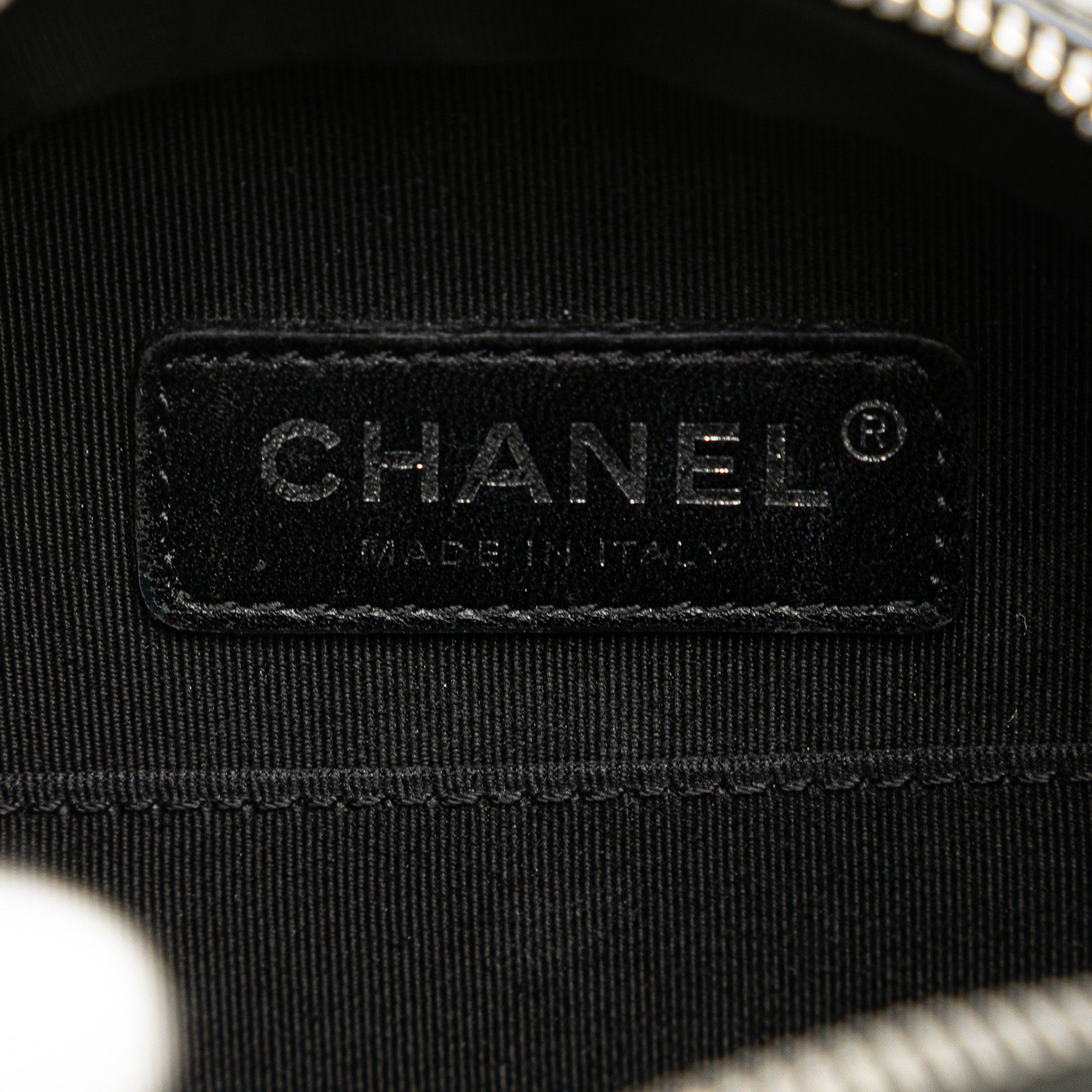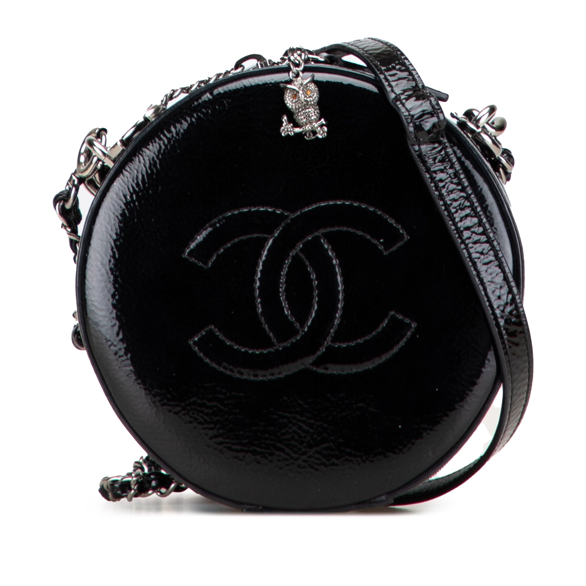 This satchel features a patent leather body, a silver-tone curb chain link handle, a silver-tone leather woven chain shoulder strap with leather guard, and a top zip closure. Retail Price: 4500.00