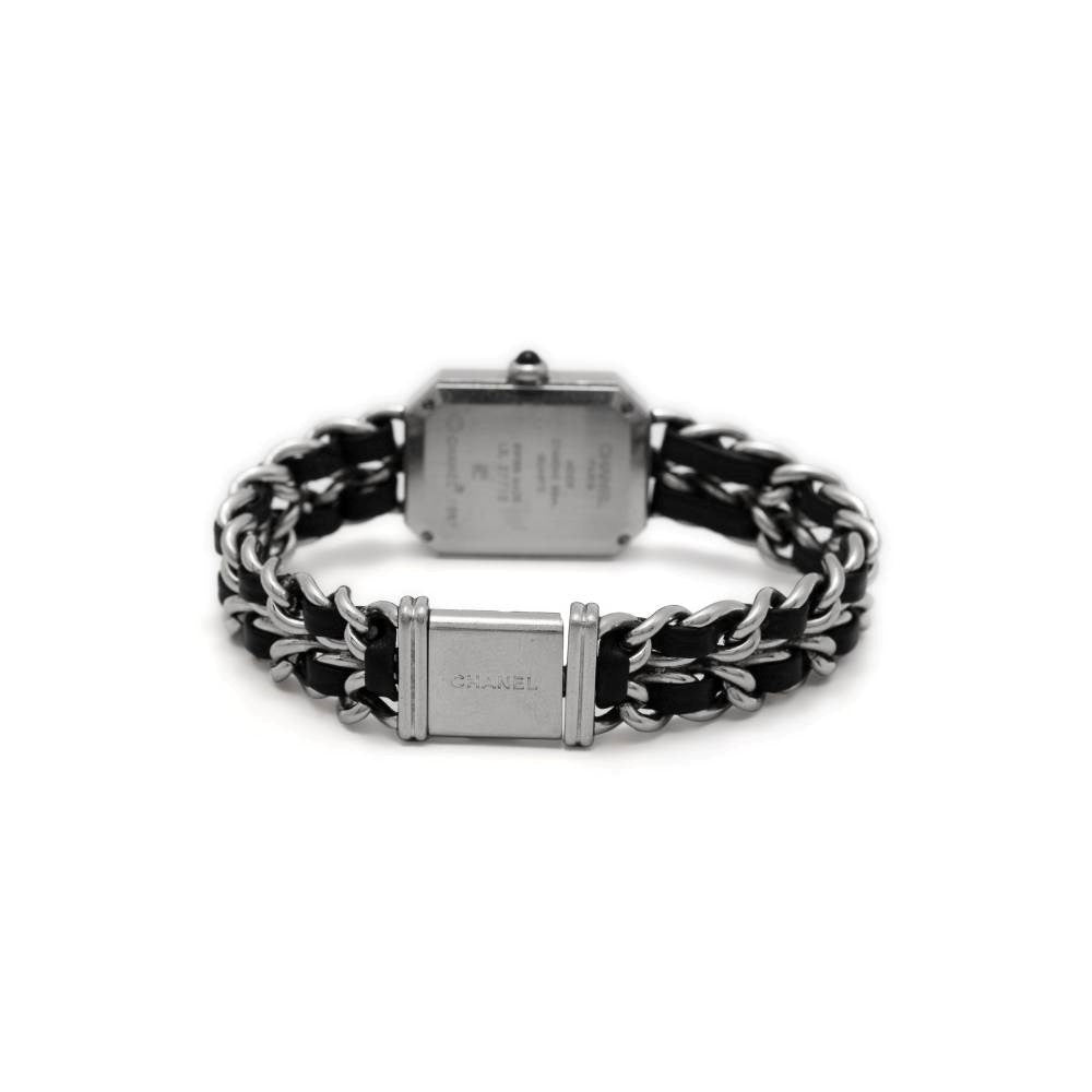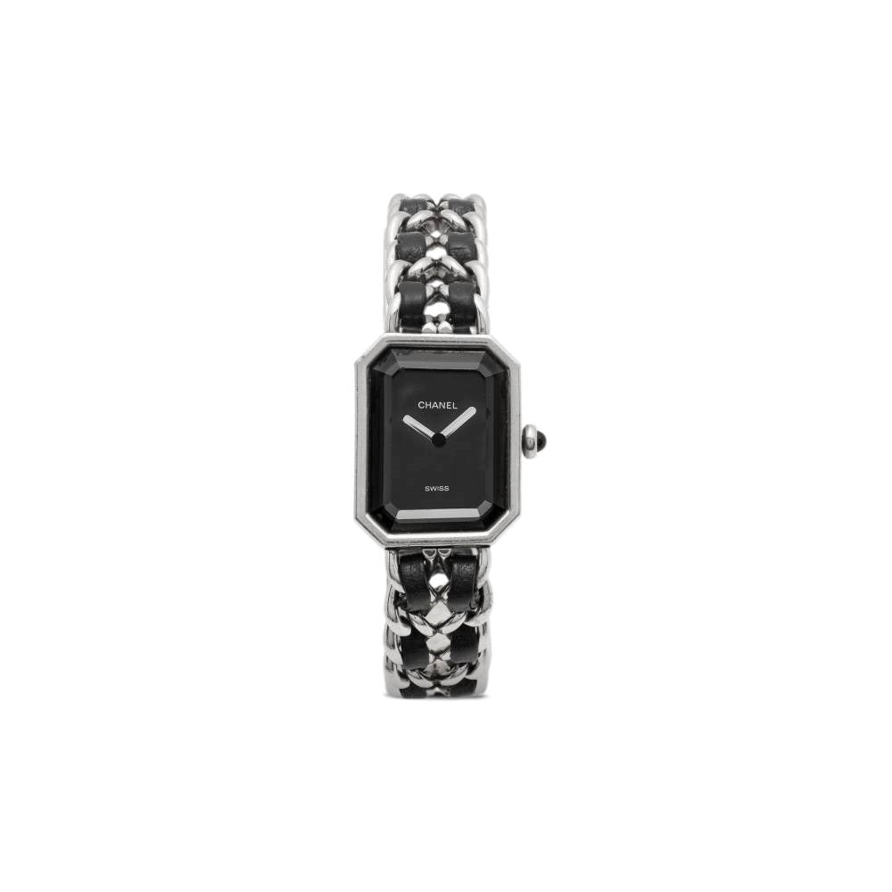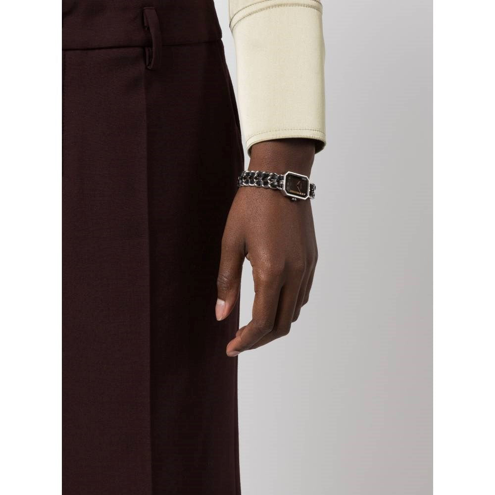 Chanel "Première 26mm" steel and leather 90s watch. Steel dial with rectangular design, stick hands, braided chain bracelet in leather, quartz movement press fastener. - Year: 1987