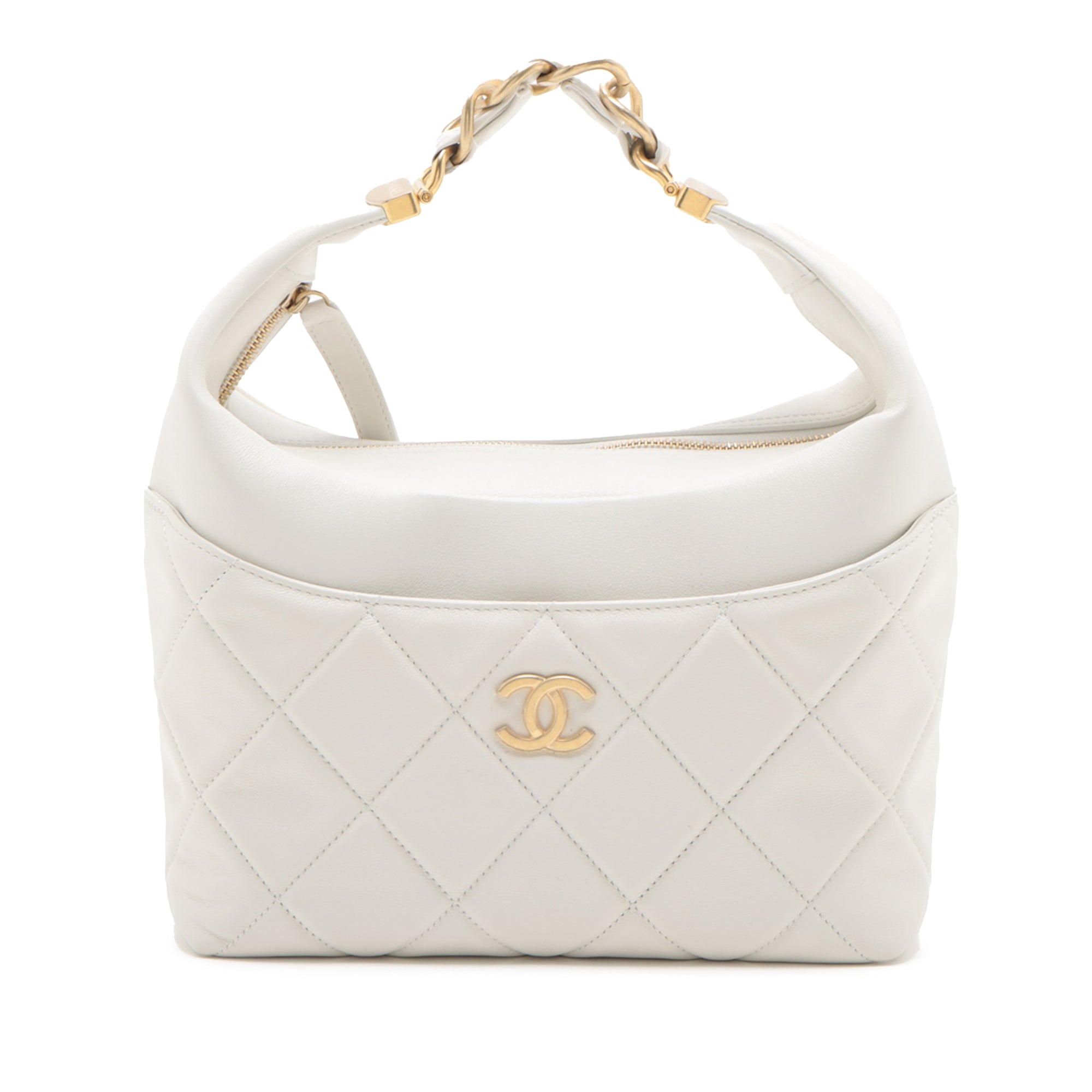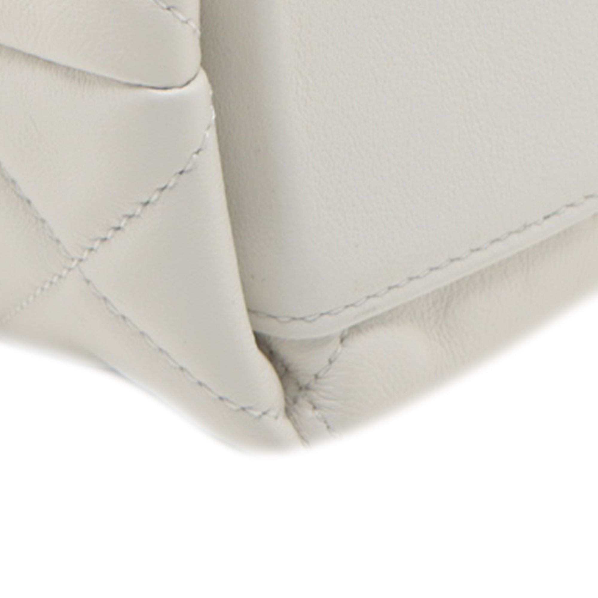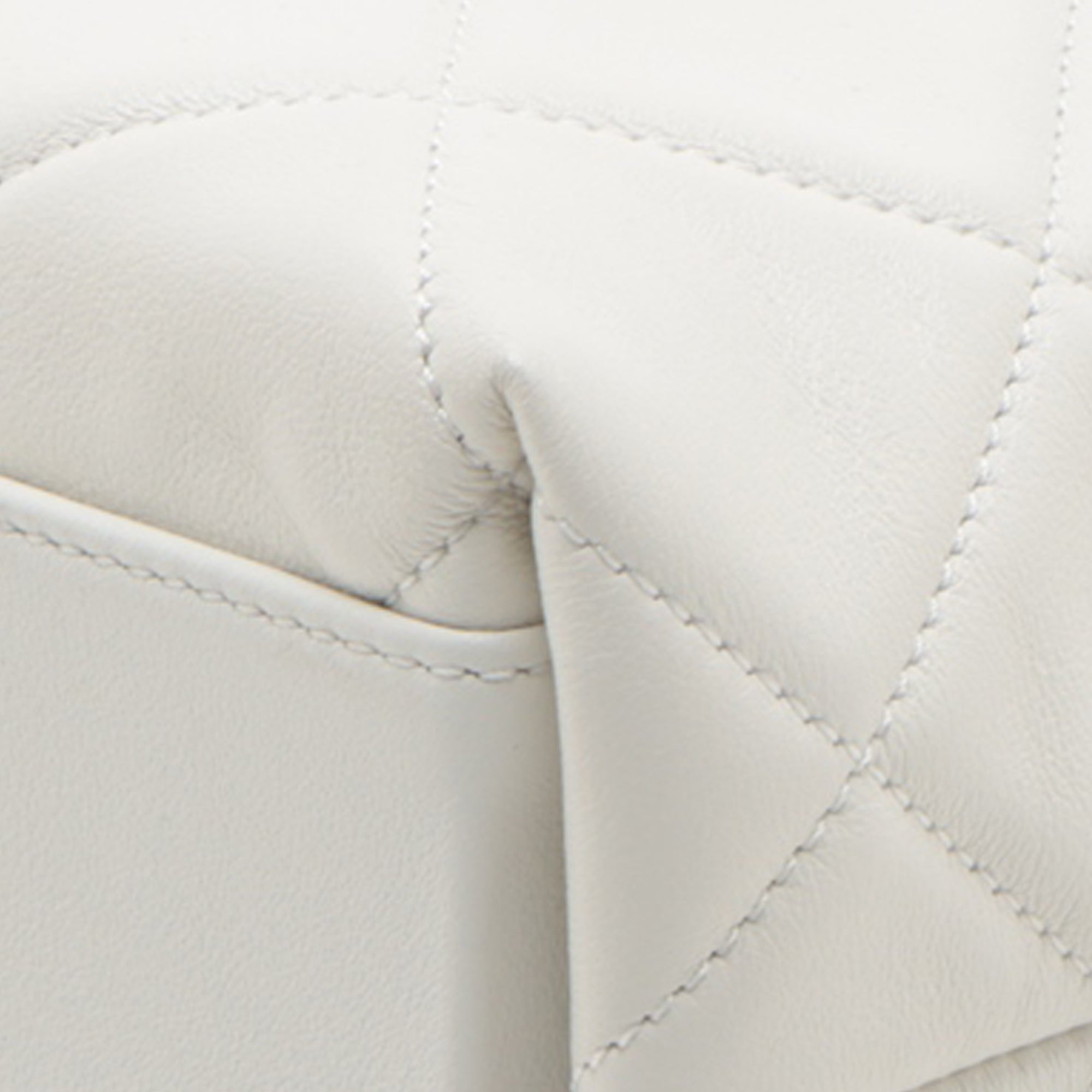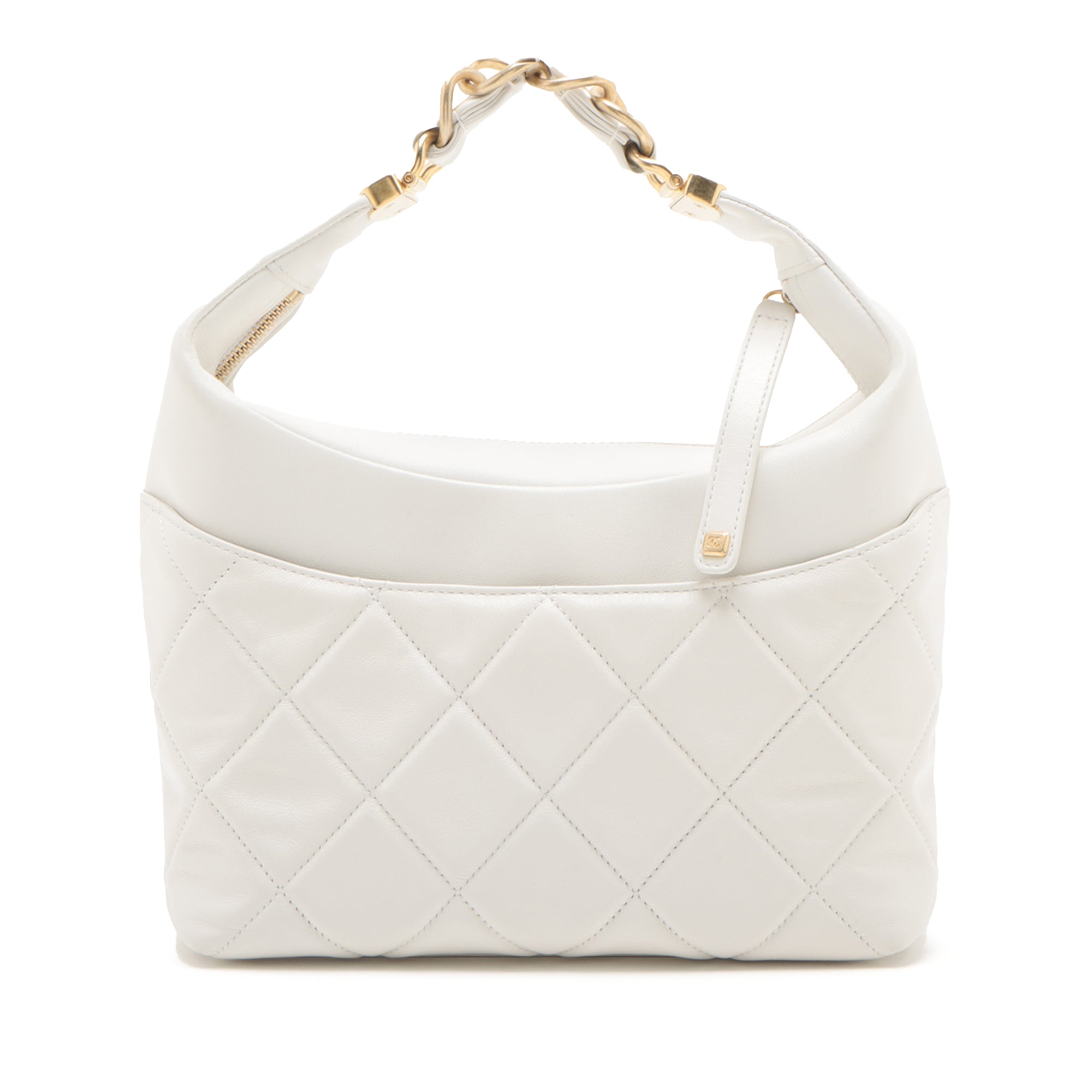 This handbag features a quilted leather body, a leather-woven chain handle, a top zip closure, exterior slip pockets with snap button closure, and an interior slip pocket. Retail Price: 4260.00