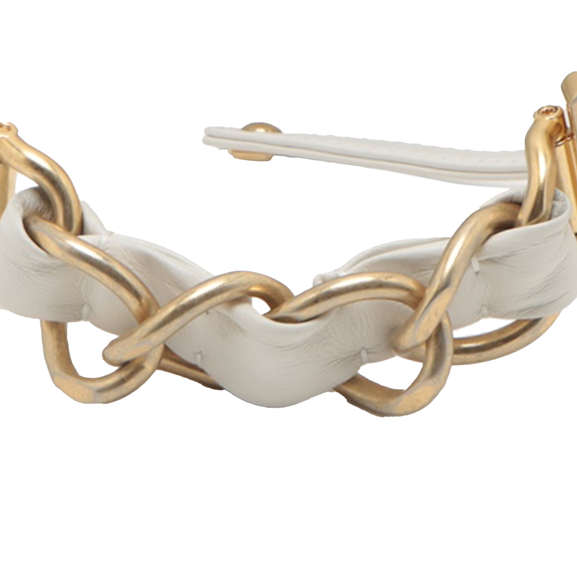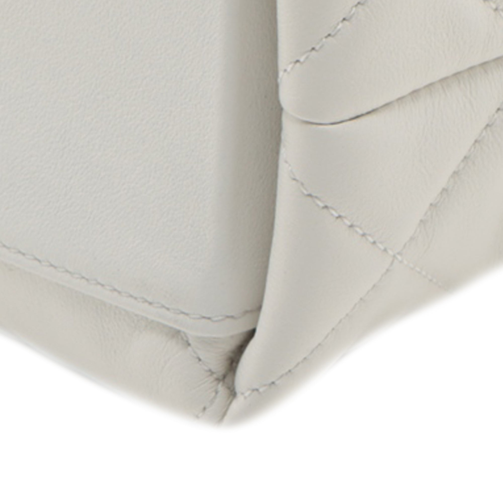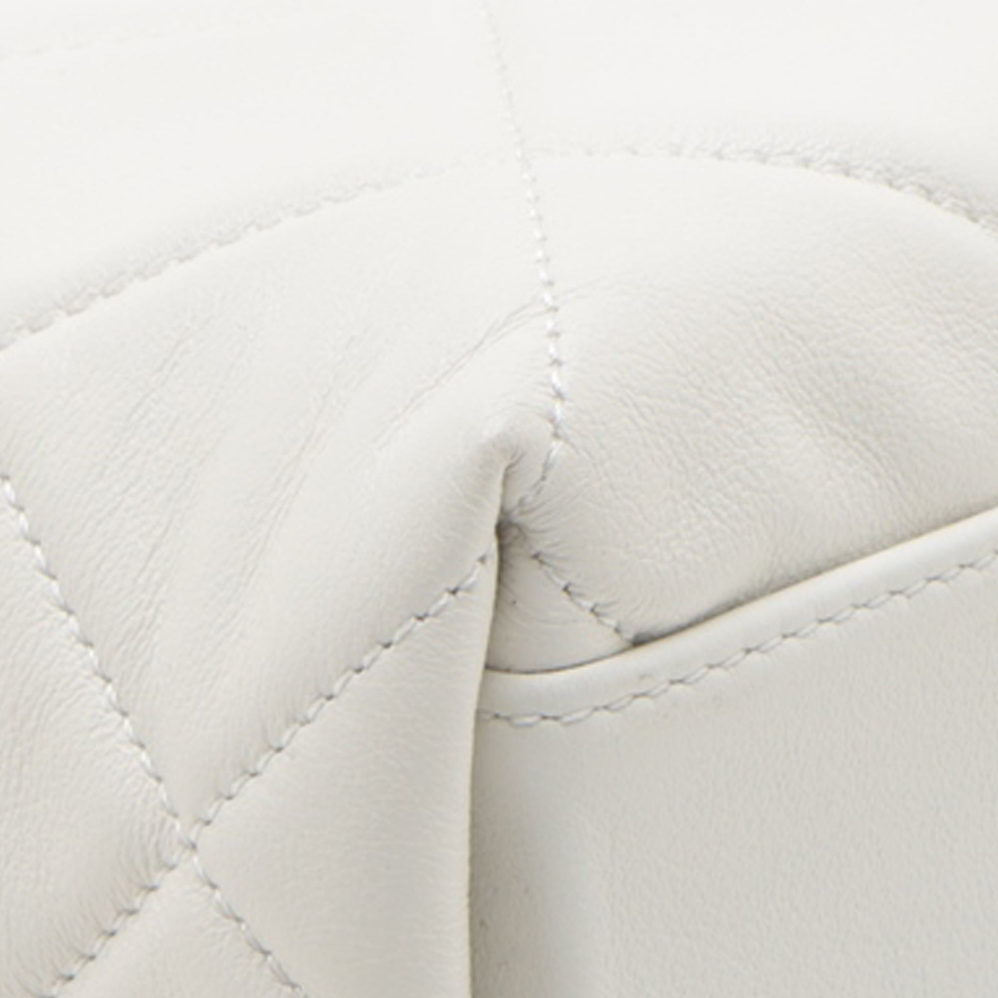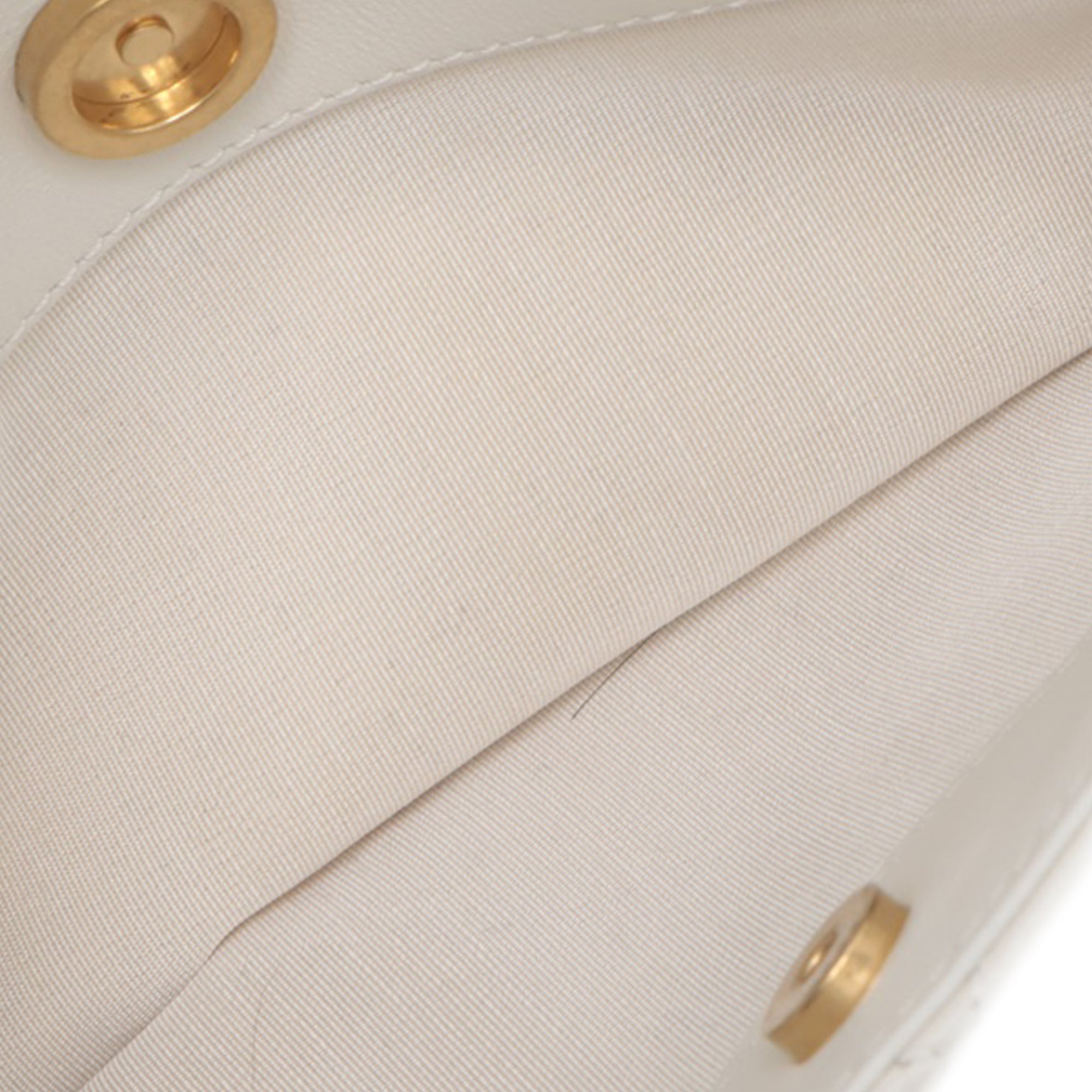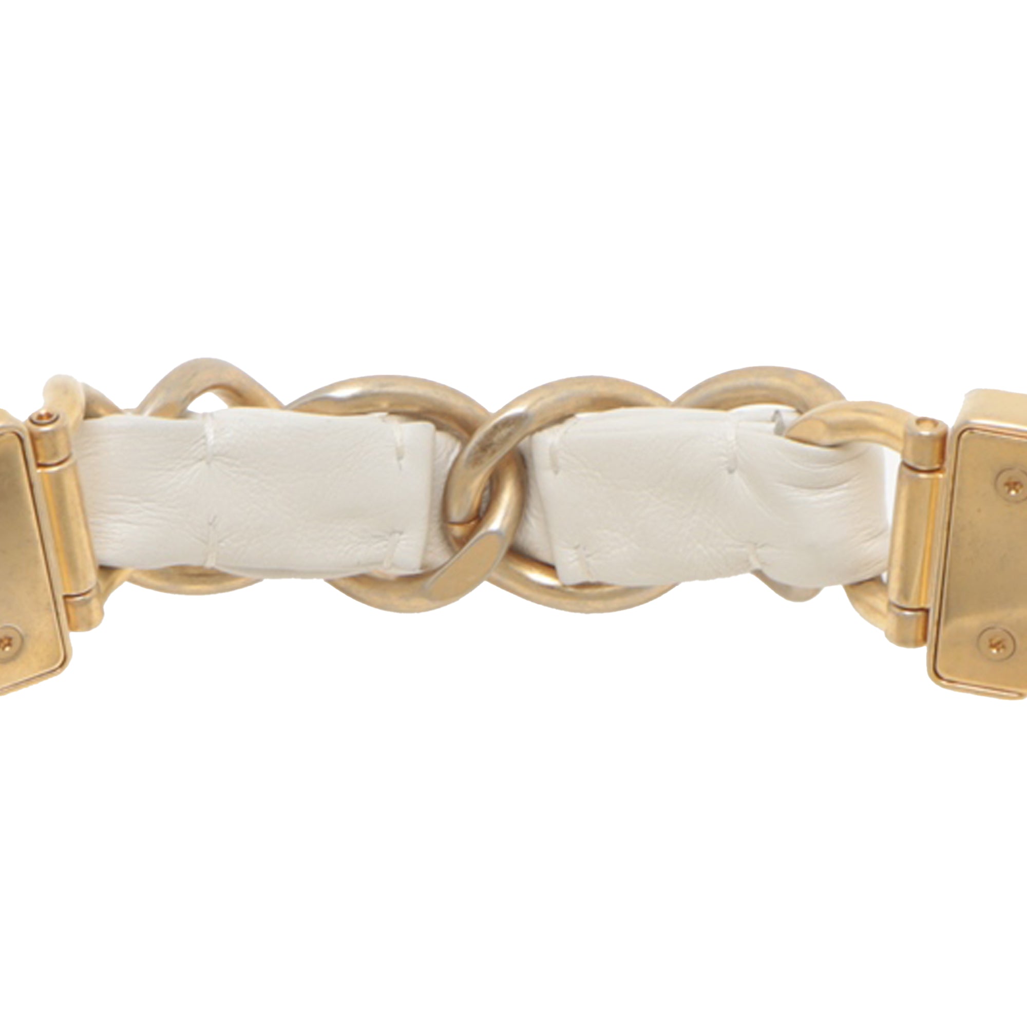 This handbag features a quilted leather body, a leather-woven chain handle, a top zip closure, exterior slip pockets with snap button closure, and an interior slip pocket. Retail Price: 4260.00