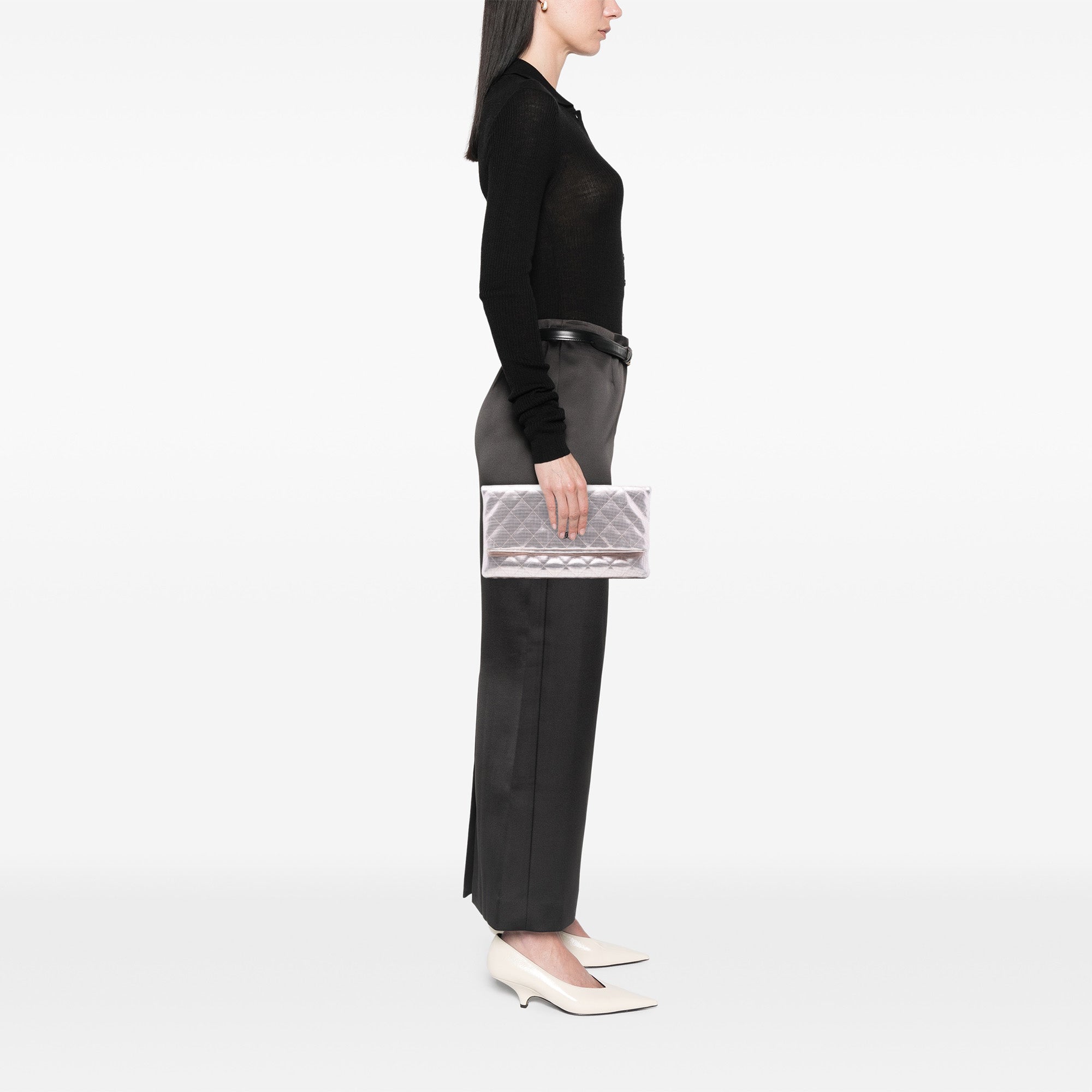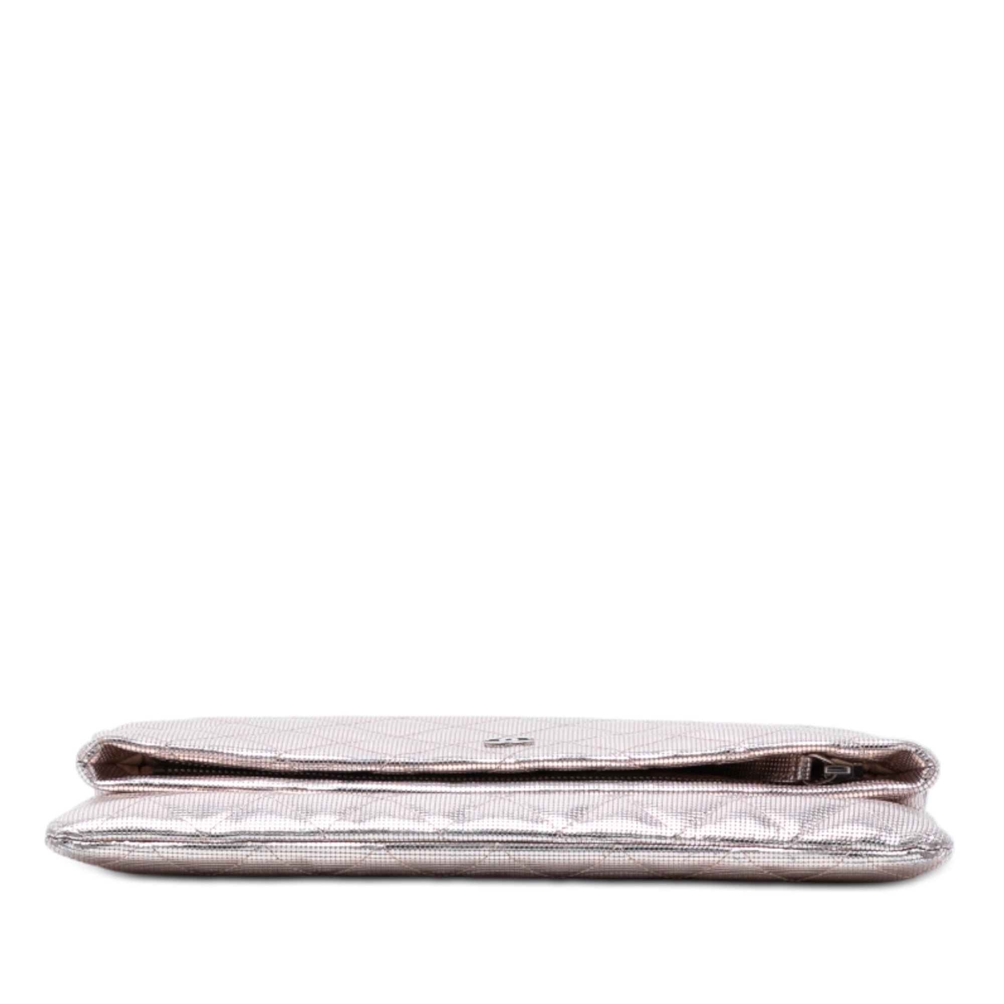This clutch bag features a quilted metallic leather body, a fold-over flap with snap button closure and a top zip closure, and an interior slip pocket. Inclusion: authenticity card. Retail Price: 3500.00