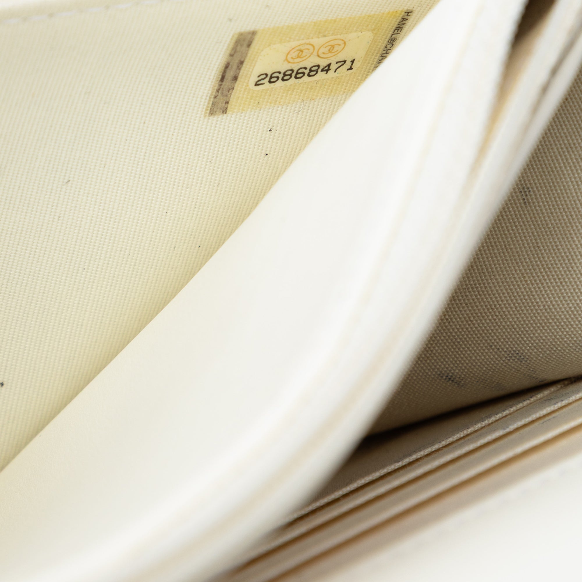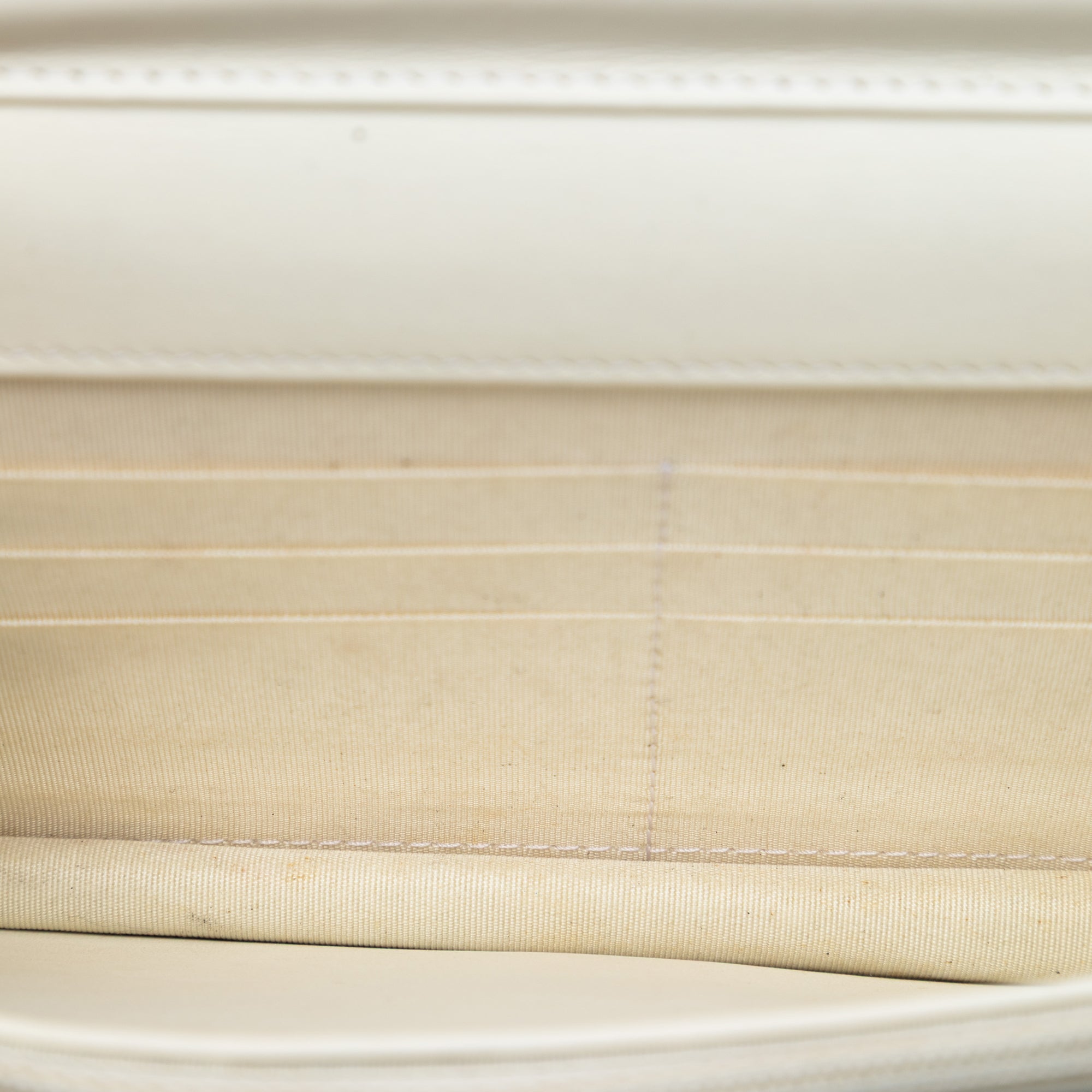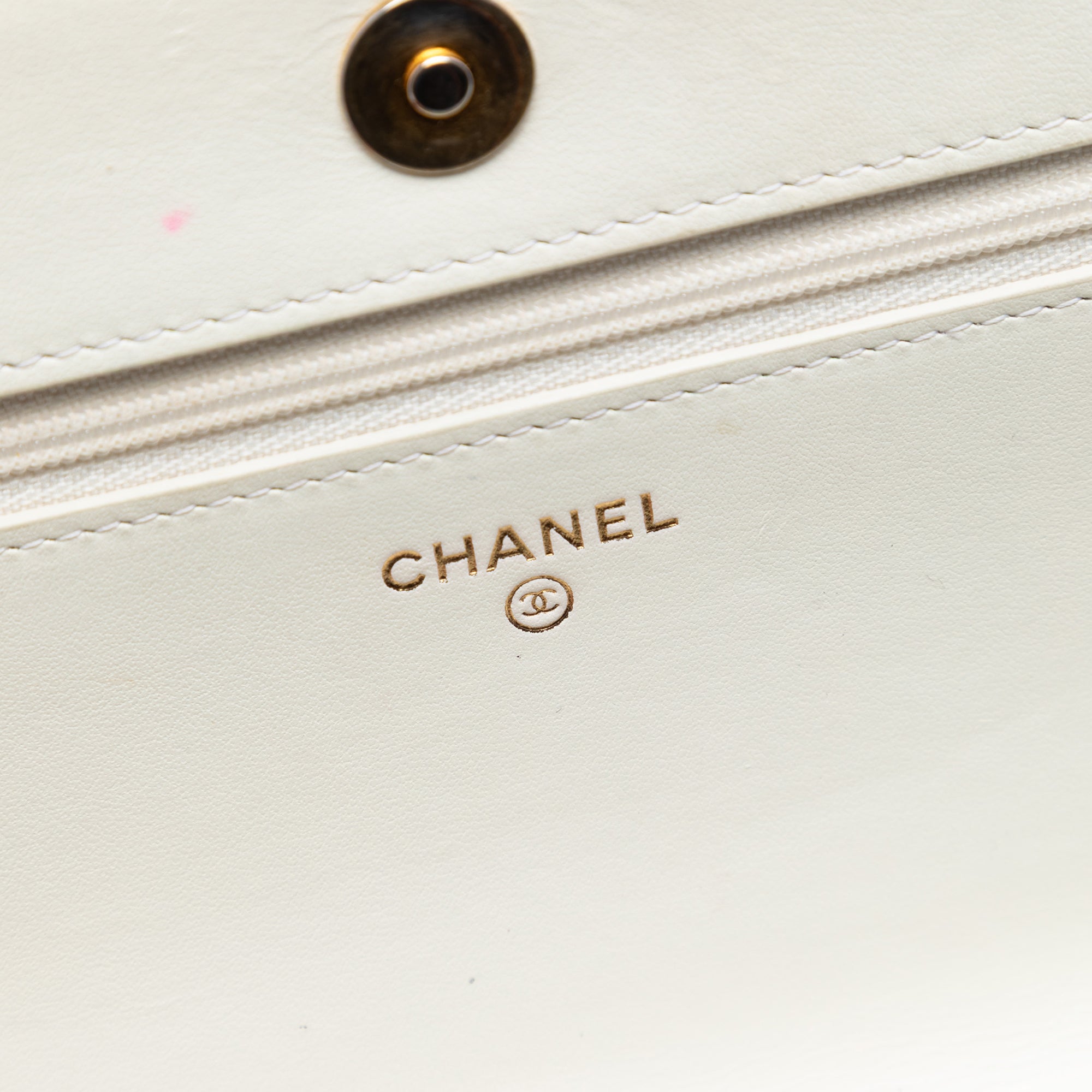 This wallet on chain features a quilted caviar body, a gold-tone curb chain link strap with leather guard, a front flap with push lock closure, and interior zip and slip pockets. Retail Price: 3425.00