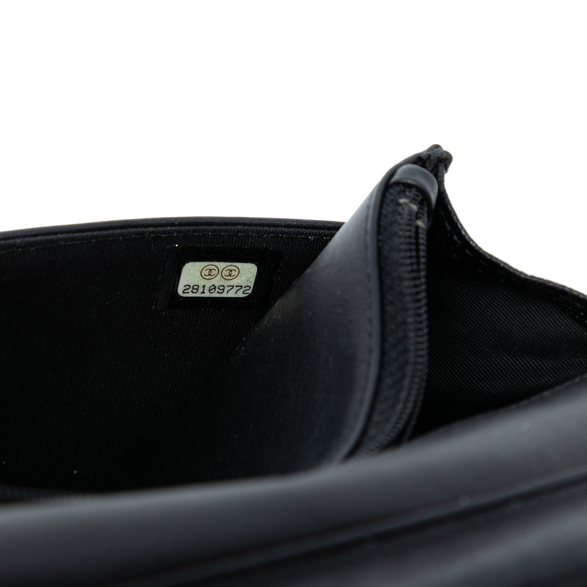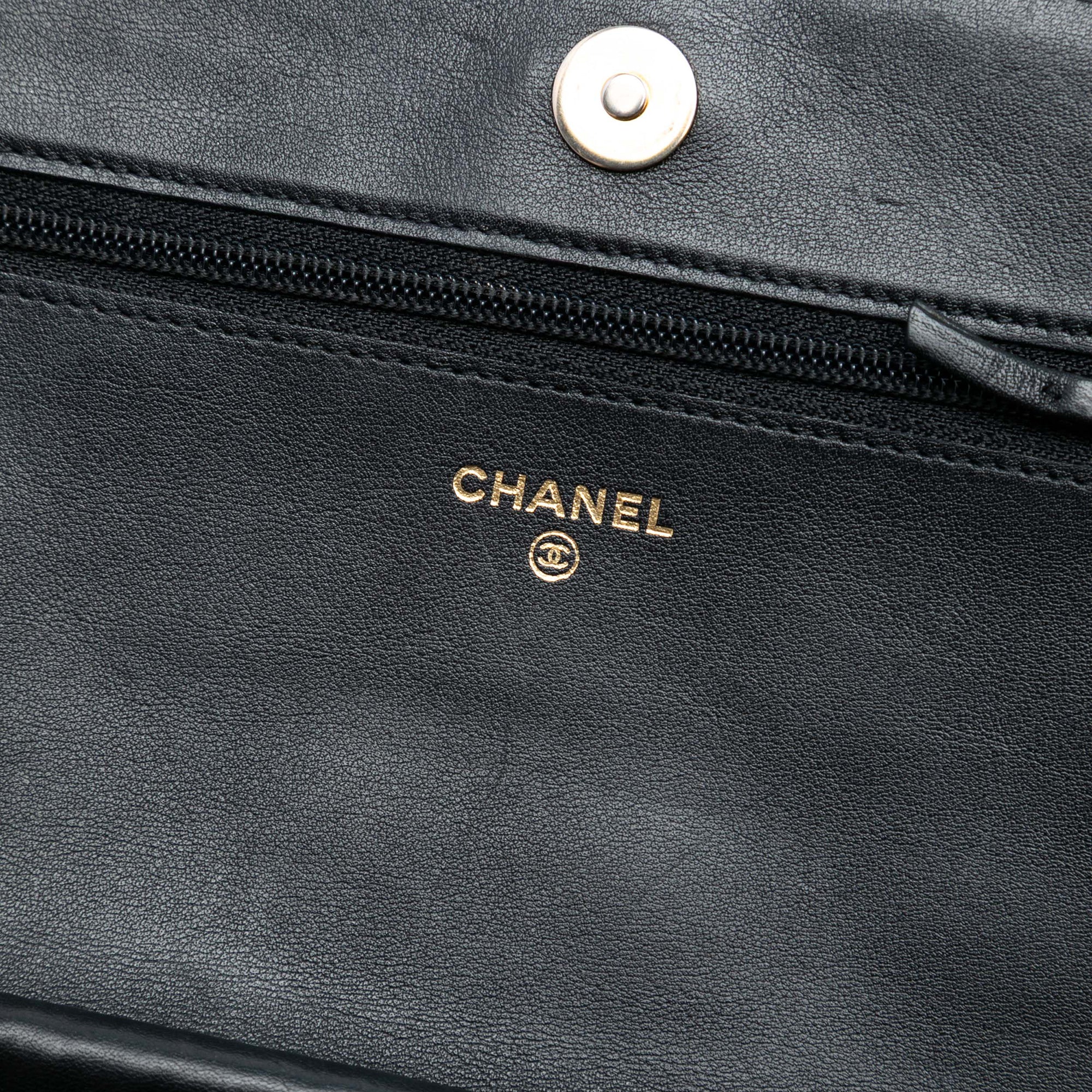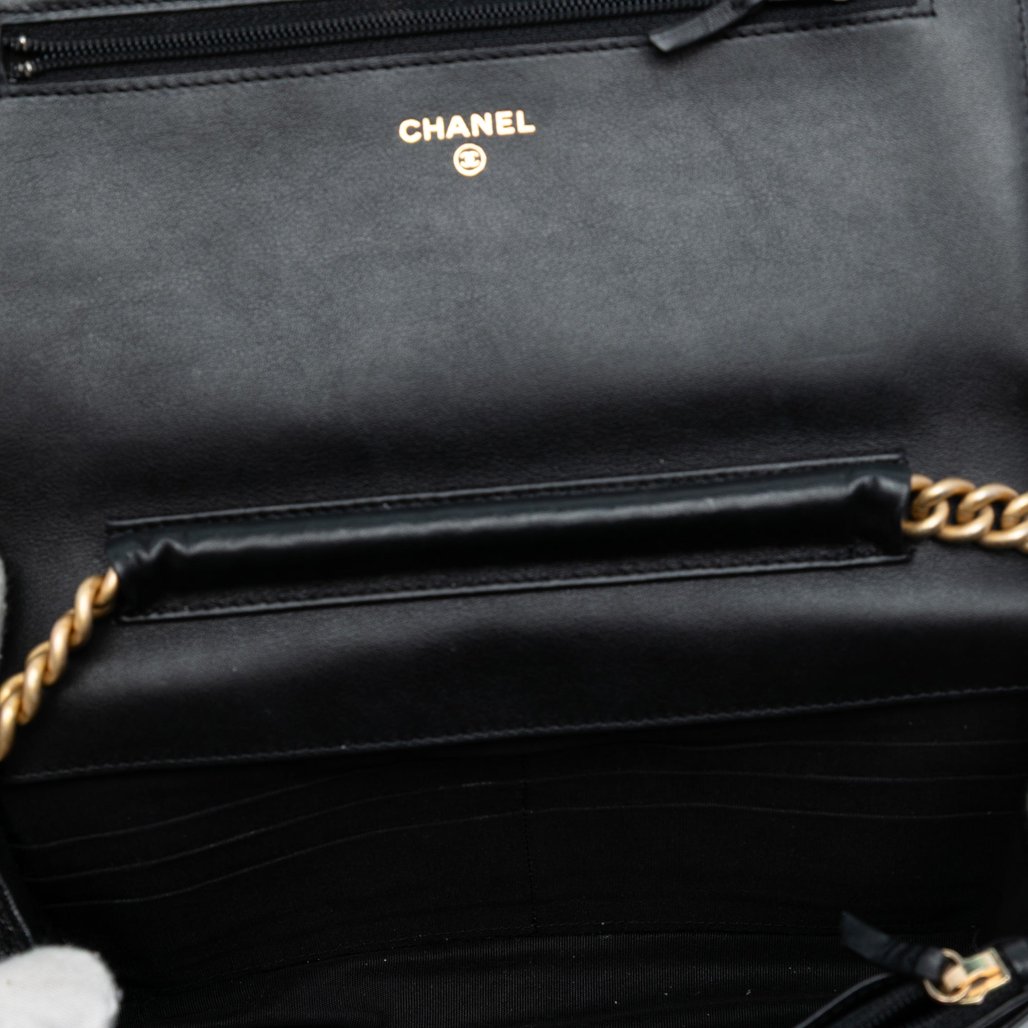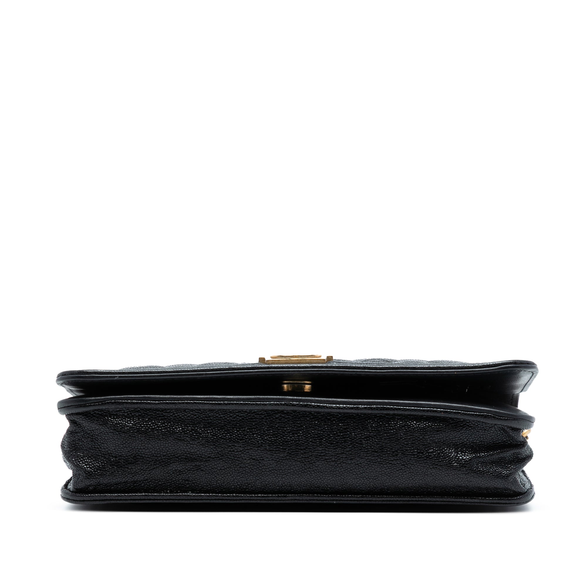The Boy wallet on chain features a quilted caviar leather body, a chain link strap with leather guard, front flap with magnetic snap closure, and interior zip and slip pockets. Retail Price: 2890.00