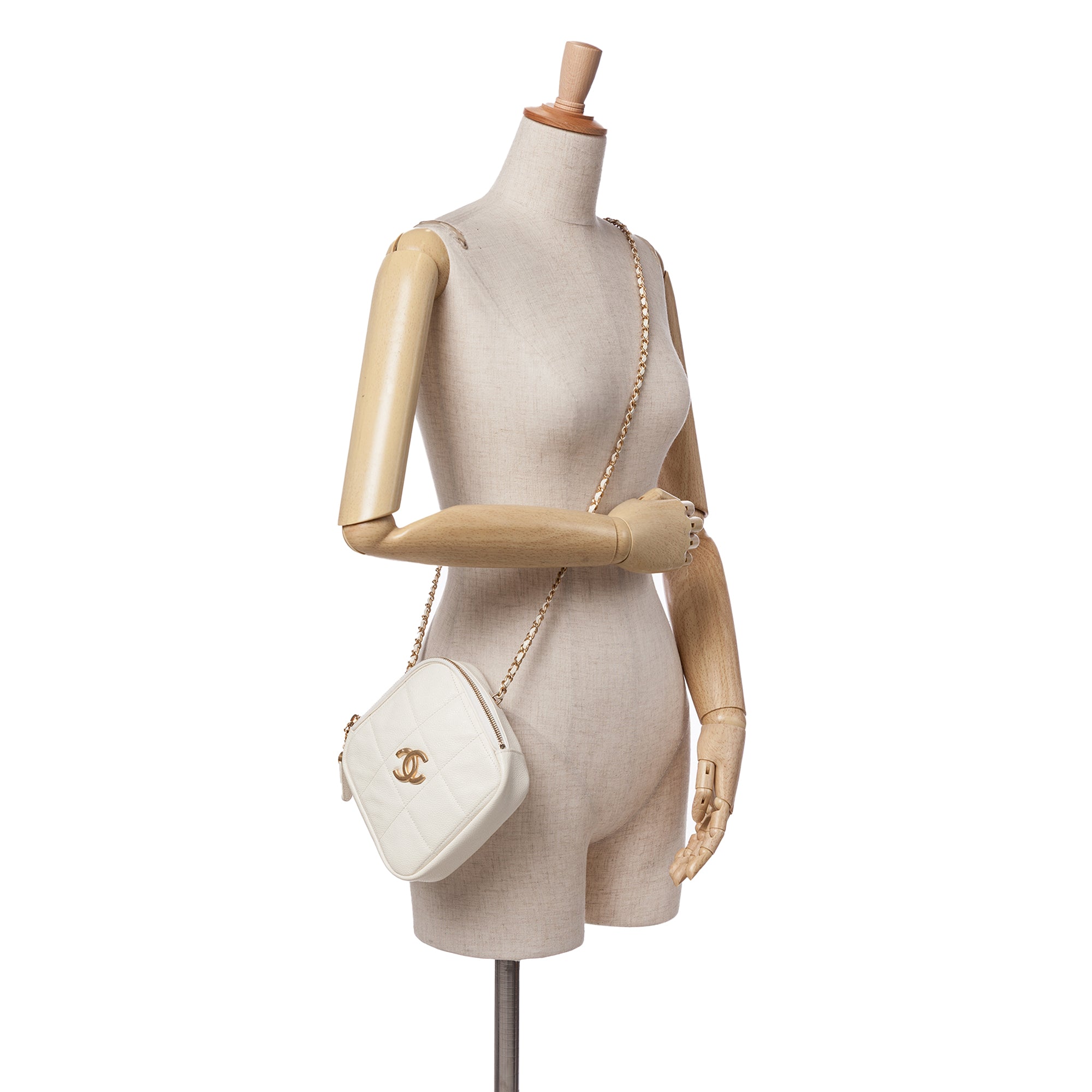 This crossbody bag features a quilted caviar leather body, a leather woven chain shoulder strap, a top zip closure, and an interior slip pocket. Inclusion: authenticity card. Retail Price: 3000.00