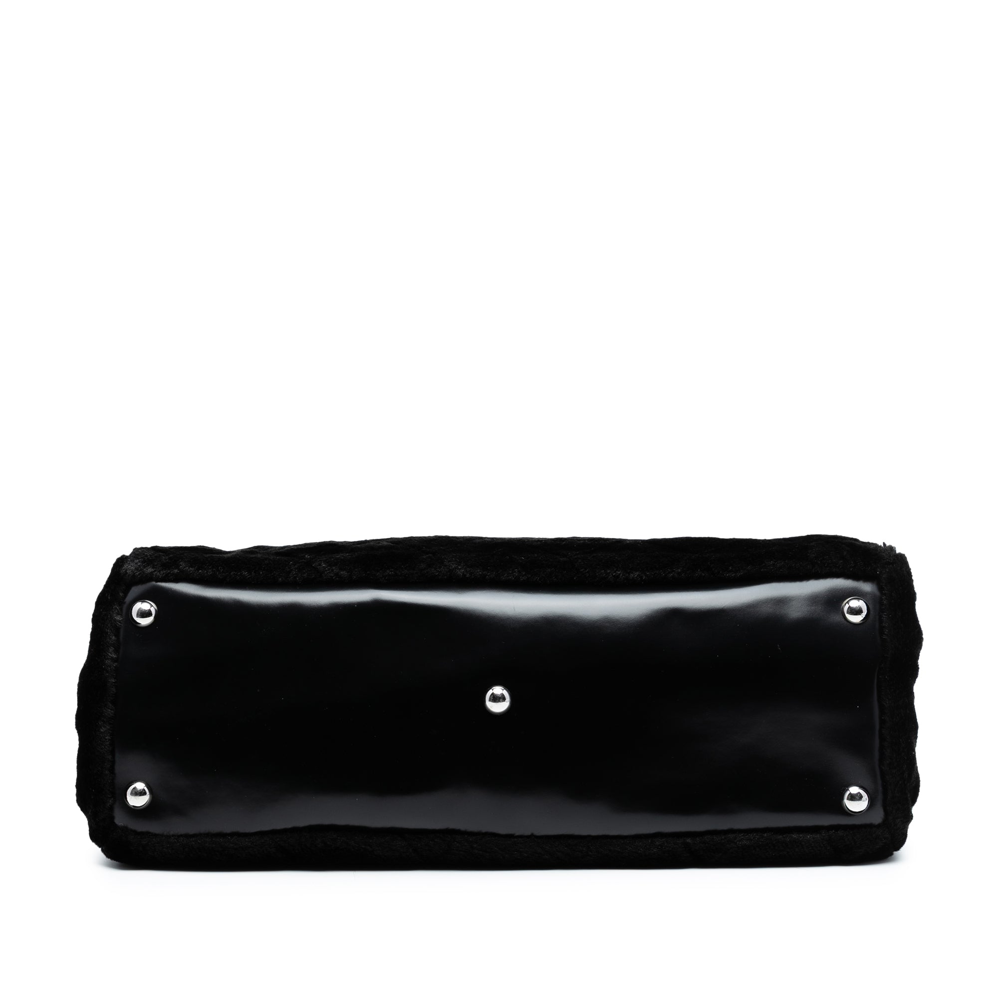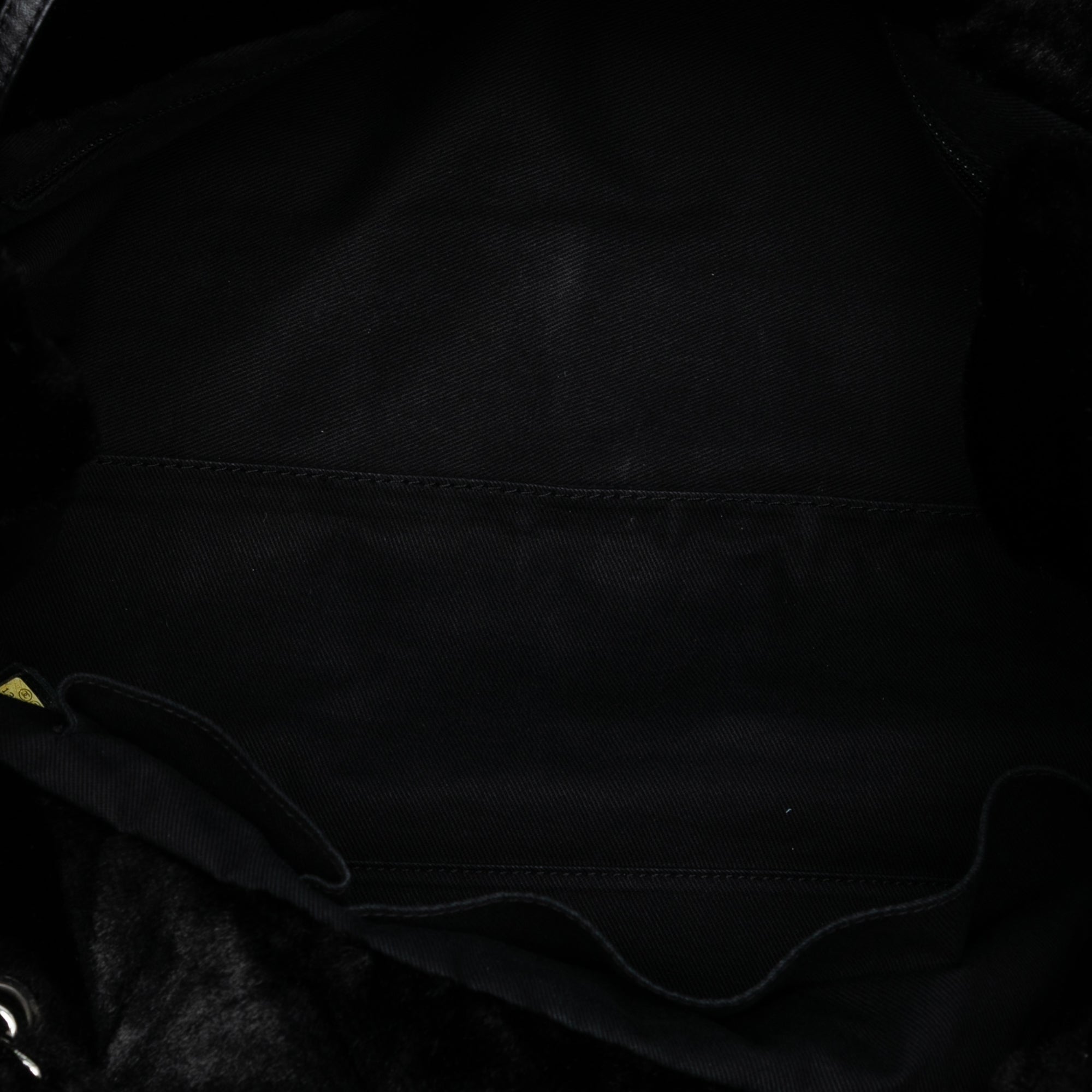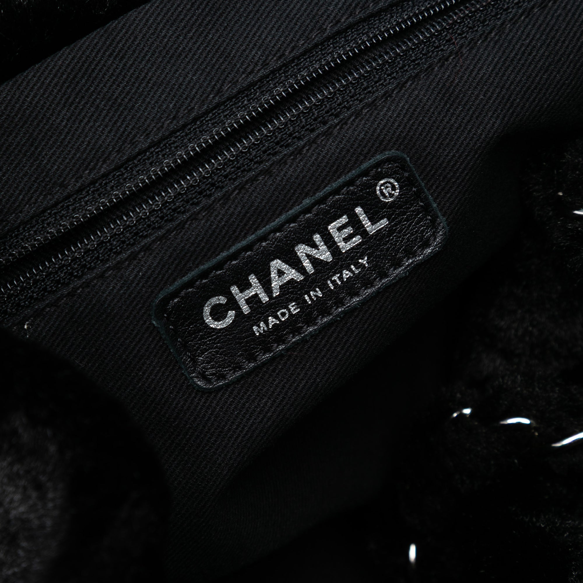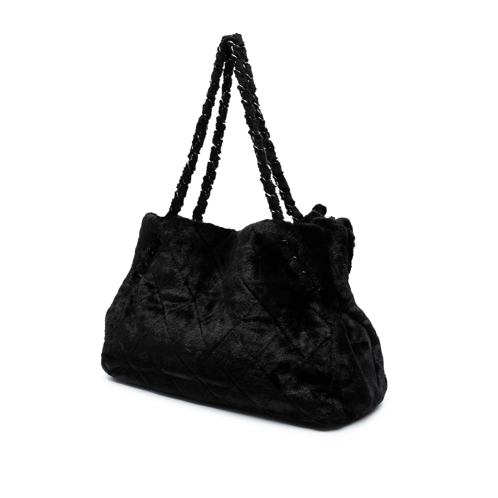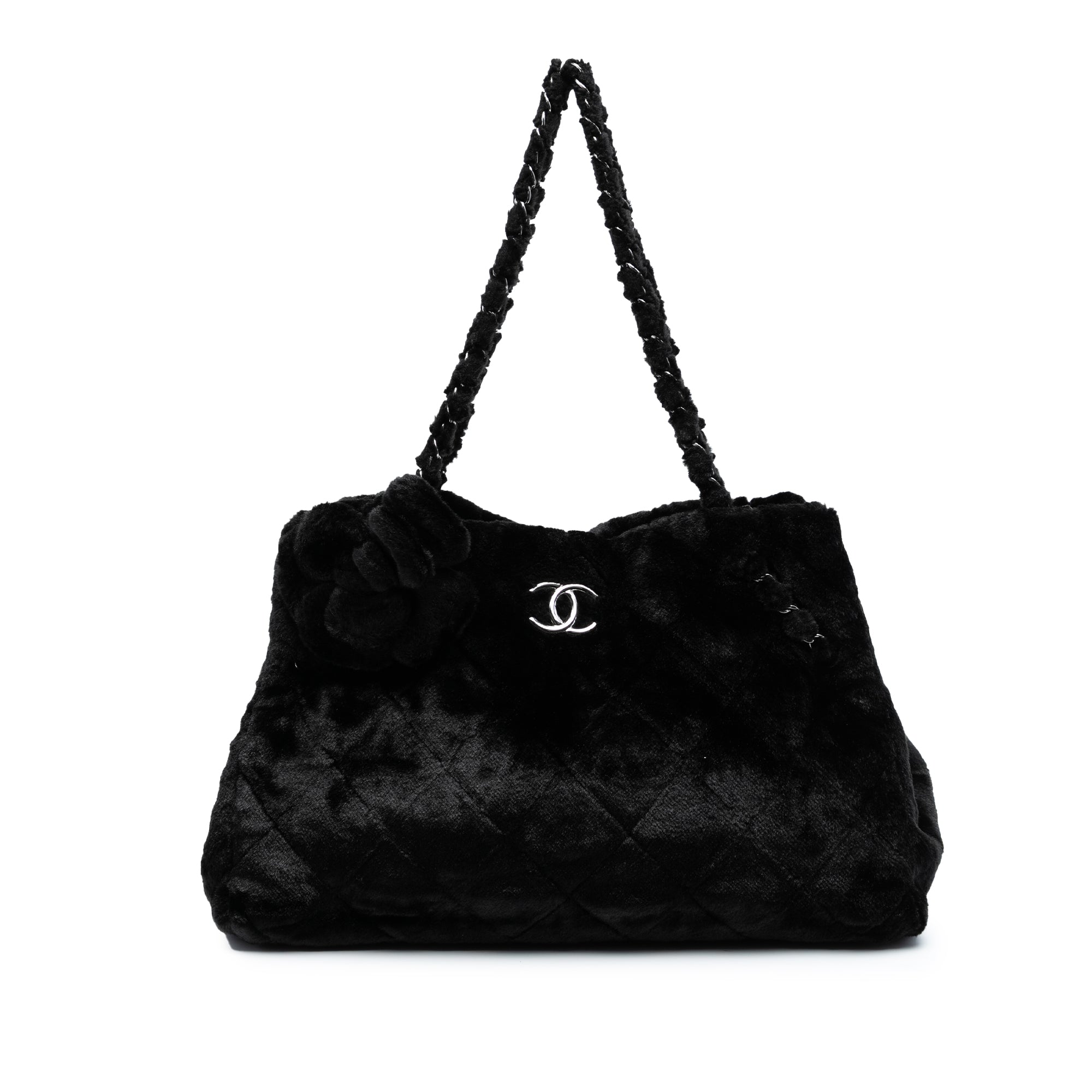 The Fantasy Camellia Tote features a faux fur body, faux fur woven chain straps, an open top with magnetic snap closure, and interior zip and slip pockets. Retail Price: 2500.00