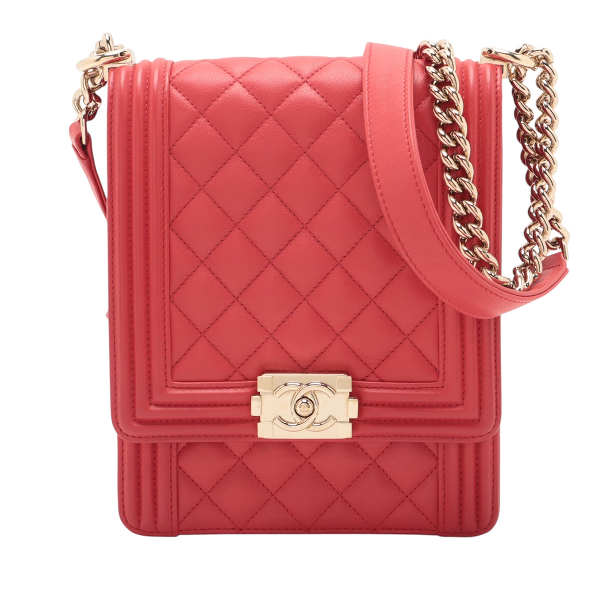The North South Boy Flap features a lambskin leather body, a curb chain strap with leather shoulder guard, a front flap with a CC push-lock closure, and an interior slip pocket. Inclusion: authenticity card. Retail Price: 5500.00