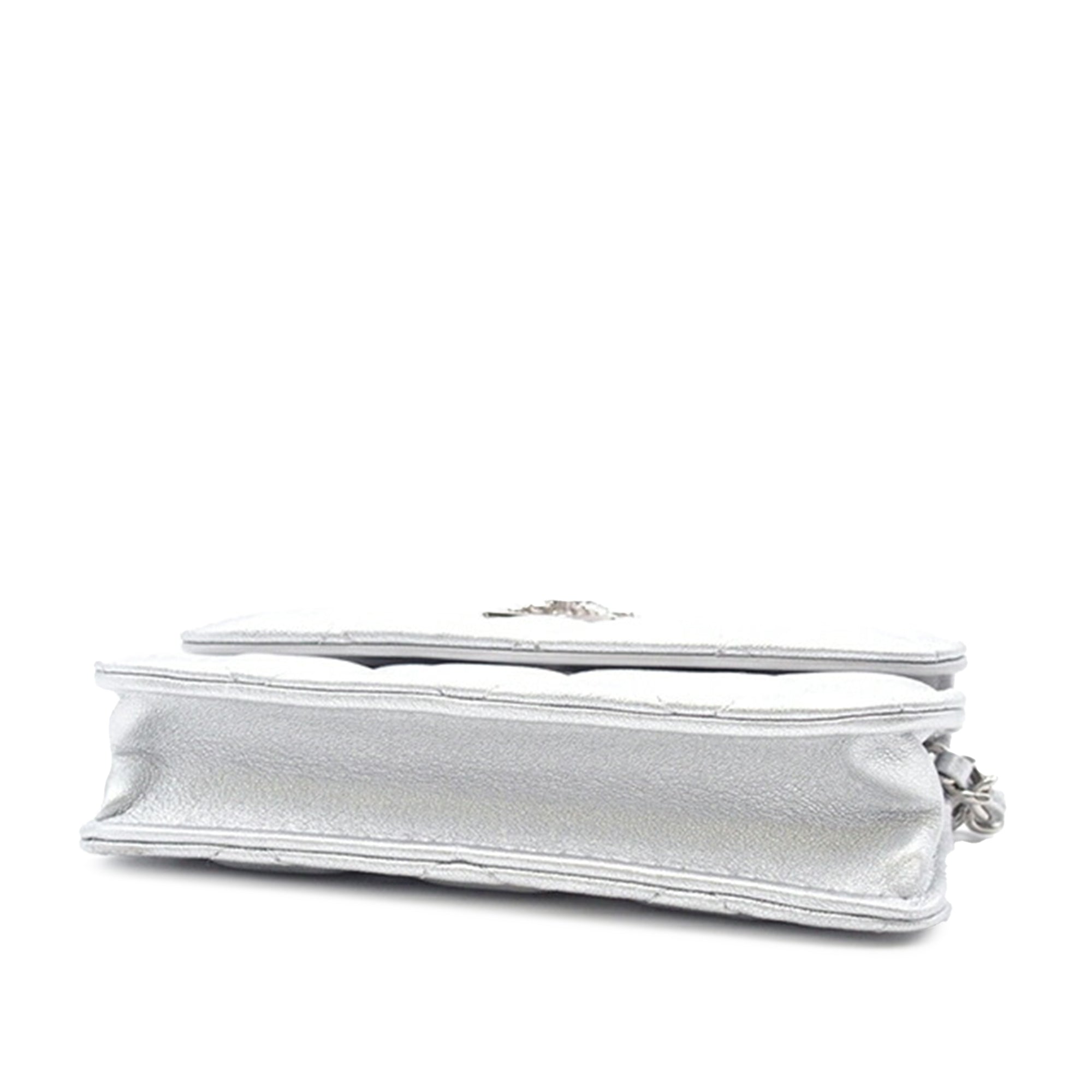 This shoulder bag features a quilted metallic lambskin leather body, a leather woven chain waist strap, and a front flap with magnetic snap closure. Retail Price: 1928.00