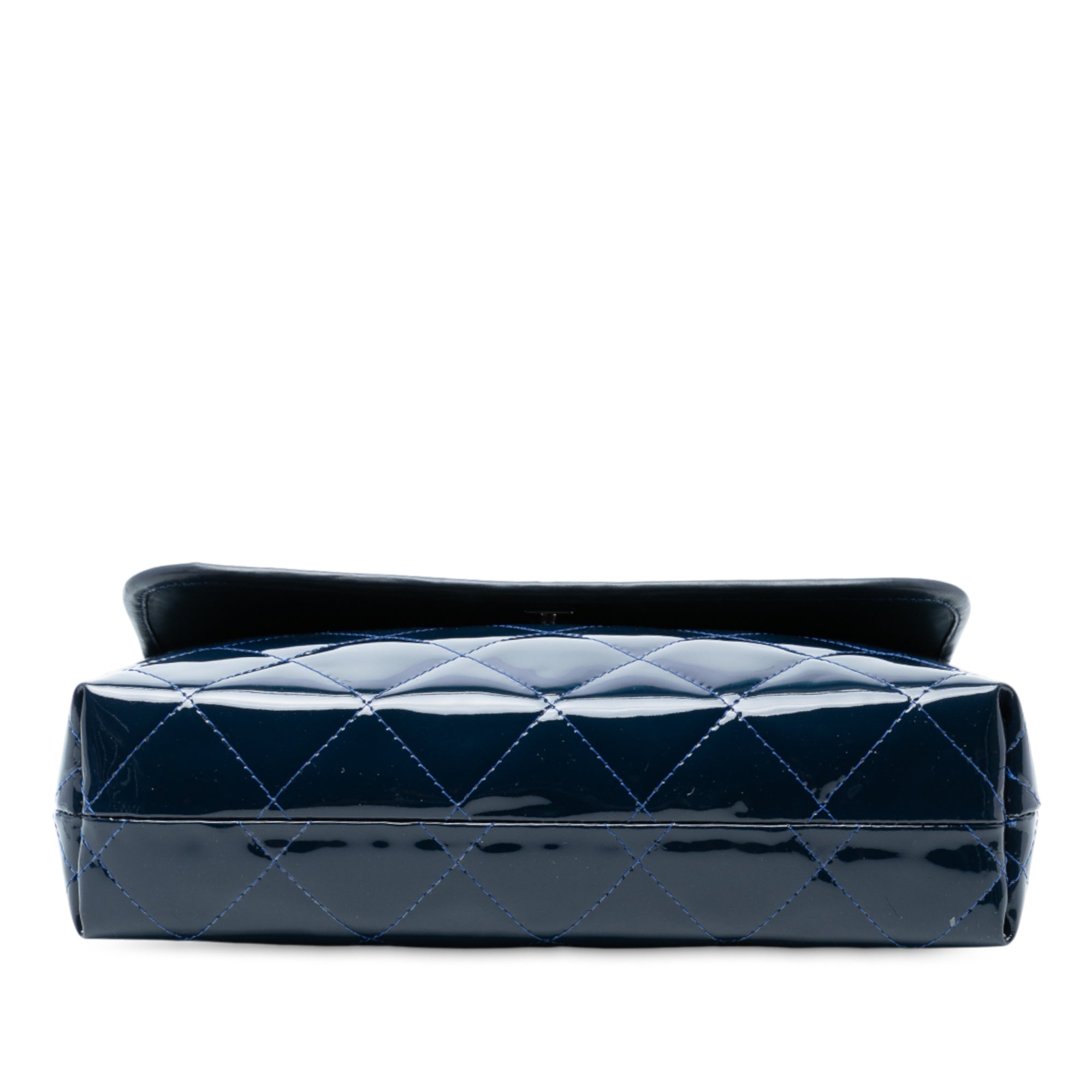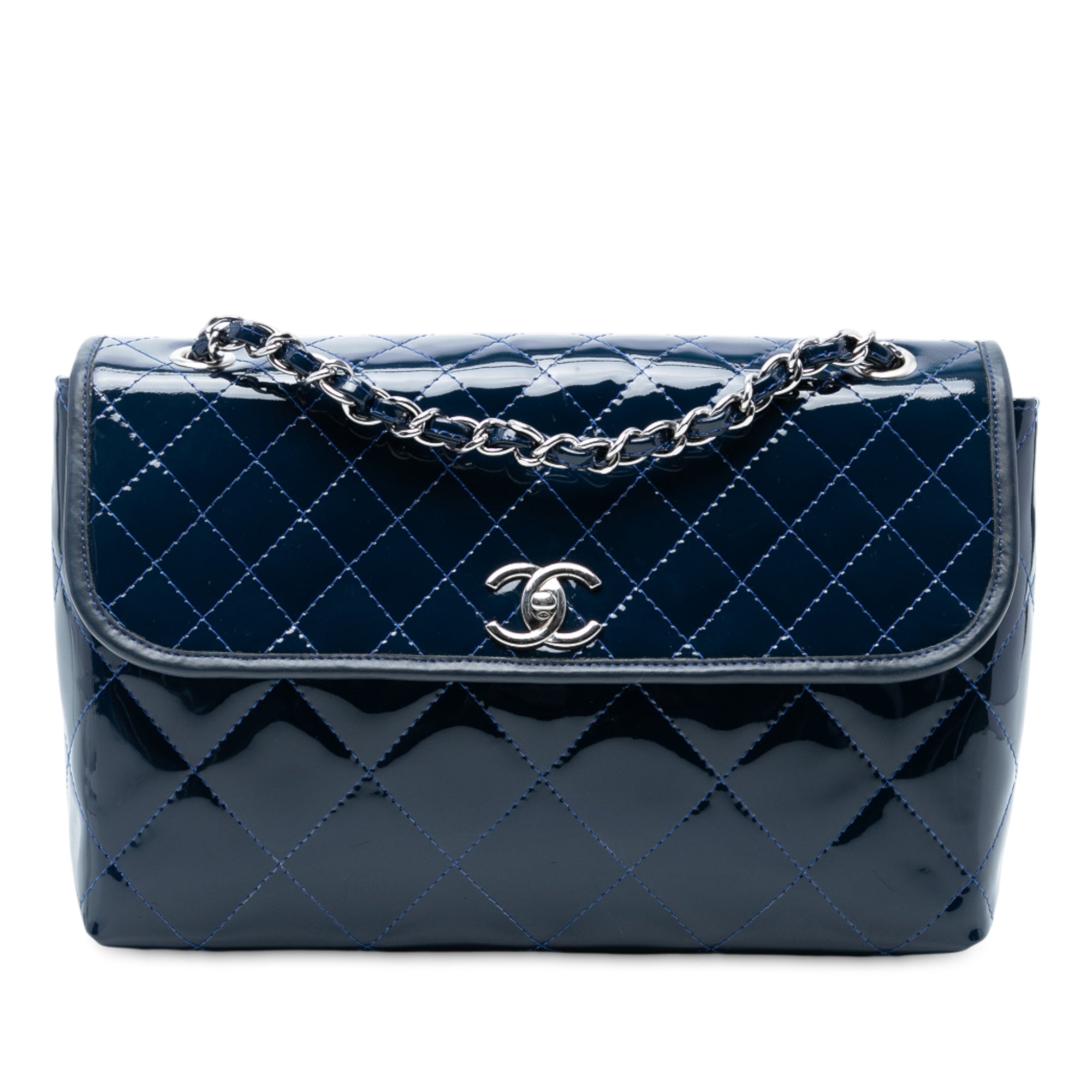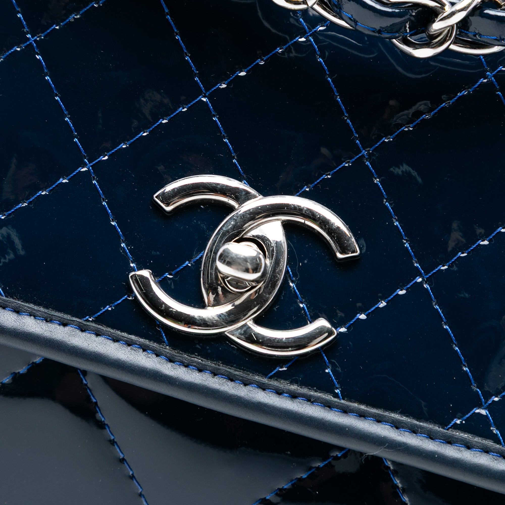 This flap bag features a quilted patent leather body, patent leather woven chain straps, a front flap with a twist lock closure, an exterior back slip pocket, and interior zip and slip pockets. Retail Price: 2769.00