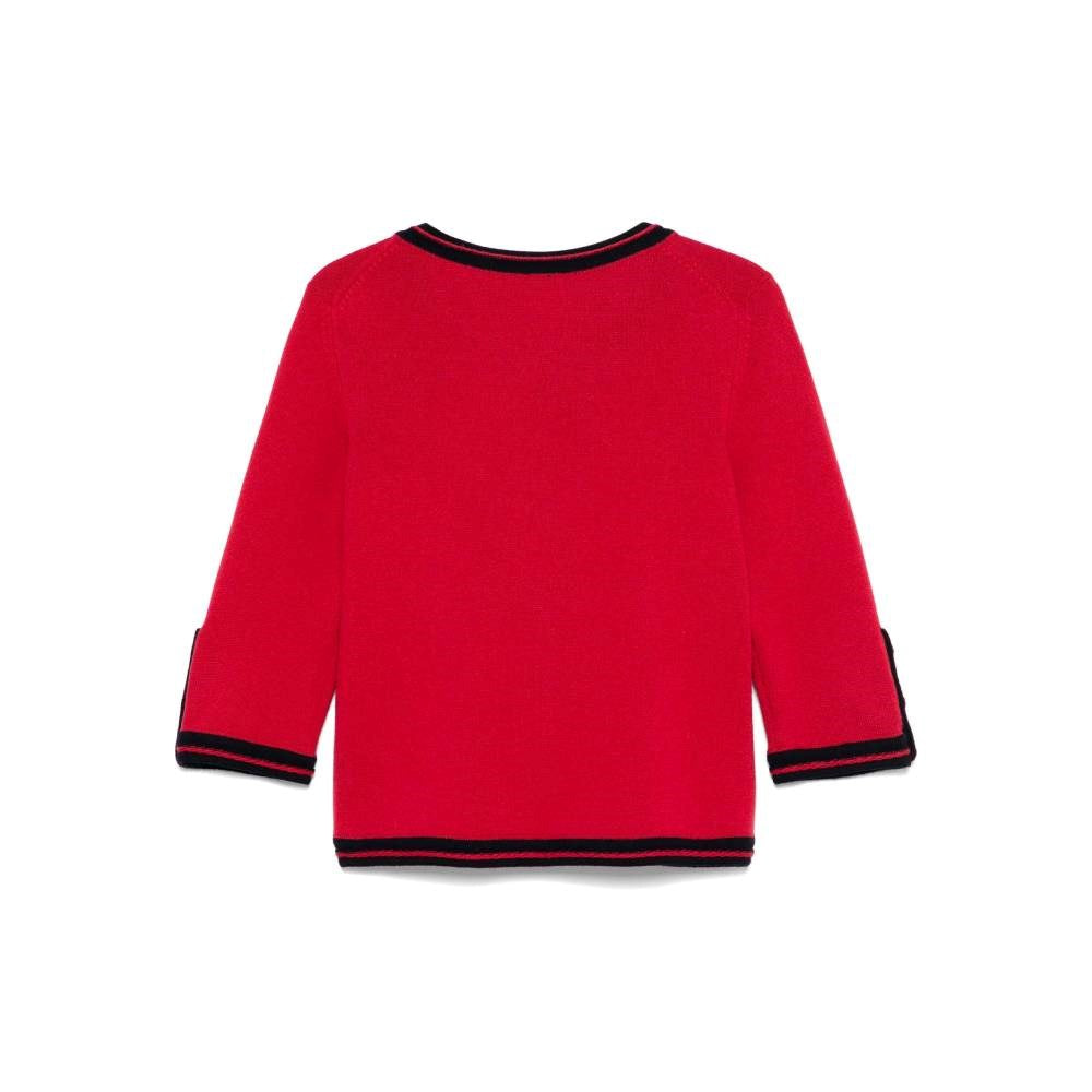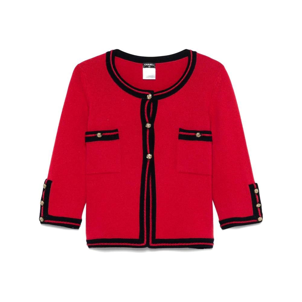 Chanel red cashmere 2010s cardigan with dark blue contrasting hems. Crewneck, embossed buttons fastening, two buttoned patch pockets, three-quarter length sleeves and buttoned cuffs.
