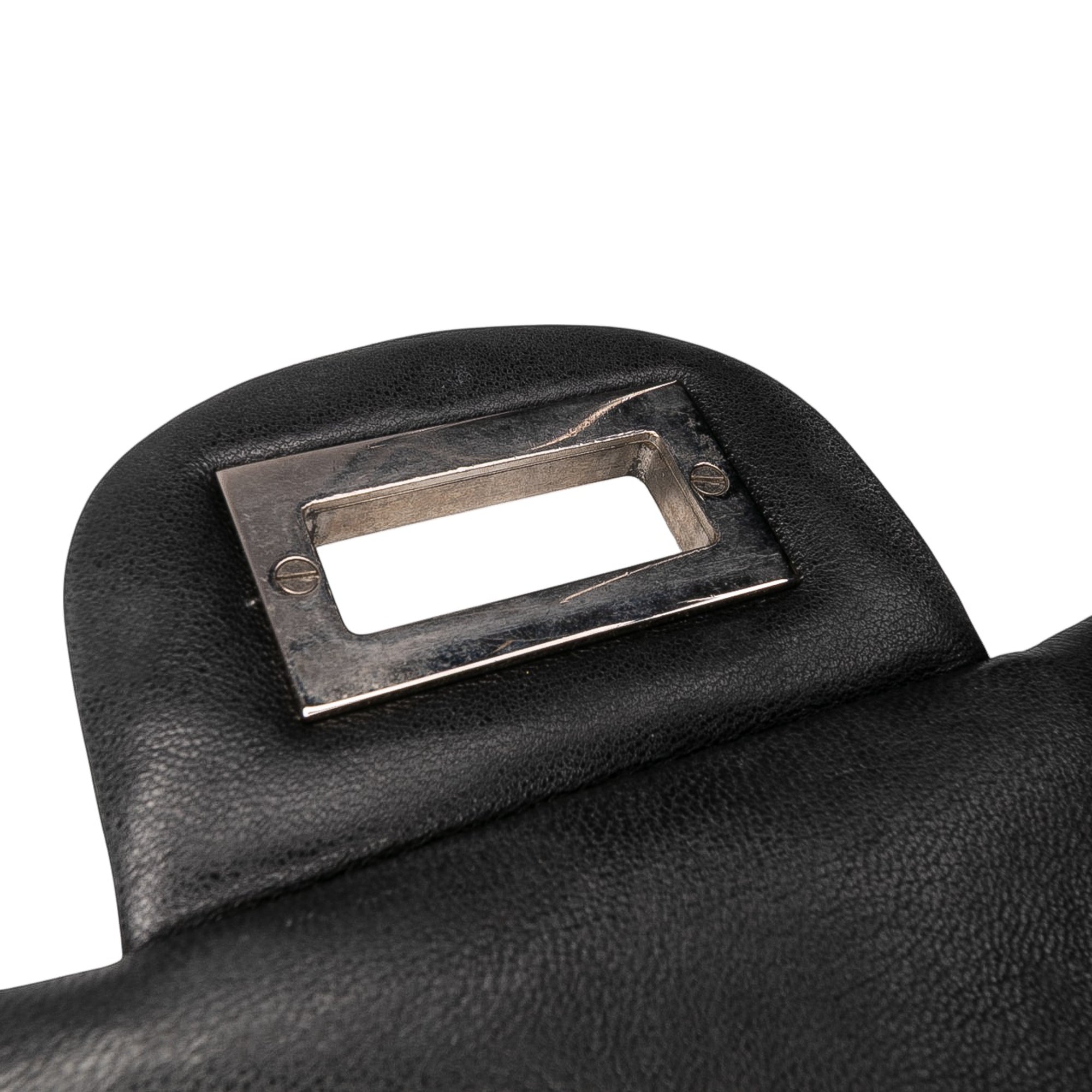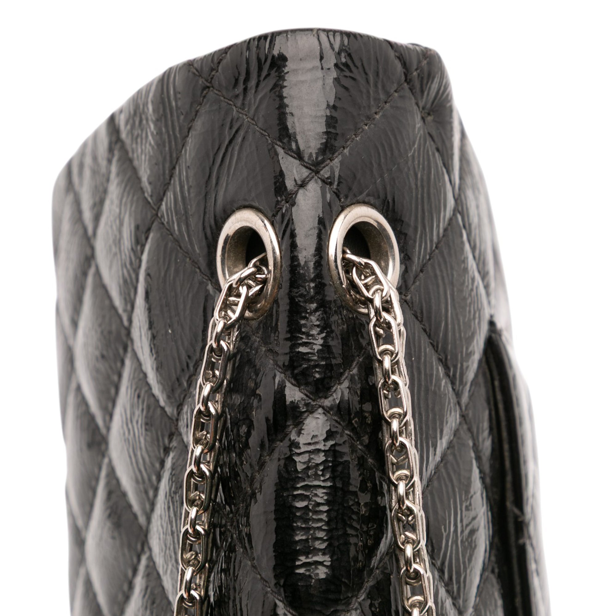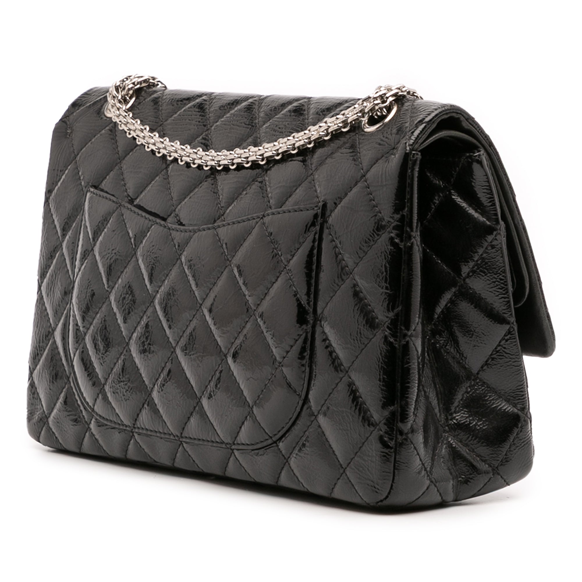 This Reissue Double Flap bag features a patent leather body, silver-tone chain strap, a front flap with twist lock closure, an exterior back slip pocket, and interior zip and slip pockets. Retail Price: 6500.00
