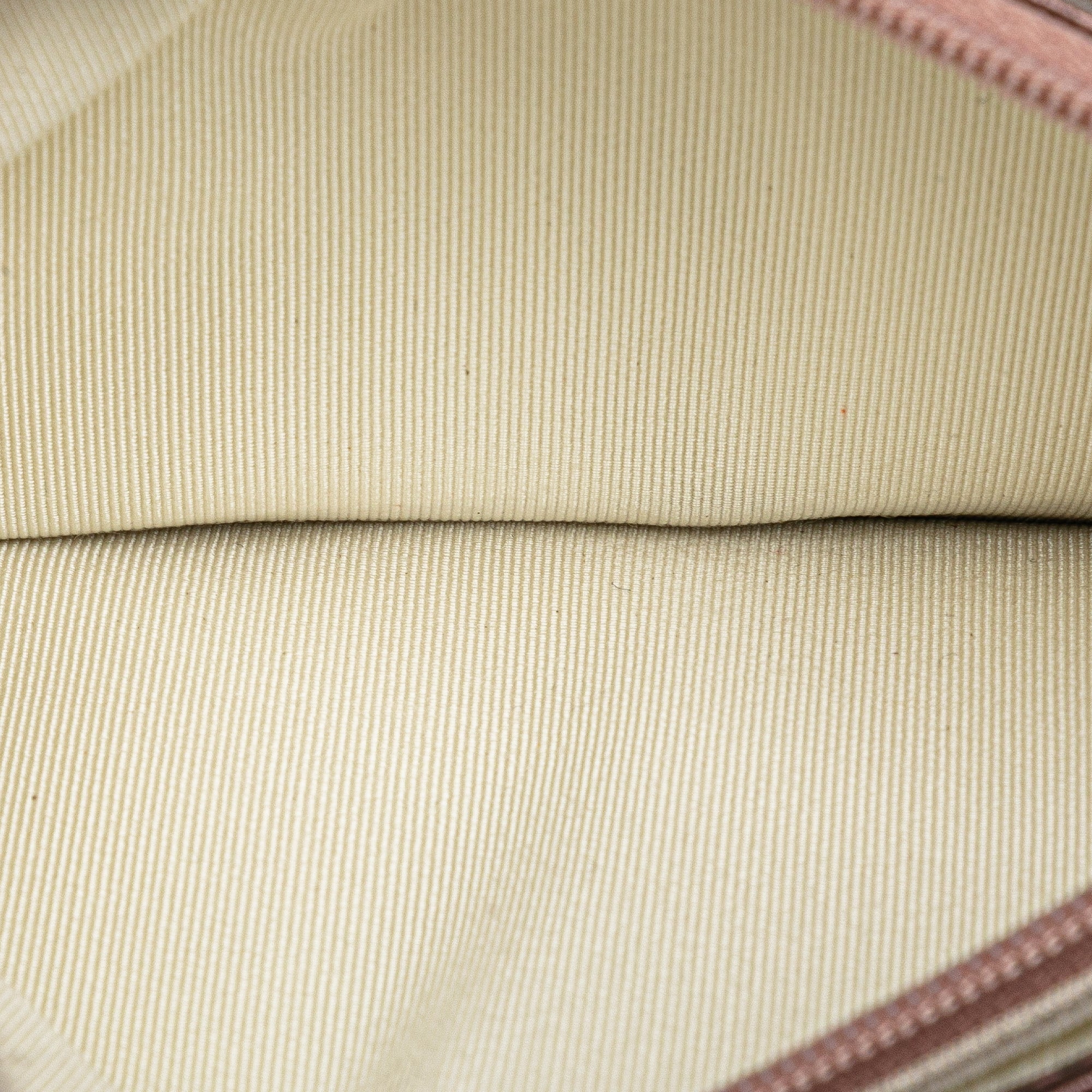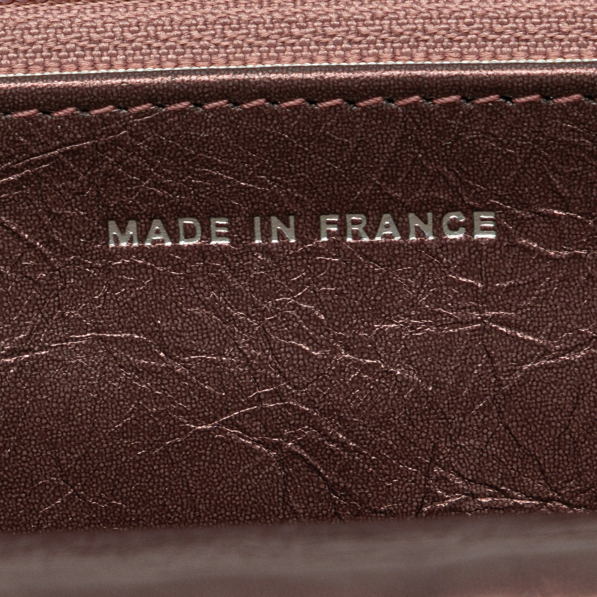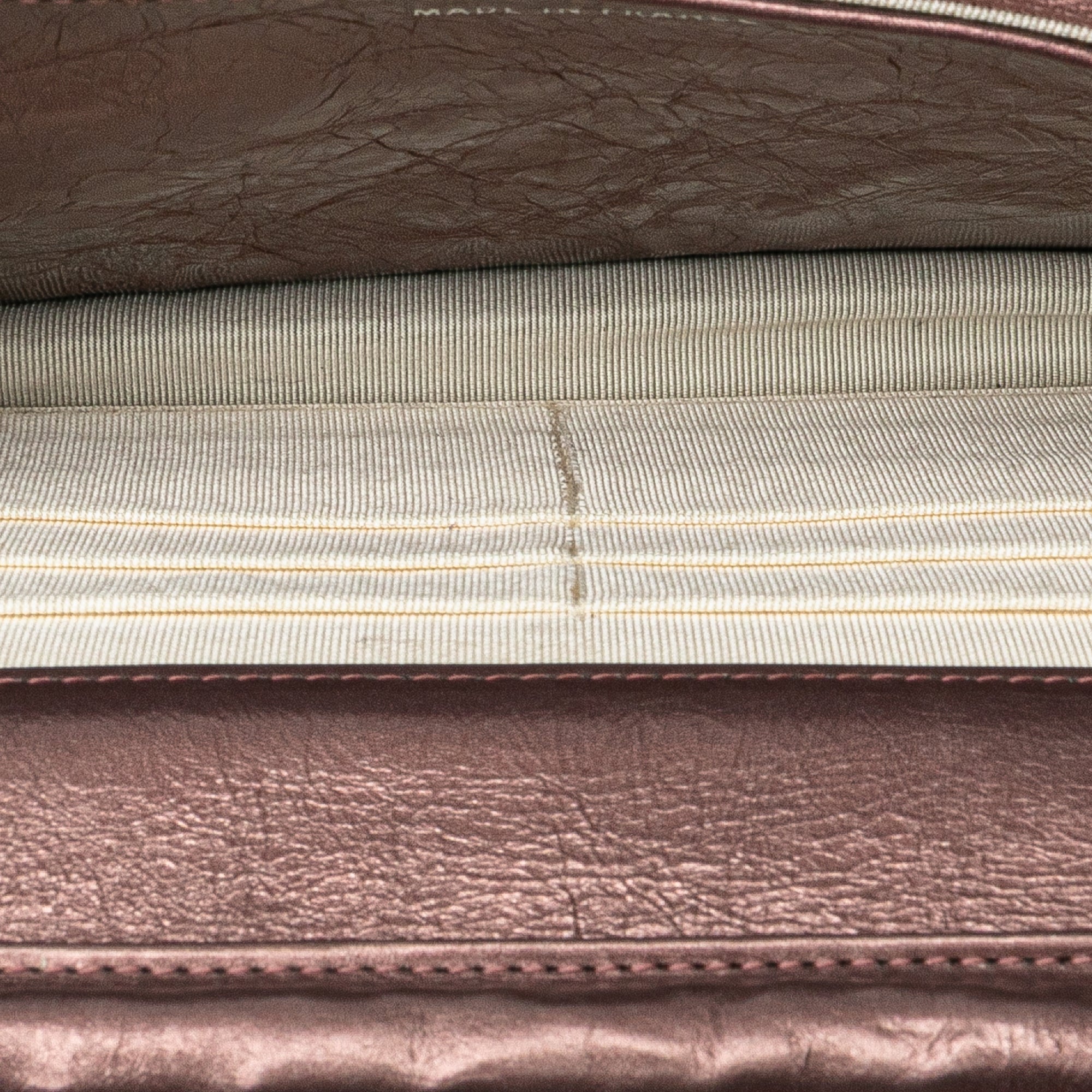 The Metallic 2.55 Reissue Wallet on Chain features quilted aged calfskin leather body, a leather woven chain strap, front single flap with a metal twist lock closure, an exterior back slip pocket, an interior zip compartment, and interior card slots. Retail Price: 5000.00