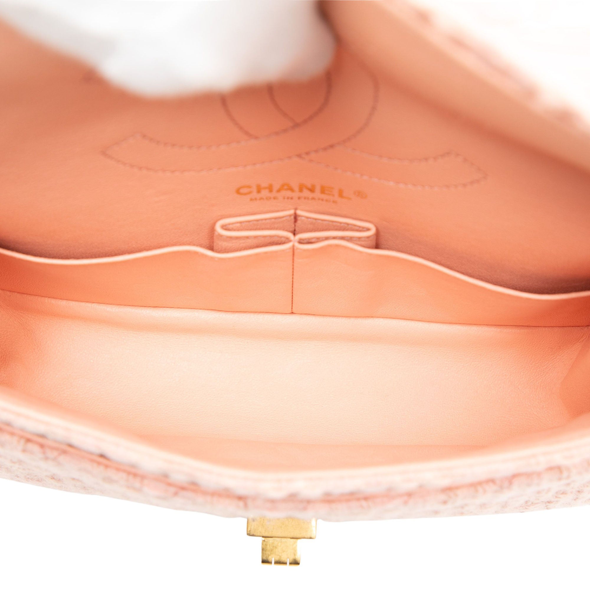 This flap features a tweed body, gold-tone chain straps, a front flap with a twist lock closure, an exterior back slip pocket, and an interior slip pockets. Inclusion: authenticity card. Retail Price: 5400.00