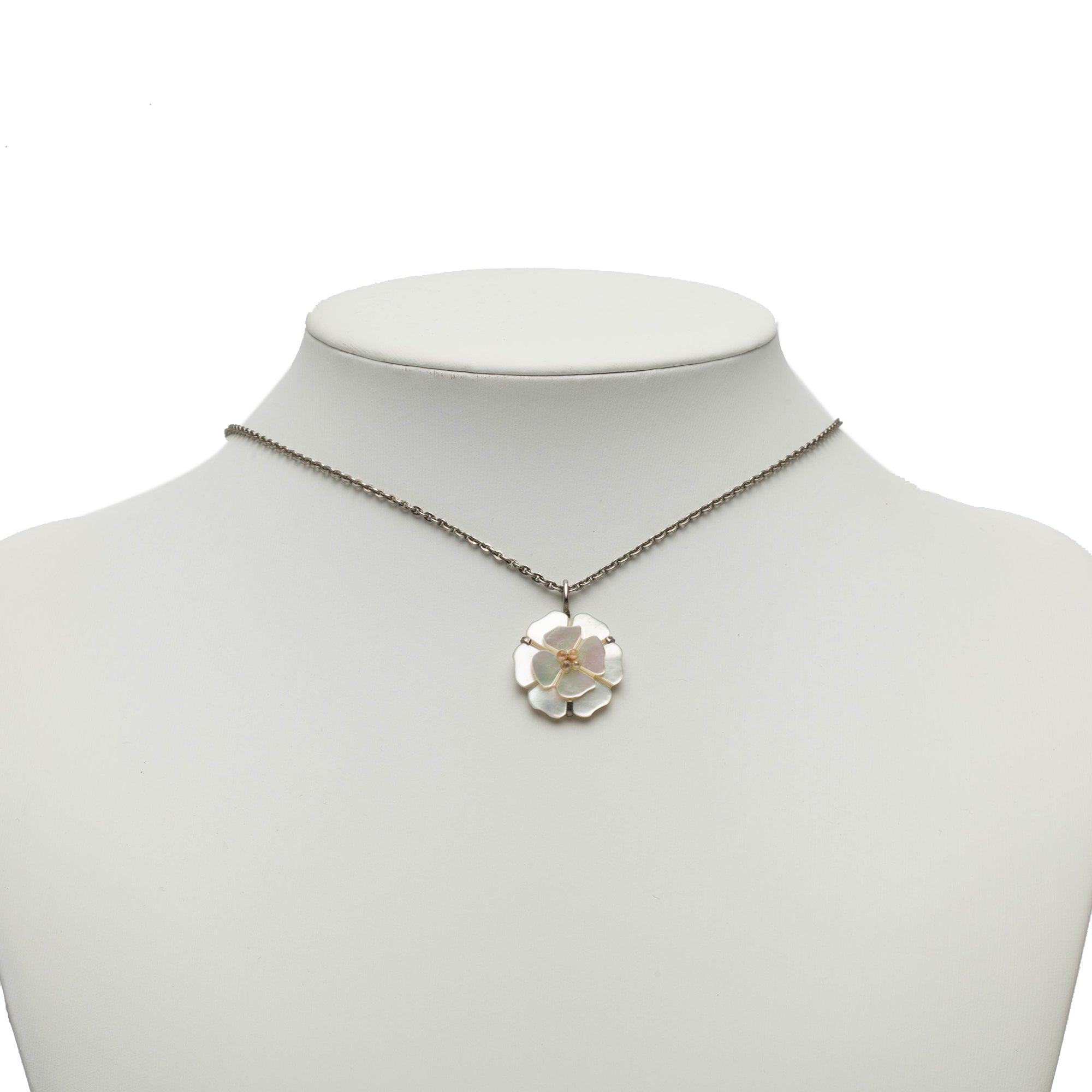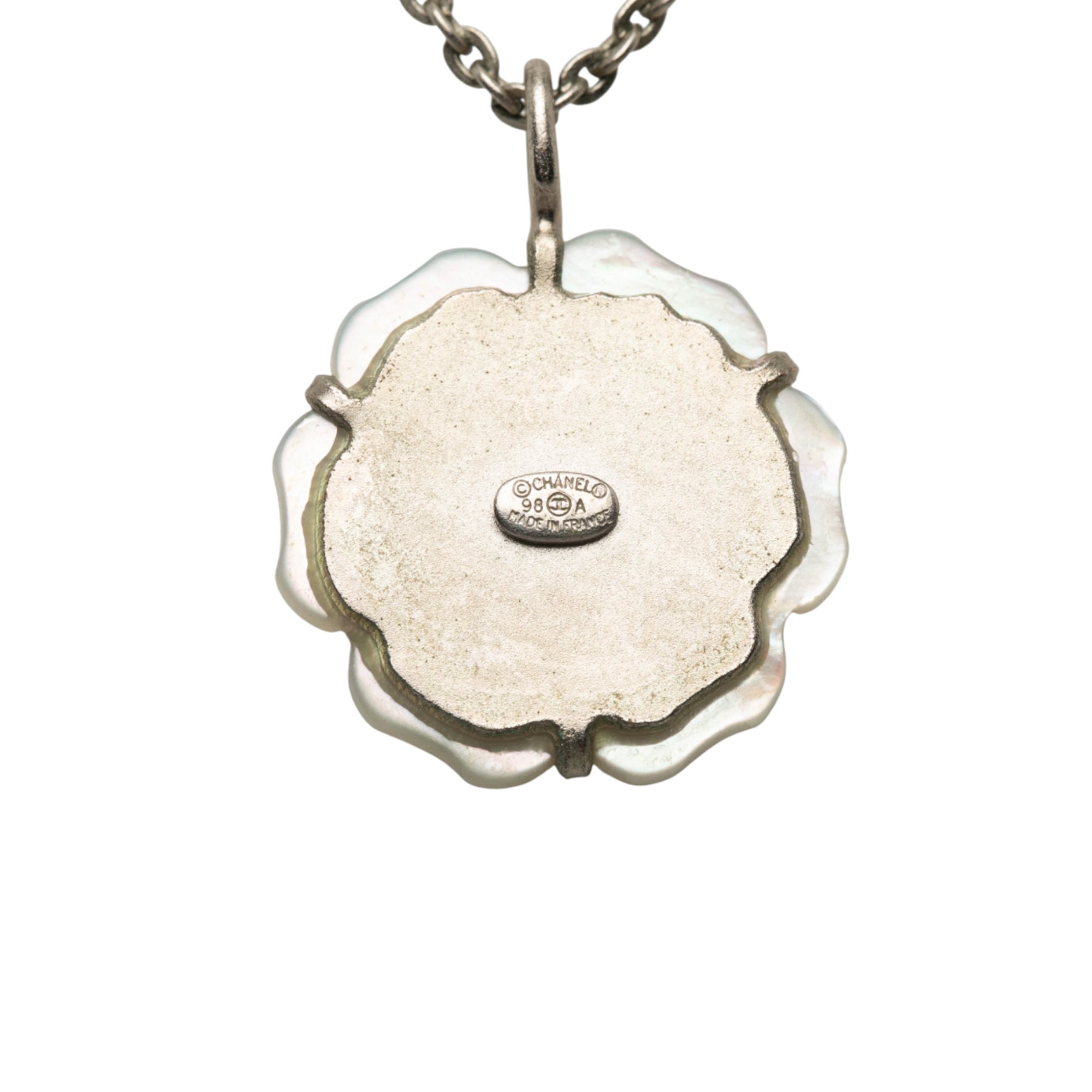 This necklace features a silver-tone chain, a resin shell camellia pendant, and a spring ring closure. Inclusion: box. Retail Price: 850.00